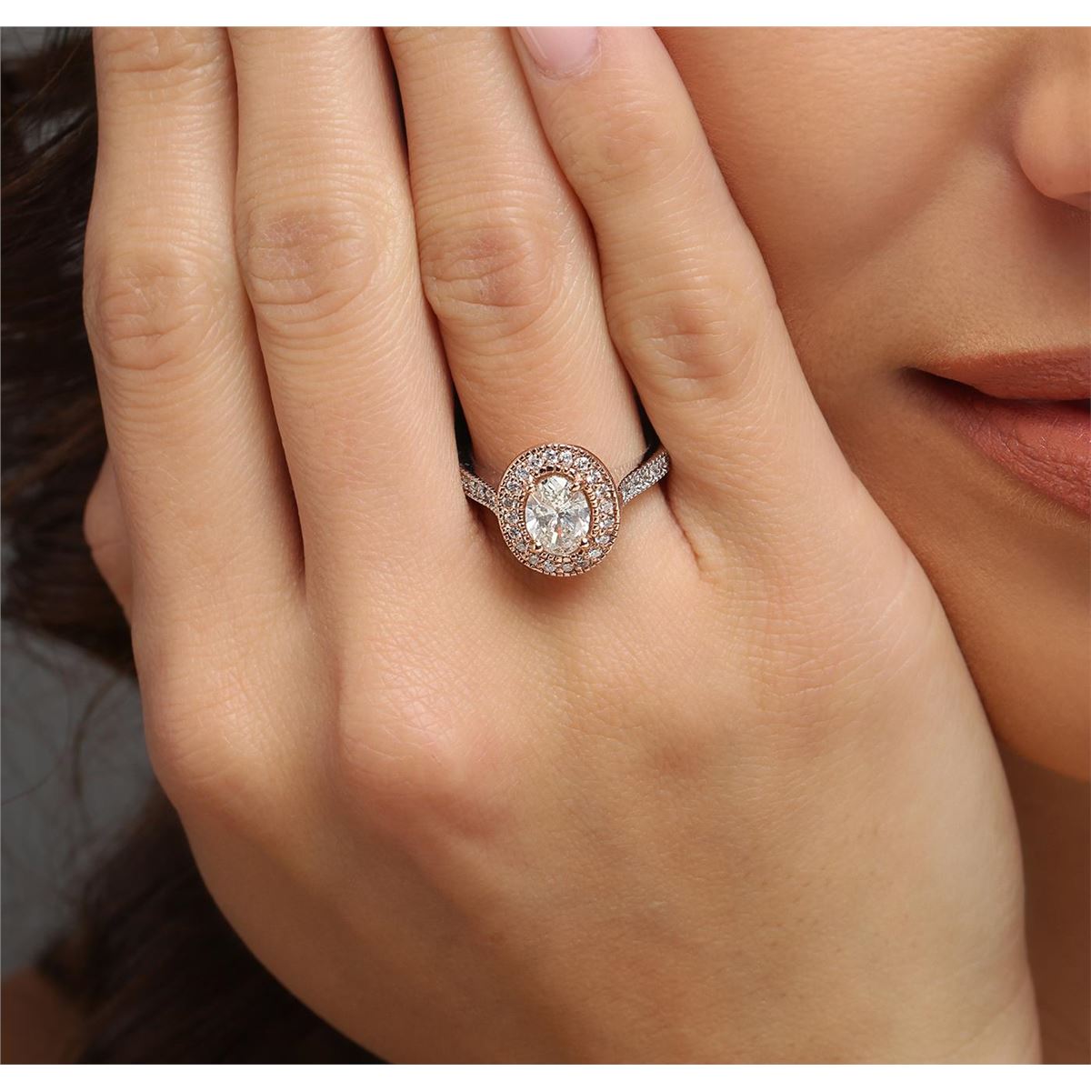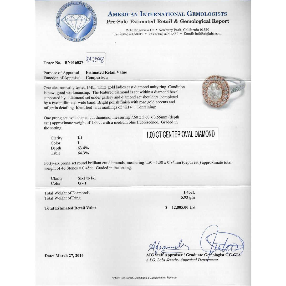 One electronically tested 14KT white gold ladies cast diamond unity ring. Condition is new, good workmanship. The featured diamond is set within a diamond bezel supported by a diamond set under gallery and diamond set shoulders, completed by a two millimeter wide band. Bright polish finish with rose gold accents and milgrain detailing. Identified with markings of K14. Containing: One prong set oval shaped cut diamond, measuring 7.60 x 5.60 x 3.55mm (depth est.) approximate weight of 1.00ct with a medium blue fluorescence. Graded in the setting. Clarity: I-1. Color: I. Depth: 63.4%. Table: 64.3%. Forty-six prong set round brilliant cut diamonds, measuring 1.50 - 1.30 x 0.84mm (depth est.) approximate total weight of 46 stones = 0.45ct. Graded in the setting. Clarity: SI-1 to I-1. Color: G-I. Total Weight of Diamonds 1.45ct. Total Weight of Ring 5.93 grams. AIG Appraised at $12,805.00.