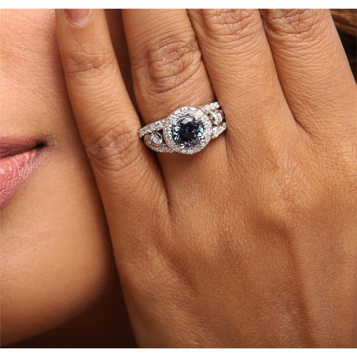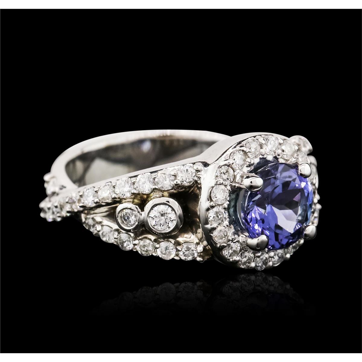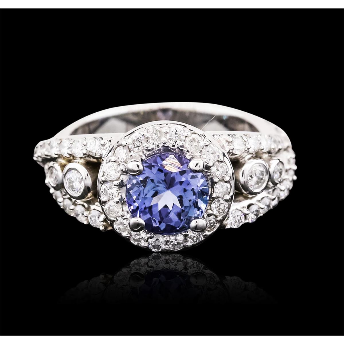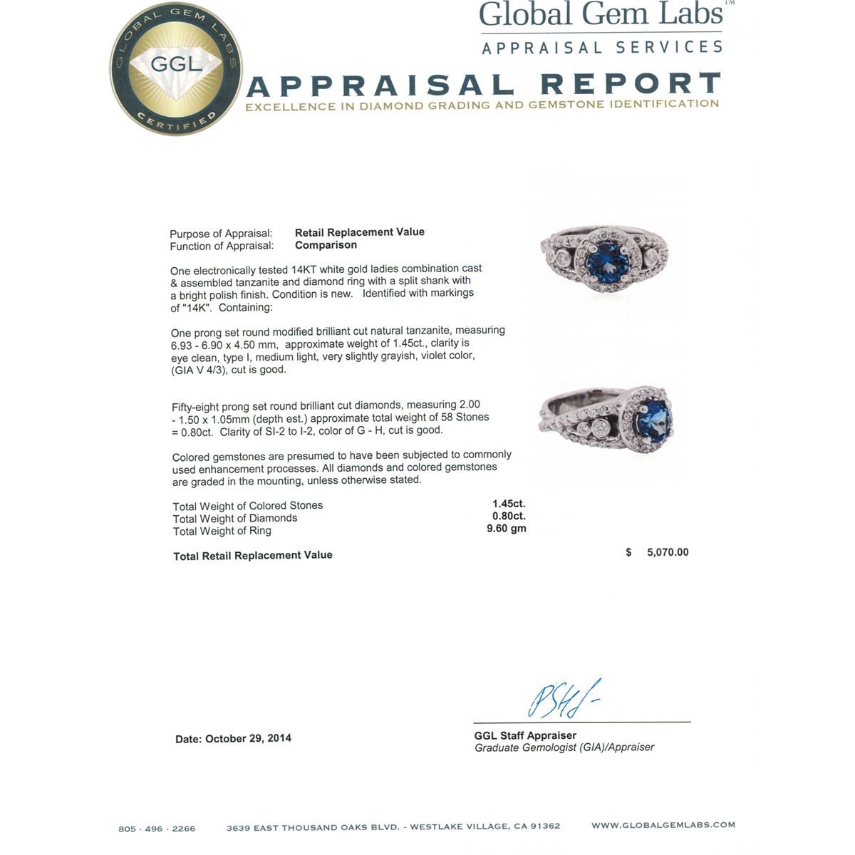 One electronically tested 14KT white gold ladies combination cast & assembled tanzanite and diamond ring with a split shank with a bright polish finish. Identified with markings of 14K. Condition is new. Containing: One prong set round modified brilliant cut natural tanzanite, measuring 6.93 - 6.90 x 4.50 mm, approximate weight of 1.45ct., clarity is eye clean, type I, medium light, very slightly grayish, violet color, (GIA V 4/3), cut is good. Fifty-Eight prong set round brilliant cut diamonds, measuring 2.00 - 1.50 x 1.05mm (depth est.) approximate total weight of 58 Stones = 0.80ct. Clarity: SI-2 to I-2. Color: G - H, Cut is Good. Colored gemstones are presumed to have been subjected to commonly used enhancement processes. All diamonds and colored gemstones are graded in the mounting, unless otherwise stated. Total Weight of Colored Stones 1.45ct. Total Weight of Diamonds 0.80ct. Total Weight of Ring 9.60 grams. GGL Appraised at $5,070.00.