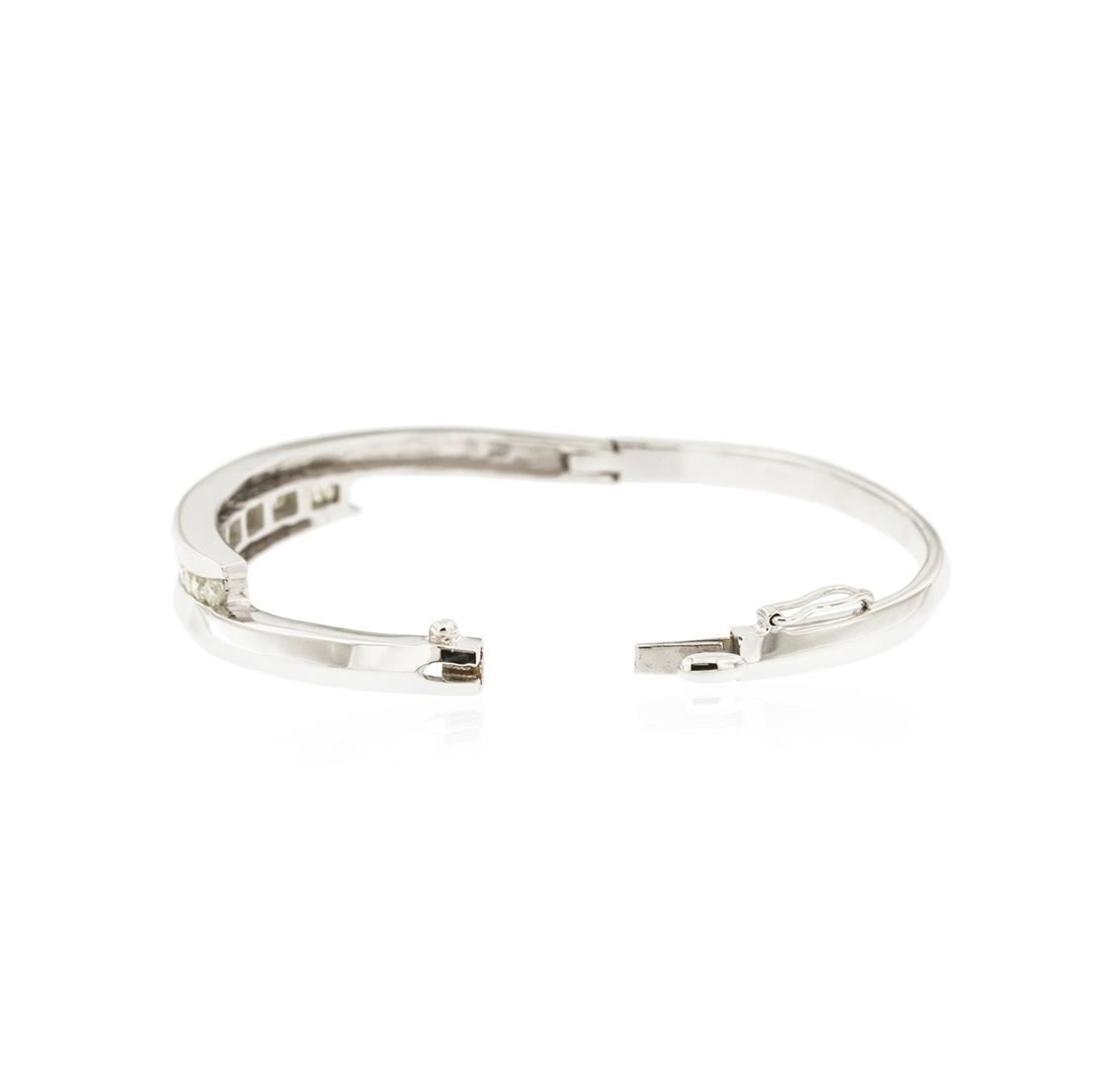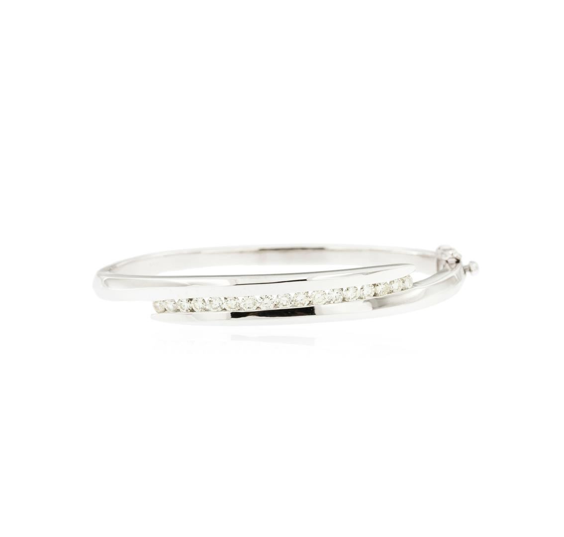 One electronically tested 14KT white gold ladies cast & assembled diamond bangle bracelet. Six and three-quarter inch wearable length bangle bracelet features a diamond ribbon set within a white gold bypass design supported by hinged shoulders, terminating in a concealed clasp with safety. Bright polish finish. Identified with markings of "14K". Condition is good. Containing: Seventeen channel set round brilliant cut diamonds, measuring 2.90 - 2.70 x 1.68mm (depth est.) approximate total weight of 17 Stones = 1.46ct. Color grade is an average for the group. Graded in the setting. Clarity: SI-1 to I-1. Total Weight of Diamonds 1.46ct. Total Weight of Bangle Bracelet 23.98 grams. AIG Appraised at $6,585.00.