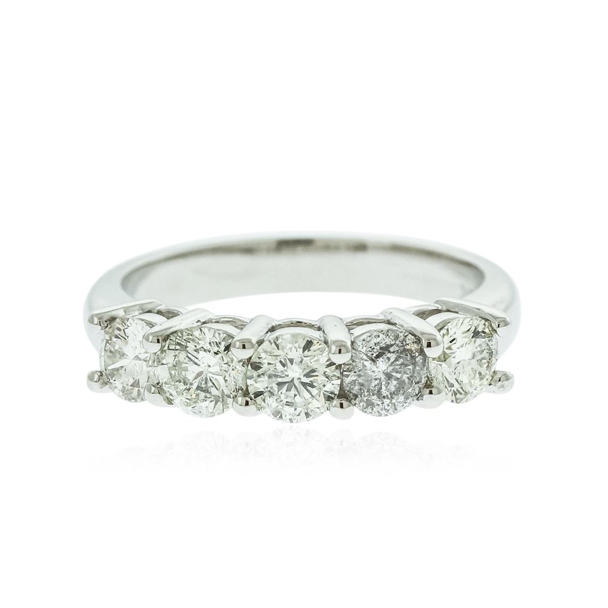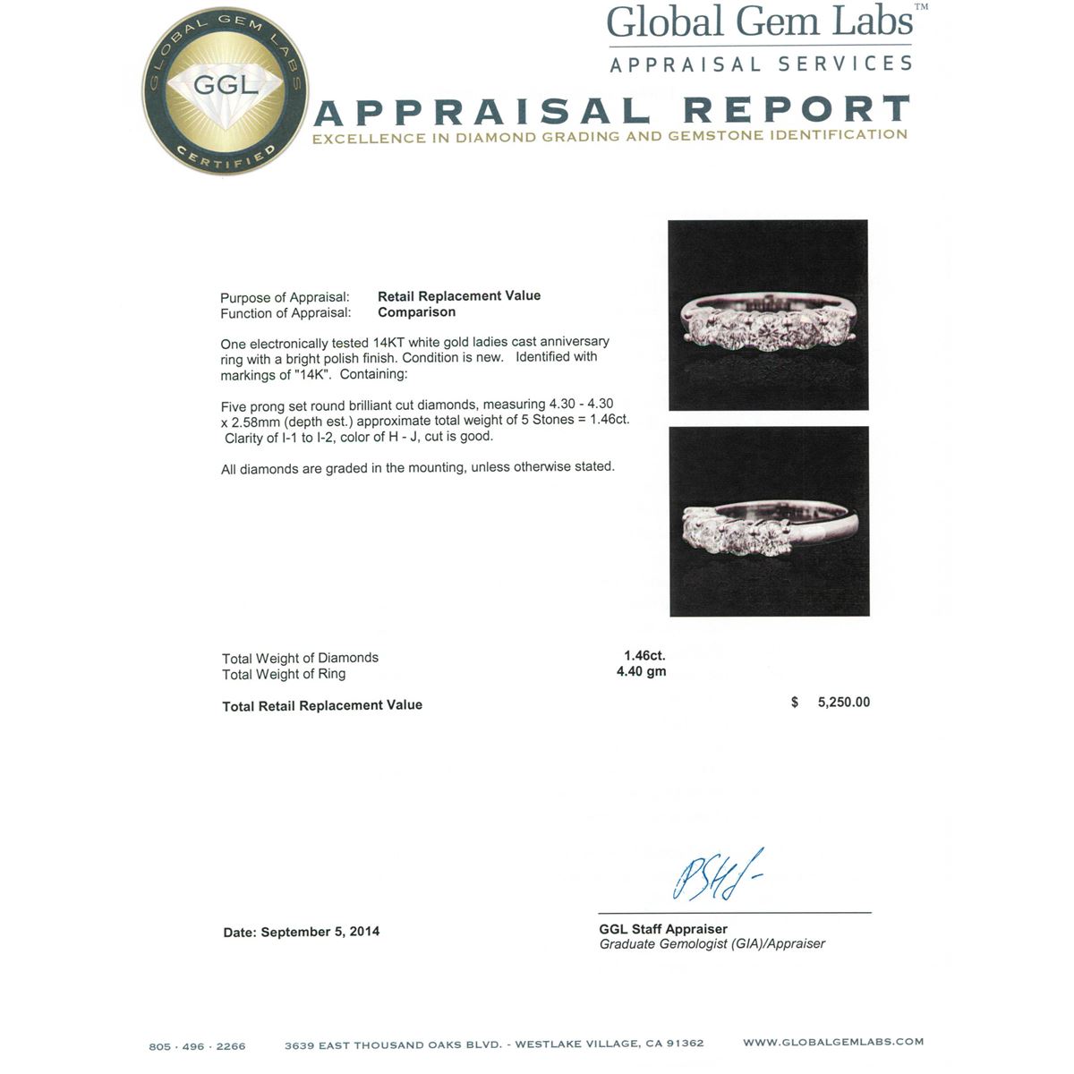 One electronically tested 14KT white gold ladies cast anniversary ring with a bright polish finish. Identified with markings of "14K". Condition is new. Containing: Five prong set round brilliant cut diamonds, measuring 4.30 - 4.30 x 2.58mm (depth est.) approximate total weight of 5 Stones = 1.46ct. Clarity: I-1 to I-2. Color: H - J, Cut is Good. All diamonds are graded in the mounting, unless otherwise stated. Total Weight of Diamonds 1.46ct. Total Weight of Ring 4.40 grams. GGL Appraised at $5,250.00.