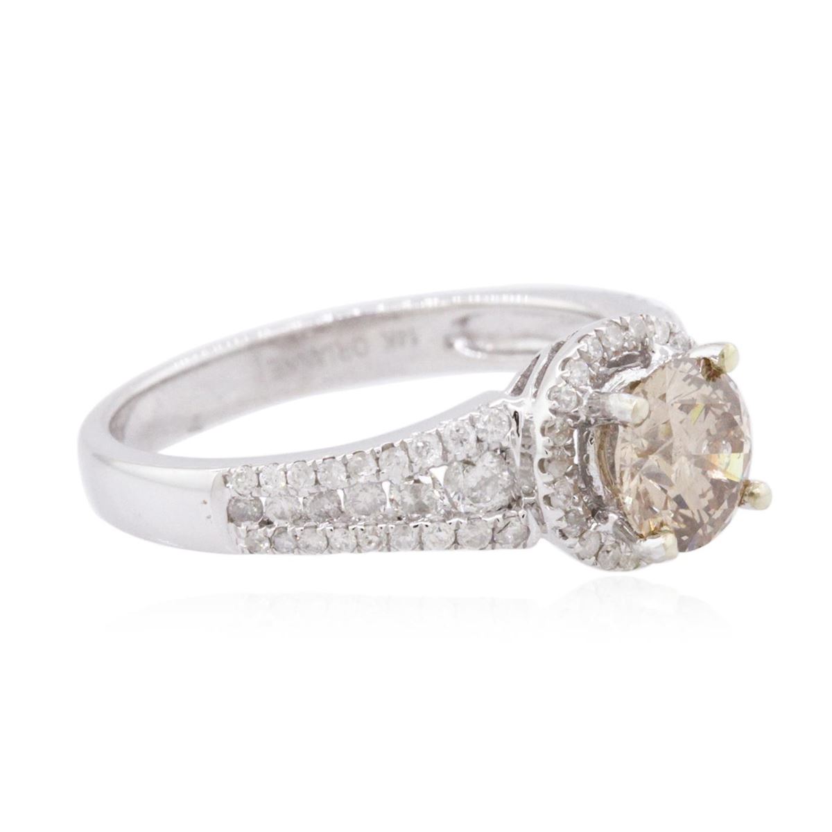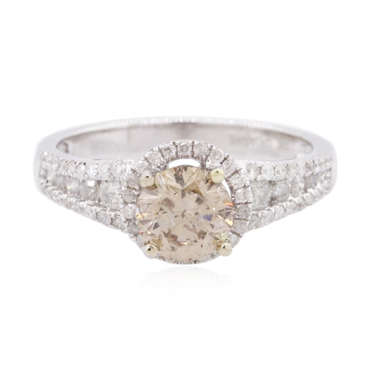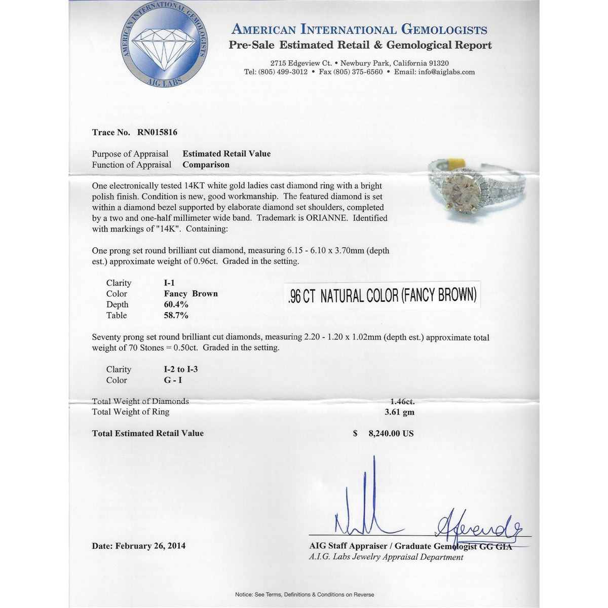 One electronically tested 14KT white gold ladies cast diamond ring with a bright polish finish. Condition is new, good workmanship. The featured diamond is set within a diamond bezel supported by elaborate diamond set shoulders, completed by a two and one-half millimeter wide band. Trademark is ORIANNE. Identified with markings of 14K. Containing: One prong set round brilliant cut diamond, measuring 6.15 - 6.10 x 3.70mm (depth est.) approximate weight of 0.96ct. Graded in the setting. Clarity: I-1. Color: Fancy Brown. Depth: 60.4%. Table: 58.7%. Seventy prong set round brilliant cut diamonds, measuring 2.20 - 1.20 x 1.02mm (depth est.) approximate total weight of 70 stones = 0.50ct. Graded in the setting. Clarity: I-2 to I-3. Color: G-I. Total Weight of Diamonds 1.46ct. Total Weight of Ring 3.61 grams. AIG Appraised at $8,240.00.