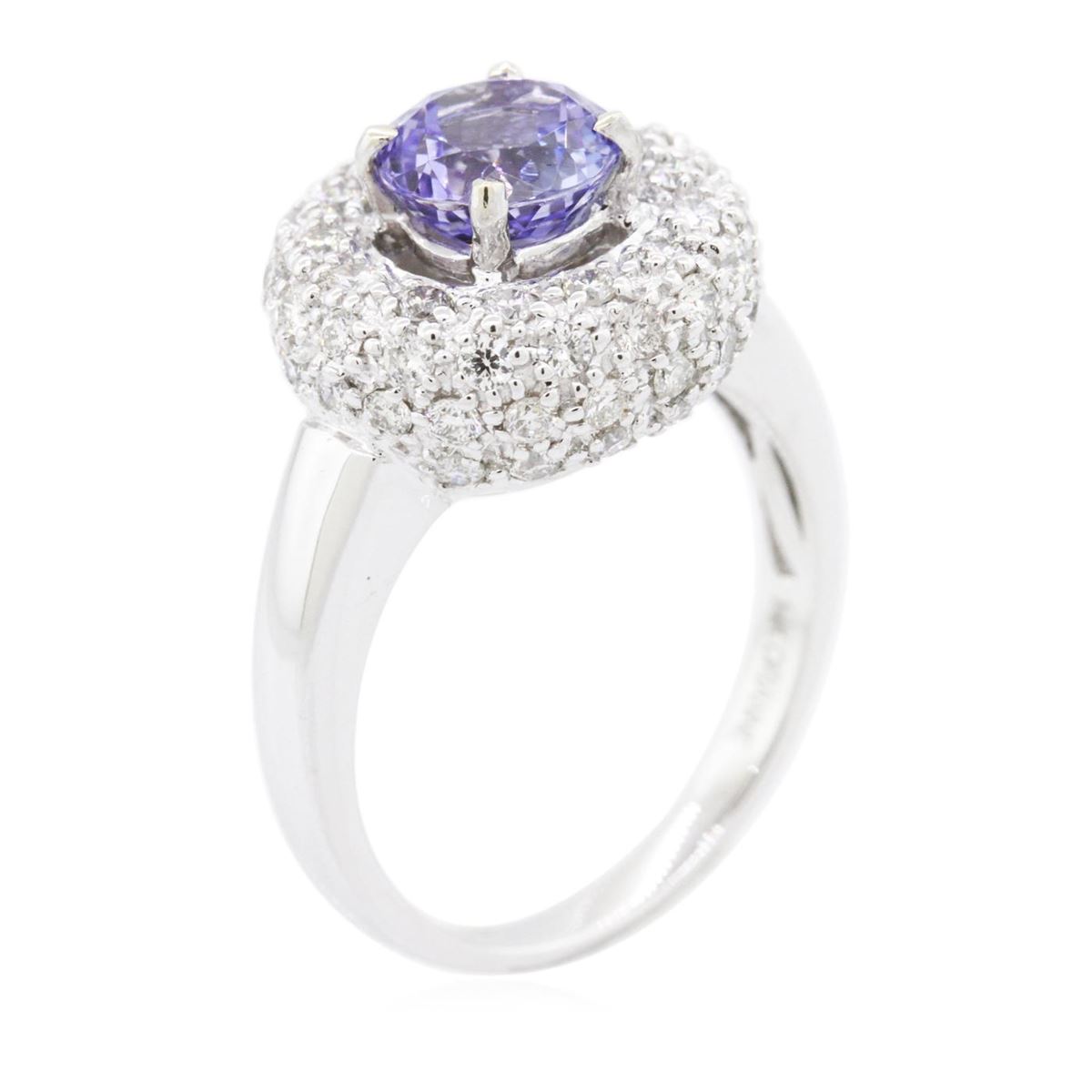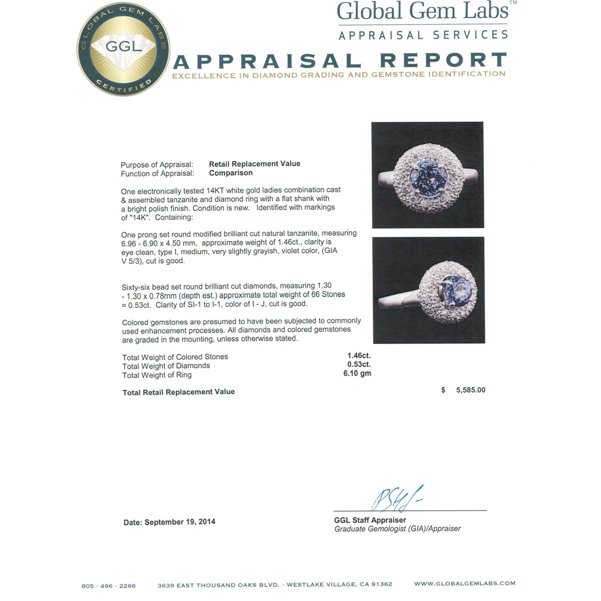 One electronically tested 14KT white gold ladies combination cast & assembled tanzanite and diamond ring with a flat shank with a bright polish finish. Identified with markings of "14K". Condition is new. Containing: One prong set round modified brilliant cut natural tanzanite, measuring 6.96 - 6.90 x 4.50 mm, approximate weight of 1.46ct., clarity is eye clean, type I, medium, very slightly grayish, violet color, (GIA V 5/3), cut is good. Sixty-Six bead set round brilliant cut diamonds, measuring 1.30 - 1.30 x 0.78mm (depth est.) approximate total weight of 66 Stones = 0.53ct. Clarity: SI-1 to I-1. Color: I - J, Cut is Good. Colored gemstones are presumed to have been subjected to commonly used enhancement processes. All diamonds and colored gemstones are graded in the mounting, unless otherwise stated. Total Weight of Colored Stones 1.46ct. Total Weight of Diamonds 0.53ct. Total Weight of Ring 6.10 grams. GGL Appraised at $5,585.00.