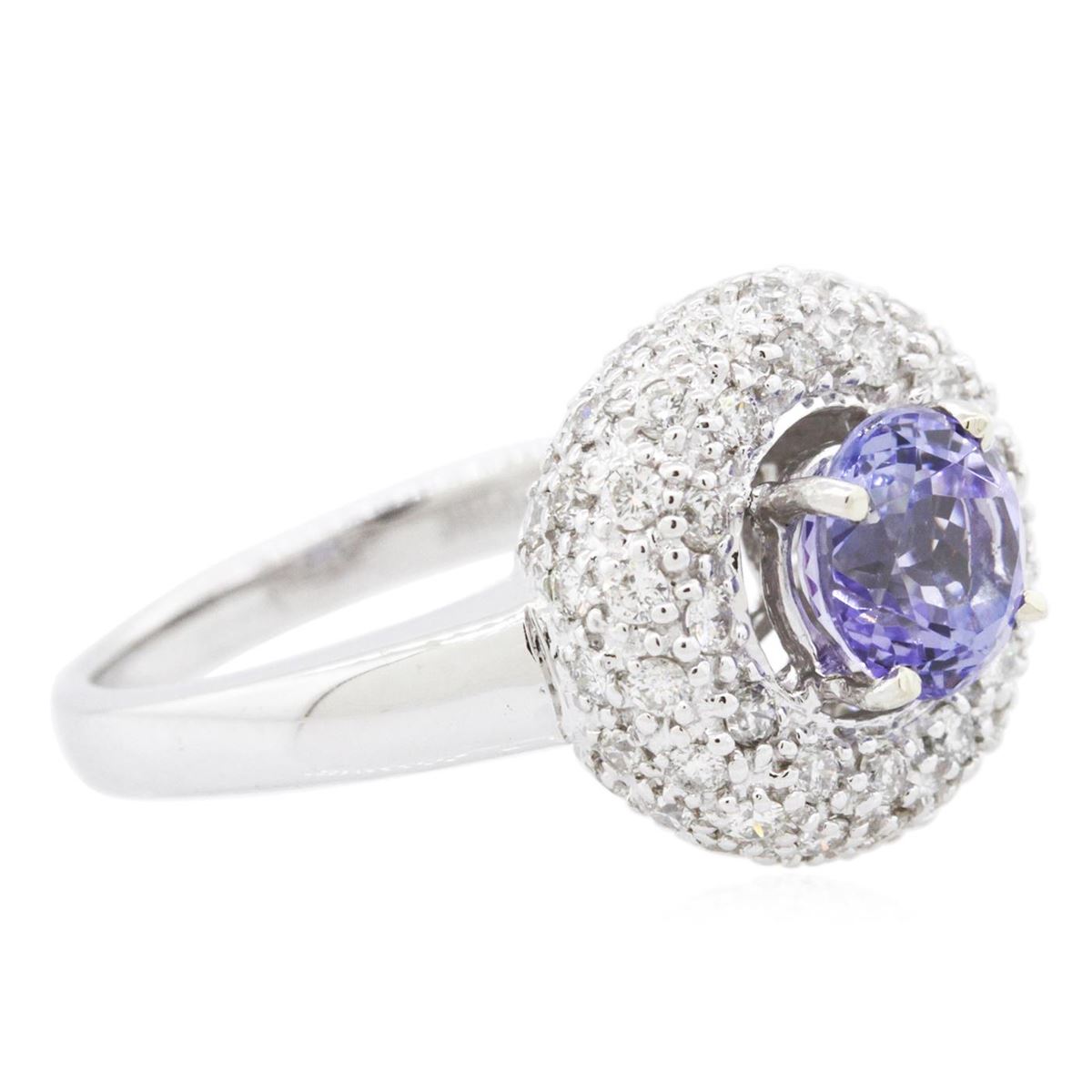 One electronically tested 14KT white gold ladies combination cast & assembled tanzanite and diamond ring with a flat shank with a bright polish finish. Identified with markings of "14K". Condition is new. Containing: One prong set round modified brilliant cut natural tanzanite, measuring 6.96 - 6.90 x 4.50 mm, approximate weight of 1.46ct., clarity is eye clean, type I, medium, very slightly grayish, violet color, (GIA V 5/3), cut is good. Sixty-Six bead set round brilliant cut diamonds, measuring 1.30 - 1.30 x 0.78mm (depth est.) approximate total weight of 66 Stones = 0.53ct. Clarity: SI-1 to I-1. Color: I - J, Cut is Good. Colored gemstones are presumed to have been subjected to commonly used enhancement processes. All diamonds and colored gemstones are graded in the mounting, unless otherwise stated. Total Weight of Colored Stones 1.46ct. Total Weight of Diamonds 0.53ct. Total Weight of Ring 6.10 grams. GGL Appraised at $5,585.00.