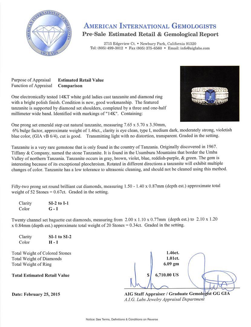 One electronically tested 14KT white gold ladies cast tanzanite and diamond ring with a bright polish finish. The featured tanzanite is supported by diamond set shoulders, completed by a three and one-half millimeter wide band. Identified with markings of "14K". Condition is new, good workmanship. Containing: One prong set emerald step cut natural tanzanite, measuring 7.65 x 5.70 x 3.50mm, 6%. bulge factor, approximate weight of 1.46ct., clarity is eye clean, type I, medium dark, moderately strong, violetish blue color, (GIA vB 6/4), cut is good. Transmitting light with no distortion, transparent. Graded in the setting. Tanzanite is a very rare gemstone that is only found in the country of Tanzania. Originally discovered in 1967. Tiffany & Company, named the stone Tanzanite. It is found in the Usumburu Mountains that border the Umba Valley of northern Tanzania. Tanzanite occurs in gray, brown, violet, blue, reddish-purple, & green. The gem is interesting because of its exceptional pleochroism. Rotated in different directions a tanzanite will exhibit multiple changes of color. Tanzanite has a low tolerance to ultrasonic cleaning, and should not be cleaned using this method. Fifty-Two prong set round brilliant cut diamonds, measuring 1.50 - 1.40 x 0.87mm (depth est.) approximate total weight of 52 Stones = 0.67ct. Graded in the setting. Clarity: SI-2 to I-1. Color: G - I Twenty channel set baguette cut diamonds, measuring from 2.00 x 1.10 x 0.77mm (depth est.) to 2.10 x 1.20 x 0.84mm (depth est.) approximate total weight of 20 Stones = 0.34ct. Graded in the setting. Clarity: SI-1 to SI-2. Color: H - I. Total Weight of Colored Stones 1.46ct. Total Weight of Diamonds 1.01ct. Total Weight of Ring 6.09 grams. AIG Appraised at $6,710.00.