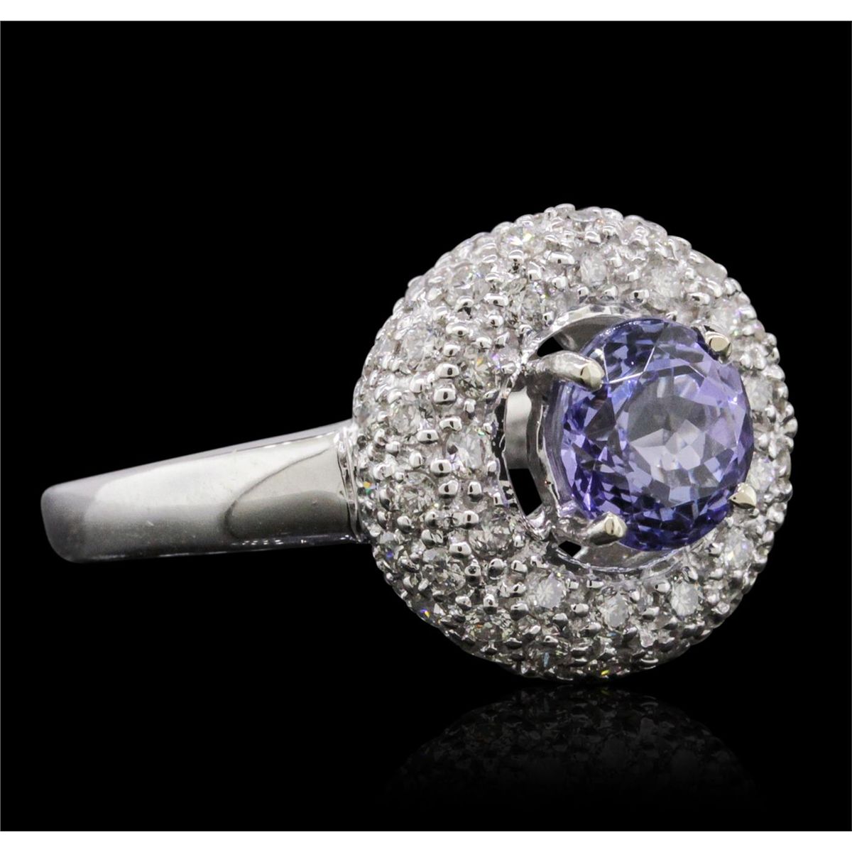 One electronically tested 14KT white gold ladies combination cast & assembled tanzanite and diamond ring with a flat shank with a bright polish finish. Identified with markings of "14K". Condition is new. Containing: One prong set round modified brilliant cut natural tanzanite, measuring 6.96 - 6.90 x 4.50 mm, approximate weight of 1.46ct., clarity is eye clean, type I, medium, very slightly grayish, violet color, (GIA V 5/3), cut is good. Sixty-Six bead set round brilliant cut diamonds, measuring 1.30 - 1.30 x 0.78mm (depth est.) approximate total weight of 66 Stones = 0.53ct. Clarity: SI-1 to I-1. Color: I - J, Cut is Good. Colored gemstones are presumed to have been subjected to commonly used enhancement processes. All diamonds and colored gemstones are graded in the mounting, unless otherwise stated. Total Weight of Colored Stones 1.46ct. Total Weight of Diamonds 0.53ct. Total Weight of Ring 6.10 grams. GGL Appraised at $5,585.00.