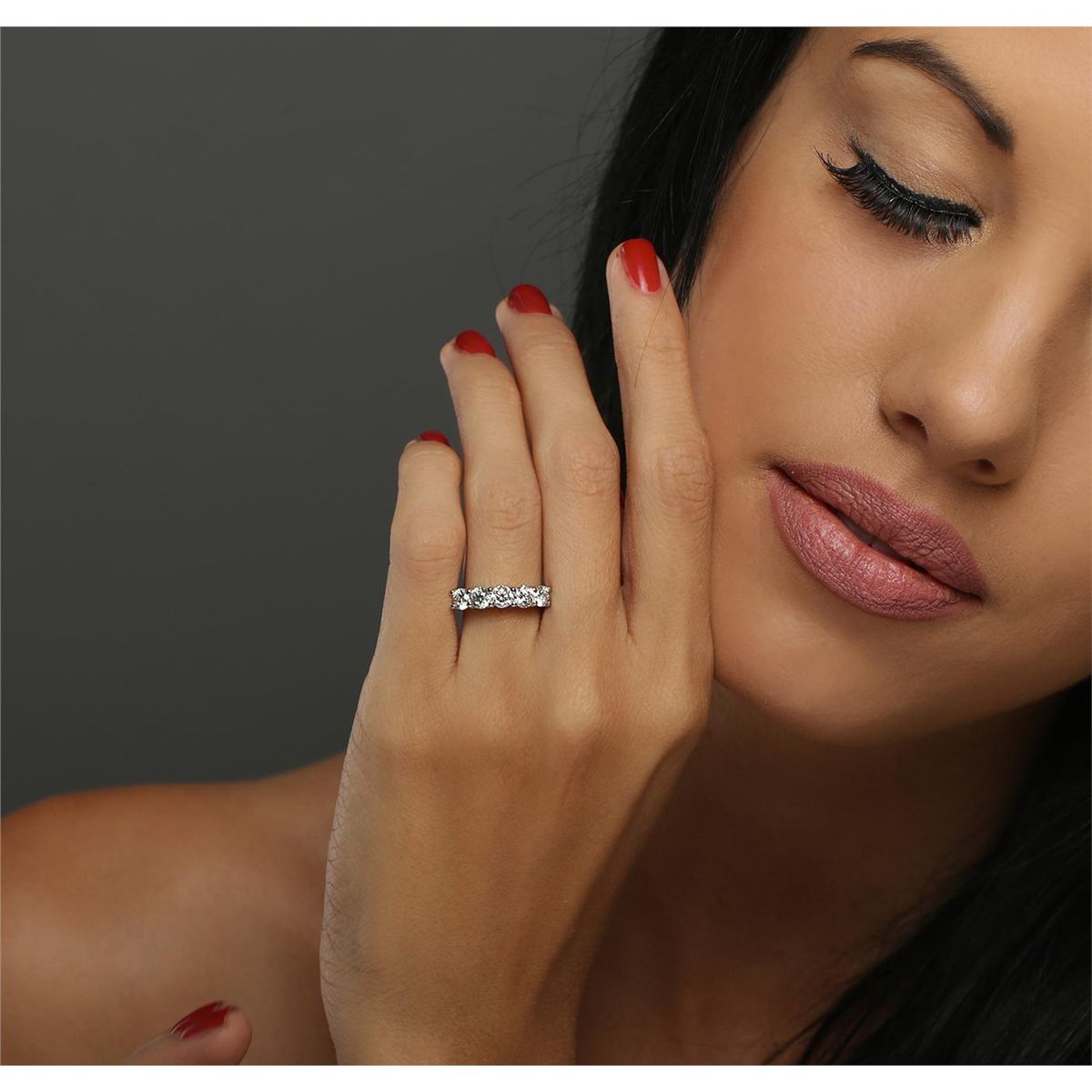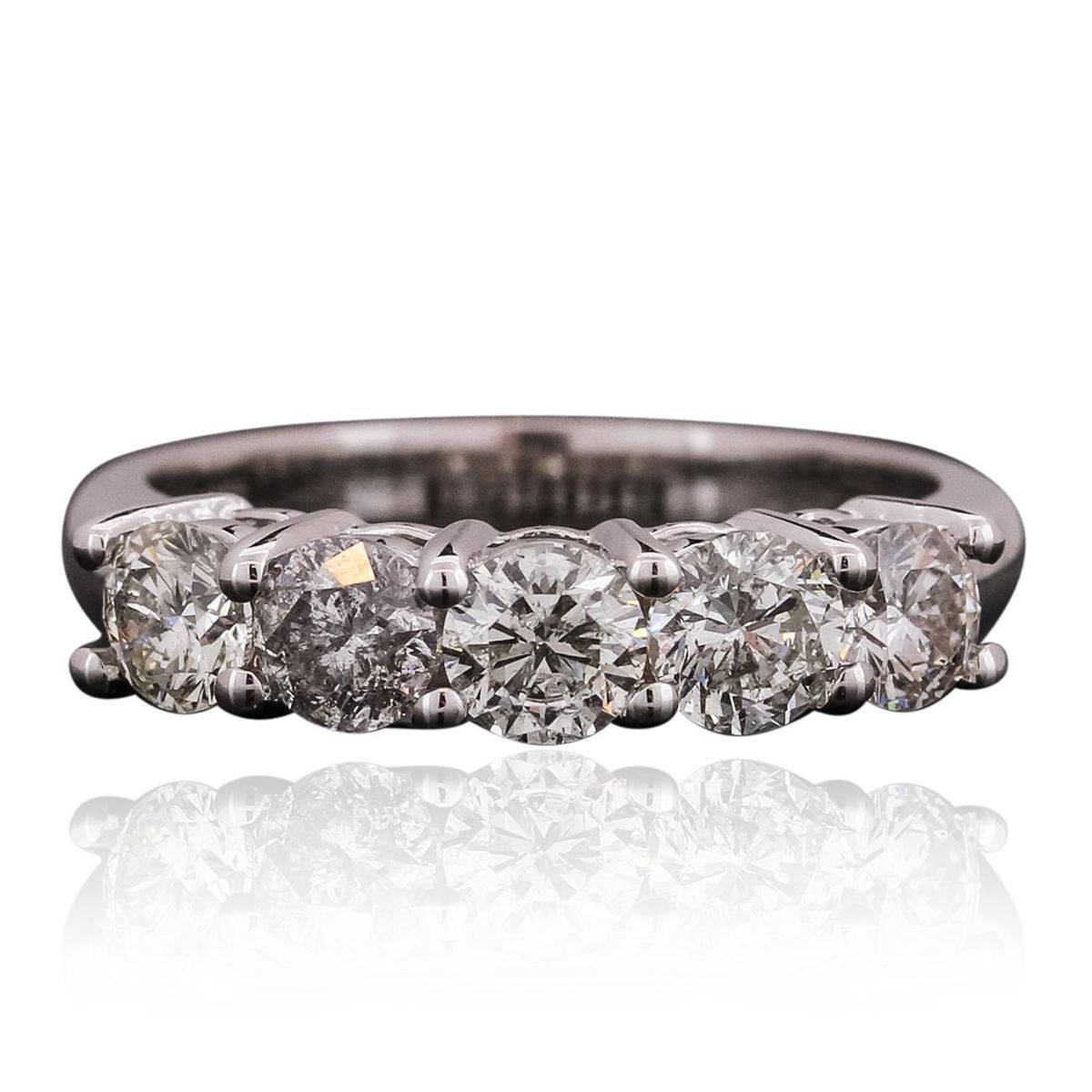 One electronically tested 14KT white gold ladies cast anniversary ring with a bright polish finish. Identified with markings of "14K". Condition is new. Containing: Five prong set round brilliant cut diamonds, measuring 4.30 - 4.30 x 2.58mm (depth est.) approximate total weight of 5 Stones = 1.46ct. Clarity: I-1 to I-2. Color: H - J, Cut is Good. All diamonds are graded in the mounting, unless otherwise stated. Total Weight of Diamonds 1.46ct. Total Weight of Ring 4.40 grams. GGL Appraised at $5,250.00.