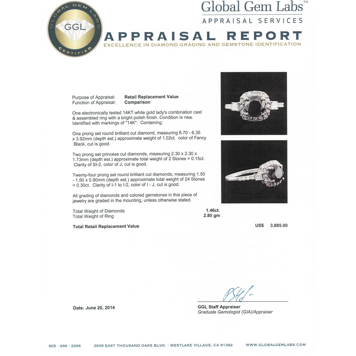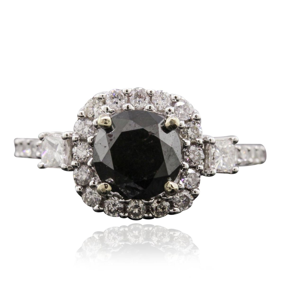 One electronically tested 14KT white gold Ladies combination cast & assembled ring with a bright polish finish. Condition is new. Identified with markings of "14K". Containing: One prong set round brilliant cut diamond, measuring 6.70 - 6.35 x 3.92mm (depth est.) approximate weight of 1.02ct. Cut is Good. Two prong set princess cut diamonds, measuring 2.30 x 2.30 x 1.73mm (depth est.) approximate. Total Weight of 2 Stones = 0.15ct. Clarity: SI-2. Color: J, Cut is Good. Twenty-Four prong set round brilliant cut diamonds, measuring 1.50 - 1.50 x 0.90mm (depth est.) approximate. Total Weight of 24 Stones = 0.30ct. Clarity: I-1 to I-2. Color: I - J, Cut is Good. All grading of diamonds and colored gemstones in this piece of jewelry are graded in the mounting, unless otherwise stated. Total Weight of Diamonds 1.46ct. Total Weight of Ring 2.80 grams. GGL Appraised at $3,885.00.