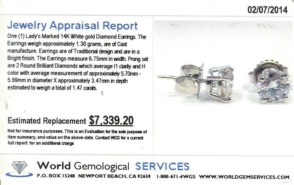 One (1) Ladies Marked 14KT White Gold Diamond Earrings. The Earrings weigh approximately 1.30 grams, are of Cast manufacture. Earrings are of a Traditional design and are in a Bright finish. The Earrings measure 6.75mm in width. Prong set are 2 Round Brilliant Diamonds which average I1 clarity and H color with average measurement of approximately 5.70mm-5.69mm in diameter X approximately 3.47mm in depth estimated to weigh a total of 1.47 carats. WGS Appraised at $7,339.20.