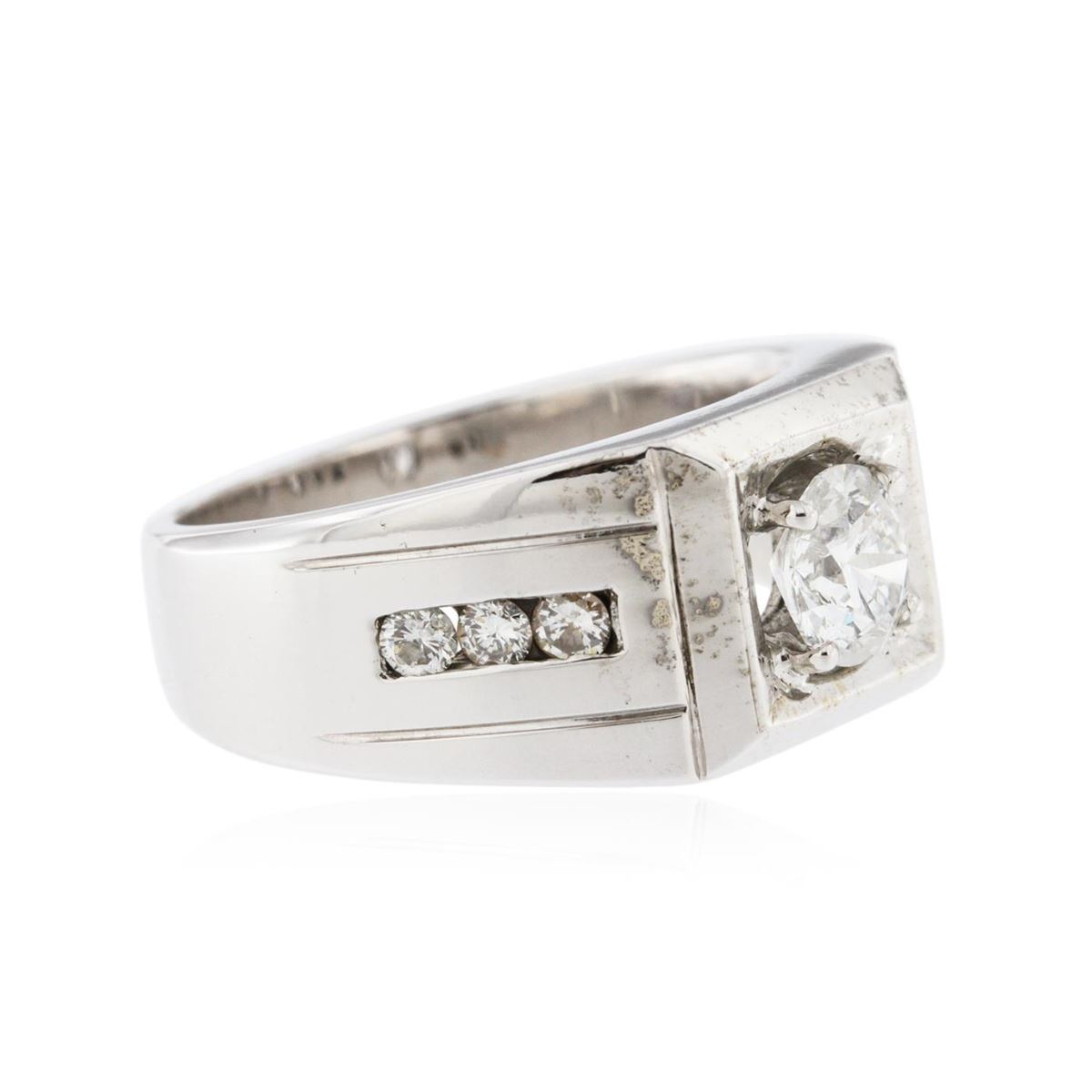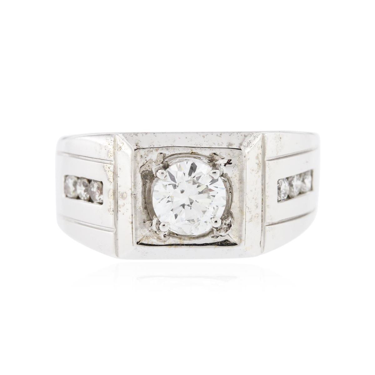 One electronically tested 14KT white gold man's combination cast & assembled fashion ring with a bright polish finish. Identified with markings of "14K". Condition is new. Containing: One prong set round brilliant cut diamond, measuring 6.15 - 6.10 x 3.81mm (depth est.) approximate weight of 0.87ct. Clarity of SI-2, Color of G, Cut is Very Good. Six channel set round brilliant cut diamonds, measuring 3.00 - 3.00 x 1.80mm (depth est.) approximate total weight of 6 Stones = 0.59ct. Clarity of SI-1 to SI-2, Color of I - J, Cut is Very Good. Total Weight of Diamonds 1.47ct. Total Weight of Ring 14.00gm. GGL Appraised at $19,555.00.