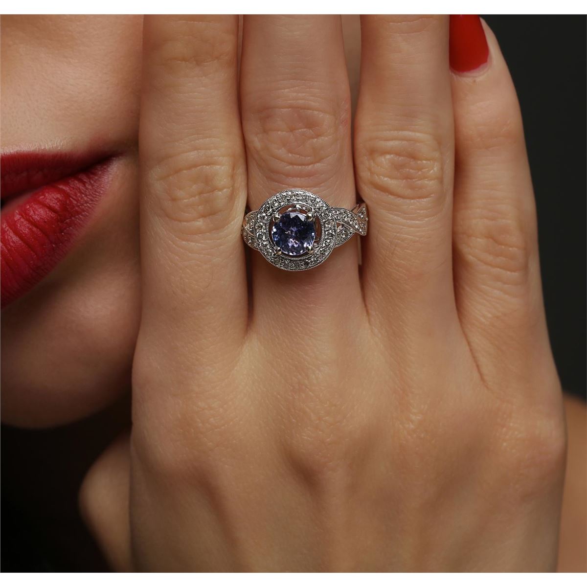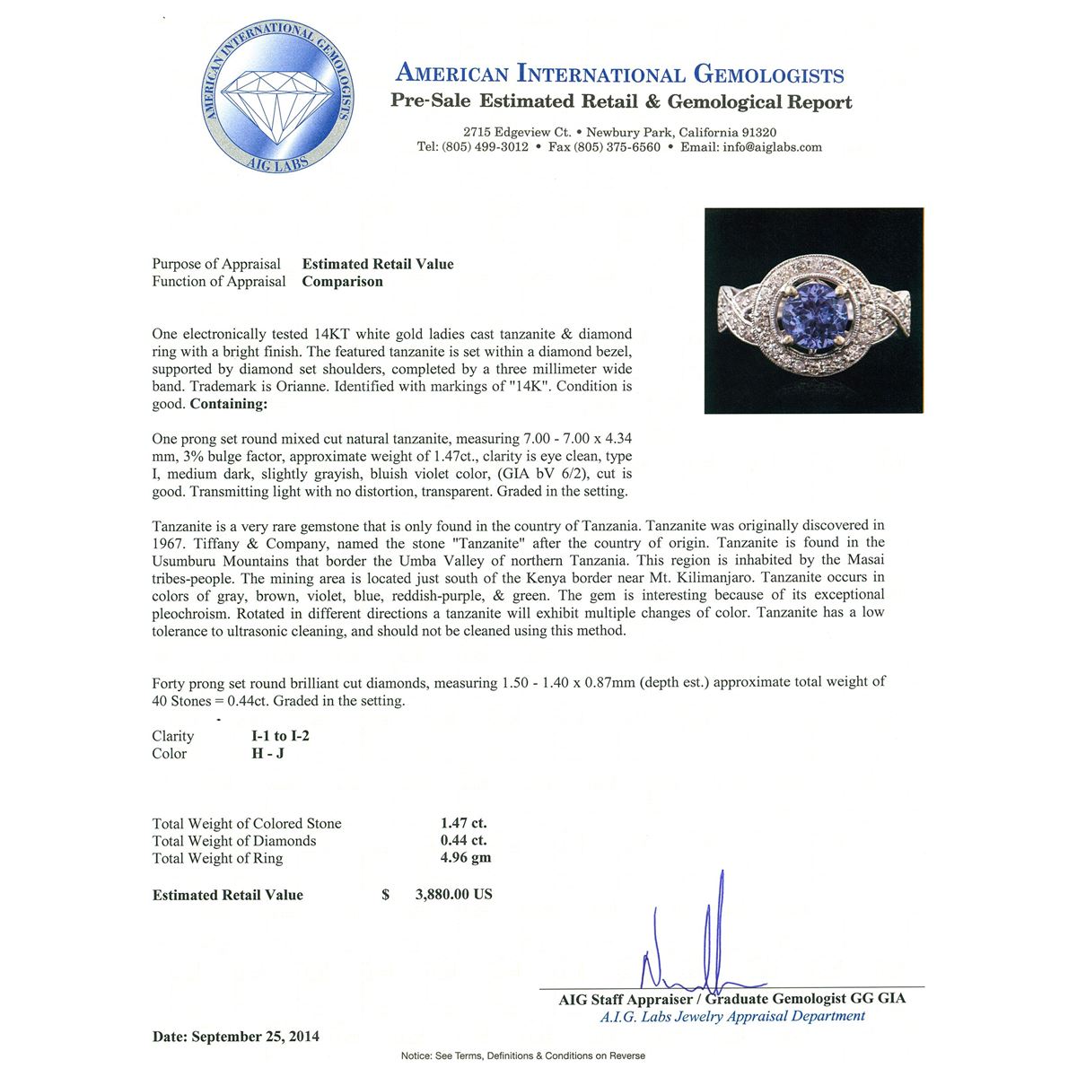 One electronically tested 14KT white gold ladies cast tanzanite & diamond ring with a bright finish. The featured tanzanite is set within Trademark is Orianne. Identified with markings of "14K". Condition is good. Containing: Forty prong set round brilliant cut diamonds, measuring 1.50 - 1.40 x 0.87mm (depth est.) approximate total weight of 40 Stones = 0.44ct. Graded in the setting. Clarity: I-1 to I-2. Color: H - J One prong set round mixed cut natural tanzanite, measuring 7.00 - 7.00 x 4.34 mm, 3% bulge factor, approximate weight of 1.47ct., clarity is eye clean, type I, medium dark, slightly grayish, bluish violet color, (GIA bV 6/2), cut is good. Transmitting light with no distortion, transparent. Graded in the setting. Tanzanite is a very rare gemstone that is only found in the country of Tanzania. Tanzanite was originally discovered in 1967. Tiffany & Company, named the stone "Tanzanite" after the country of origin. Tanzanite is found in the Usumburu Mountains that border the Umba Valley of northern Tanzania. This region is inhabited by the Masai tribes-people. The mining area is located just south of the Kenya border near Mt. Kilimanjaro. Tanzanite occurs in colors of gray, brown, violet, blue, reddish-purple, & green. The gem is interesting because of its exceptional pleochroism. Rotated in different directions a tanzanite will exhibit multiple changes of color. Tanzanite has a low tolerance to ultrasonic cleaning, and should not be cleaned using this method. Total Weight of Colored Stones 1.47ct. Total Weight of Diamonds 0.44ct. Total Weight of Ring 4.96 grams. AIG Appraised at $3,880.00.