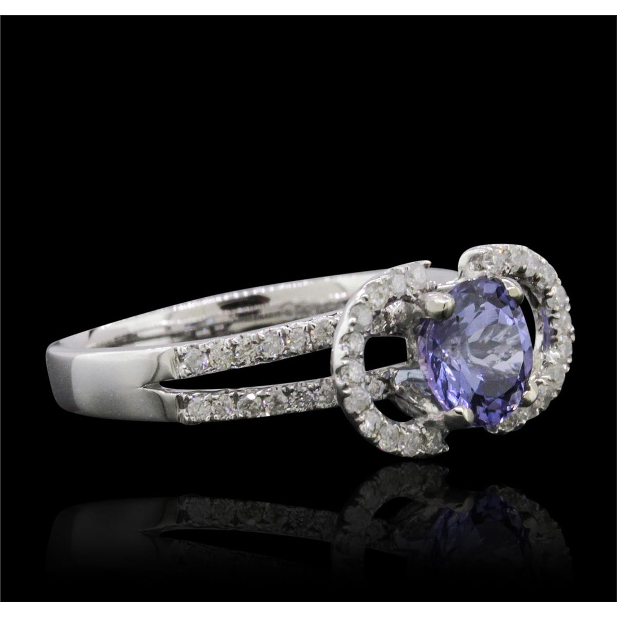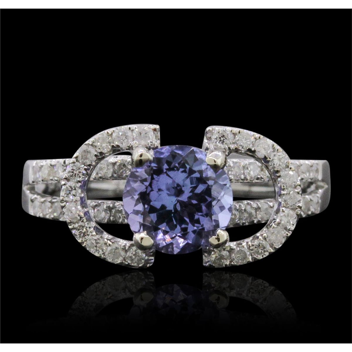 One electronically tested 14KT white gold ladies combination cast & assembled tanzanite and diamond ring with a split shank with a bright polish finish. Identified with markings of "14K". Condition is new. Containing: One prong set round modified brilliant cut natural tanzanite, measuring 6.85 - 6.85 x 4.66 mm, approximate weight of 1.47ct., clarity is eye clean, type I, medium light, very slightly grayish, violet color, (GIA V 4/3), cut is very good. Forty-Two prong set round brilliant cut diamonds, measuring 1.20 - 1.20 x 0.72mm (depth est.) approximate total weight of 42 Stones = 0.27ct. Clarity: I-1 to I-2. Color: H - I, Cut is Good. Colored gemstones are presumed to have been subjected to commonly used enhancement processes. All diamonds and colored gemstones are graded in the mounting, unless otherwise stated. Total Weight of Colored Stones 1.47ct. Total Weight of Diamonds 0.27ct. Total Weight of Ring 3.80 grams. GGL Appraised at $4,570.00.