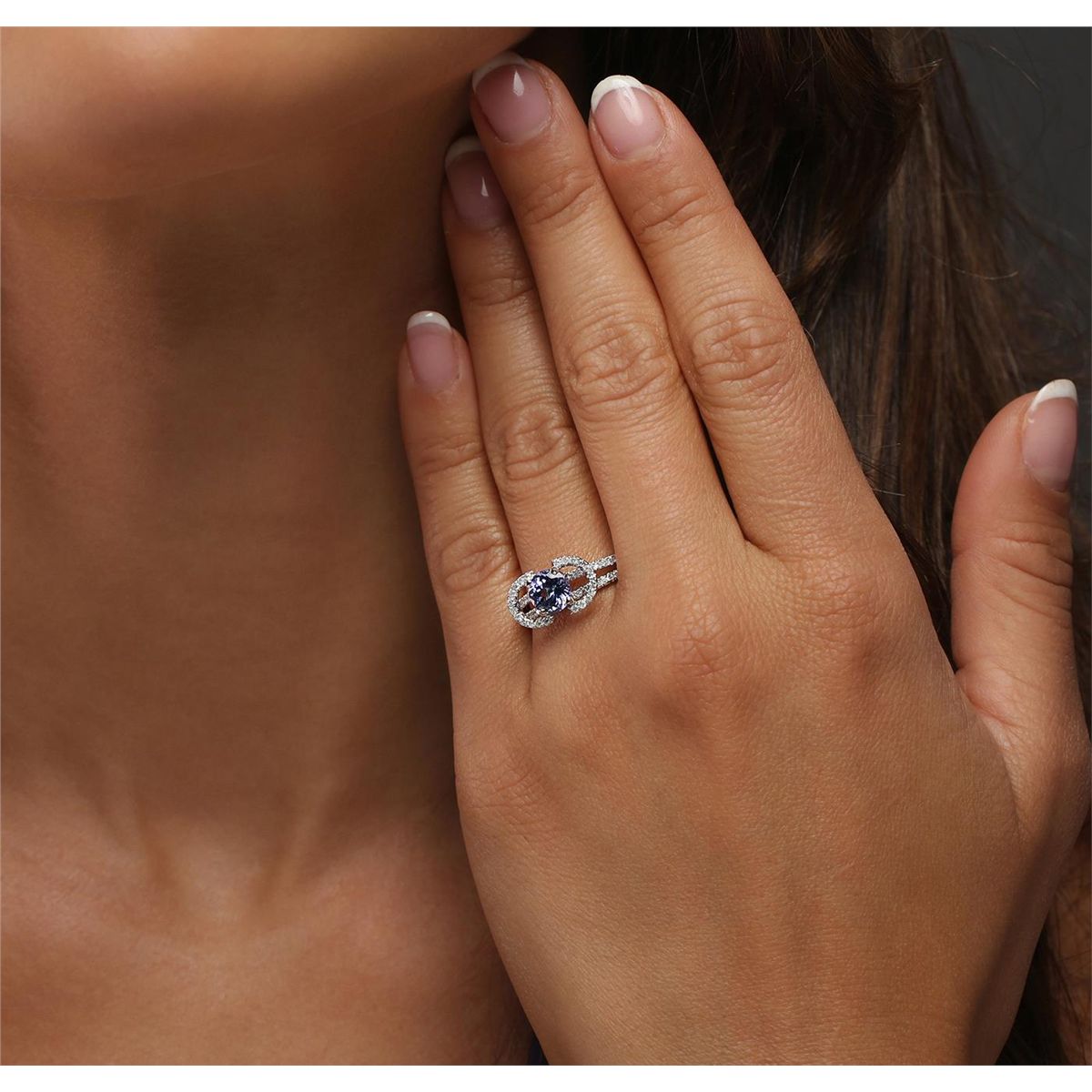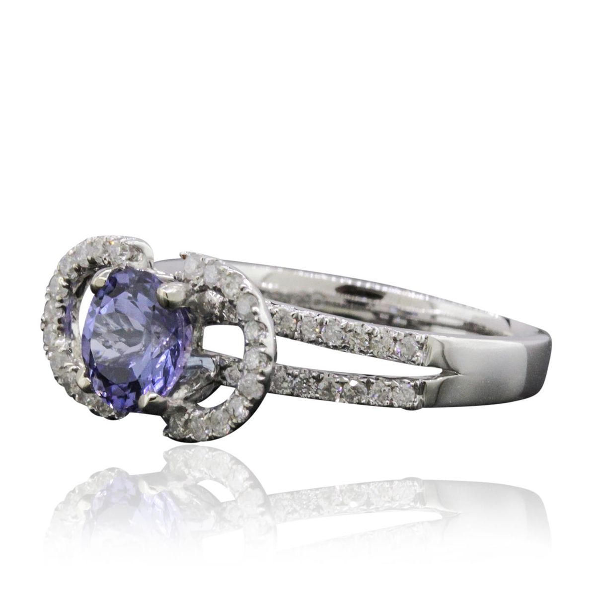 One electronically tested 14KT white gold ladies combination cast & assembled tanzanite and diamond ring with a split shank with a bright polish finish. Identified with markings of "14K". Condition is new. Containing: One prong set round modified brilliant cut natural tanzanite, measuring 6.85 - 6.85 x 4.66 mm, approximate weight of 1.47ct., clarity is eye clean, type I, medium light, very slightly grayish, violet color, (GIA V 4/3), cut is very good. Forty-Two prong set round brilliant cut diamonds, measuring 1.20 - 1.20 x 0.72mm (depth est.) approximate total weight of 42 Stones = 0.27ct. Clarity: I-1 to I-2. Color: H - I, Cut is Good. Colored gemstones are presumed to have been subjected to commonly used enhancement processes. All diamonds and colored gemstones are graded in the mounting, unless otherwise stated. Total Weight of Colored Stones 1.47ct. Total Weight of Diamonds 0.27ct. Total Weight of Ring 3.80 grams. GGL Appraised at $4,570.00.