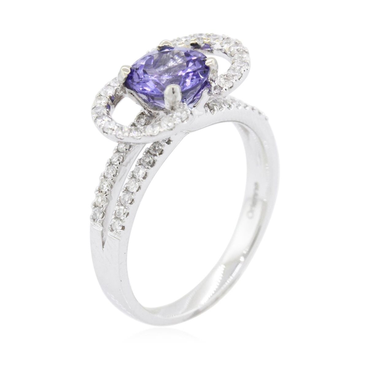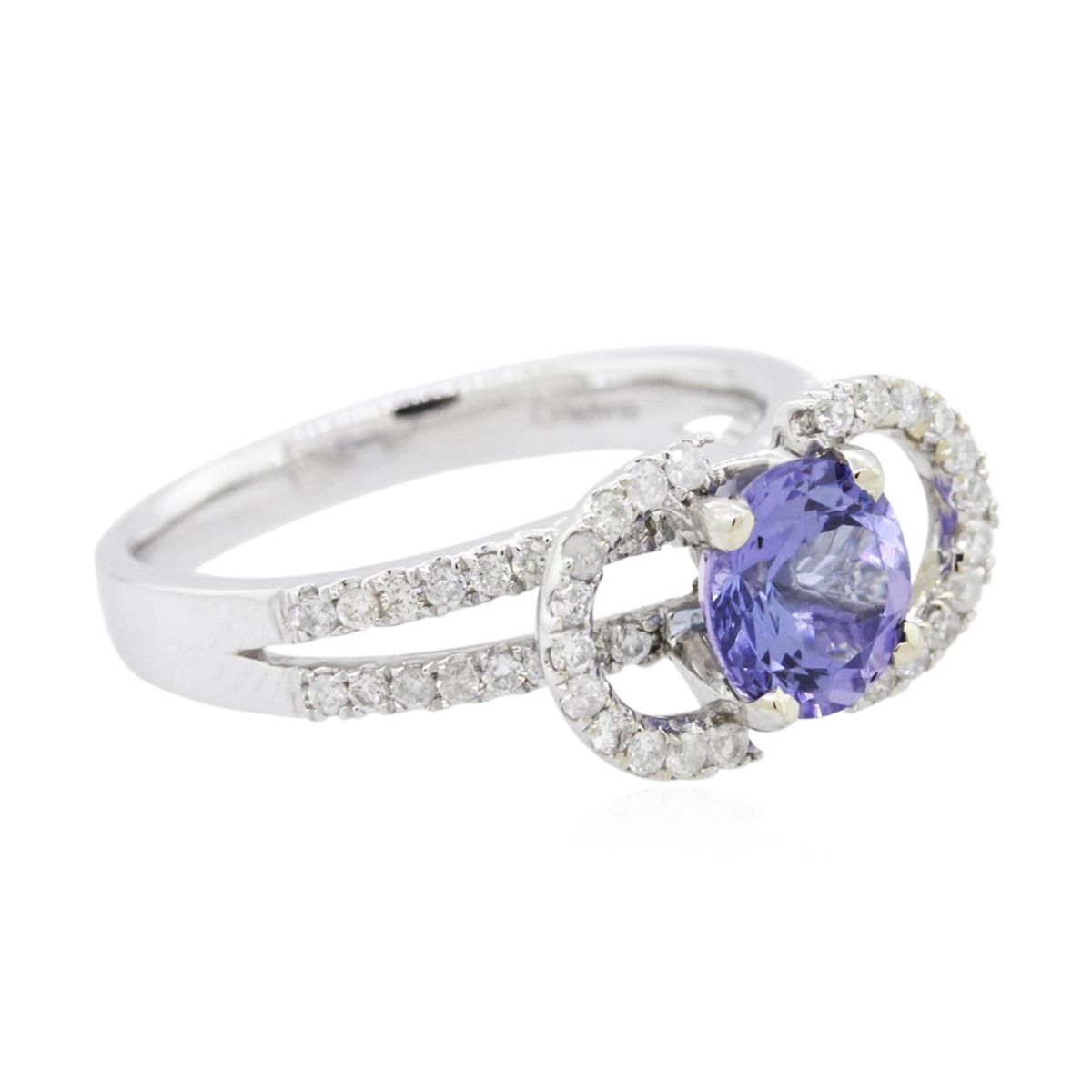 One electronically tested 14KT white gold ladies combination cast & assembled tanzanite and diamond ring with a split shank with a bright polish finish. Identified with markings of "14K". Condition is new. Containing: One prong set round modified brilliant cut natural tanzanite, measuring 6.85 - 6.85 x 4.66 mm, approximate weight of 1.47ct., clarity is eye clean, type I, medium light, very slightly grayish, violet color, (GIA V 4/3), cut is very good. Forty-Two prong set round brilliant cut diamonds, measuring 1.20 - 1.20 x 0.72mm (depth est.) approximate total weight of 42 Stones = 0.27ct. Clarity: I-1 to I-2. Color: H - I, Cut is Good. Colored gemstones are presumed to have been subjected to commonly used enhancement processes. All diamonds and colored gemstones are graded in the mounting, unless otherwise stated. Total Weight of Colored Stones 1.47ct. Total Weight of Diamonds 0.27ct. Total Weight of Ring 3.80 grams. GGL Appraised at $4,570.00.