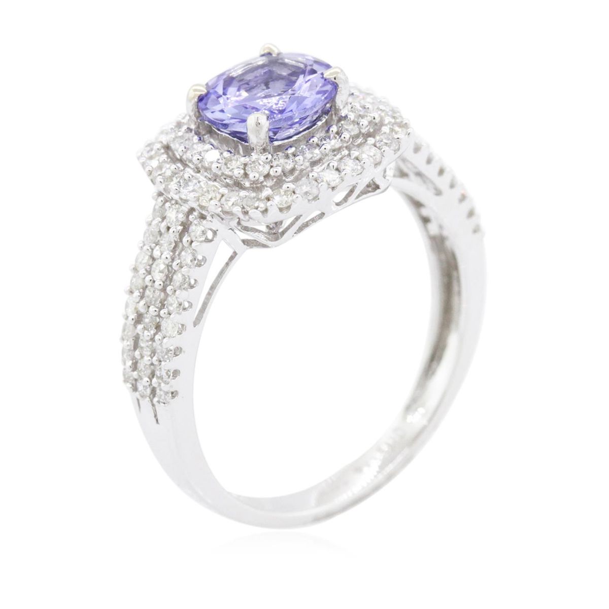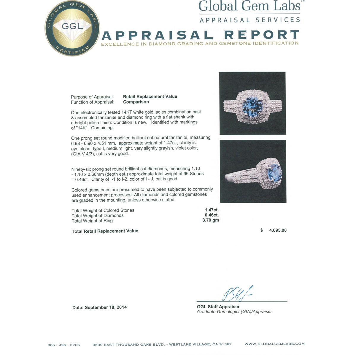 One electronically tested 14KT white gold ladies combination cast & assembled tanzanite and diamond ring with a flat shank with a bright polish finish. Identified with markings of "14K". Condition is new. Containing: One prong set round modified brilliant cut natural tanzanite, measuring 6.98 - 6.90 x 4.51 mm, approximate weight of 1.47ct., clarity is eye clean, type I, medium light, very slightly grayish, violet color, (GIA V 4/3), cut is very good. Ninety-Six prong set round brilliant cut diamonds, measuring 1.10 - 1.10 x 0.66mm (depth est.) approximate total weight of 96 Stones = 0.46ct. Clarity: I-1 to I-2. Color: I - J, Cut is Good. Colored gemstones are presumed to have been subjected to commonly used enhancement processes. All diamonds and colored gemstones are graded in the mounting, unless otherwise stated. Total Weight of Colored Stones 1.47ct. Total Weight of Diamonds 0.46ct. Total Weight of Ring 3.70 grams. GGL Appraised at $4,695.00.