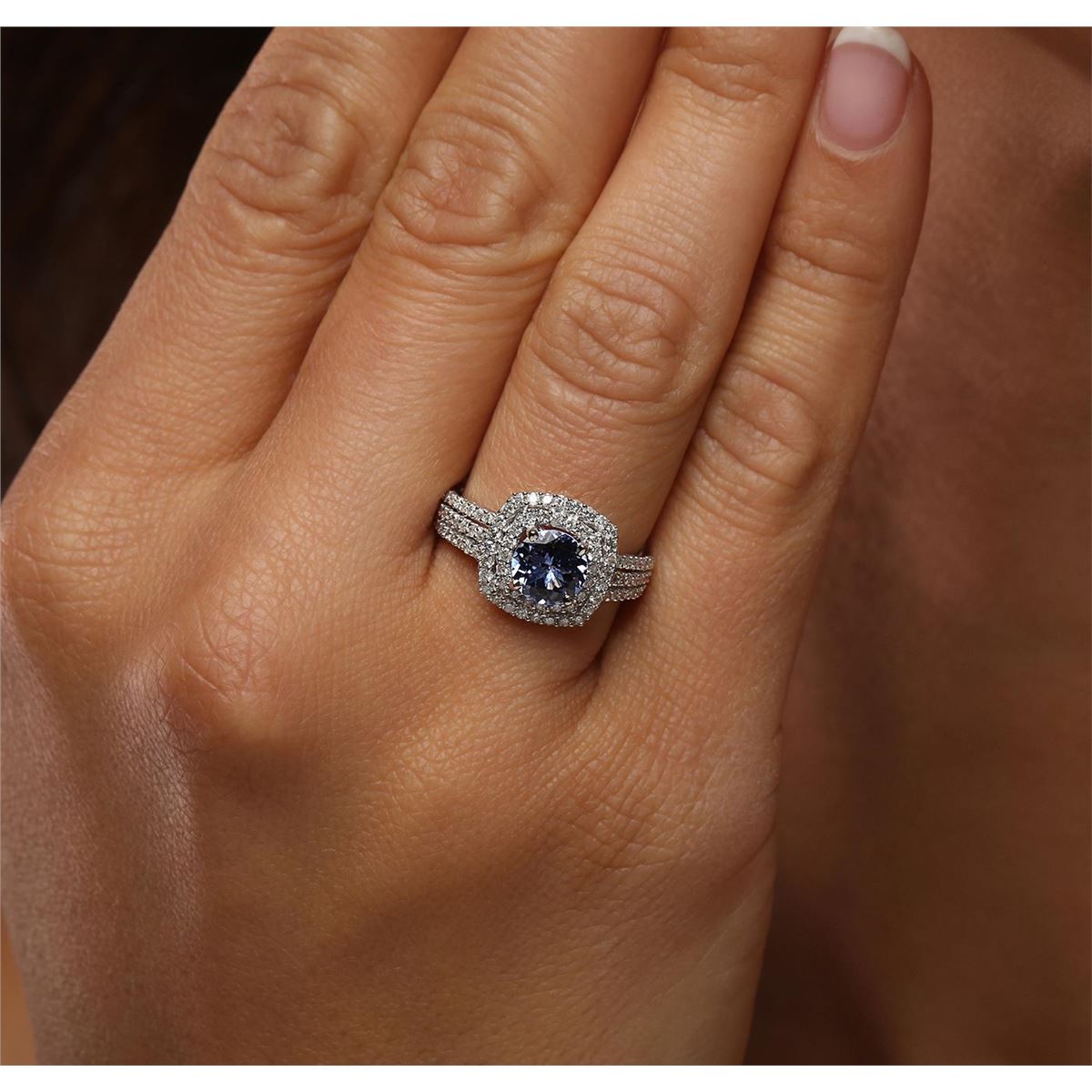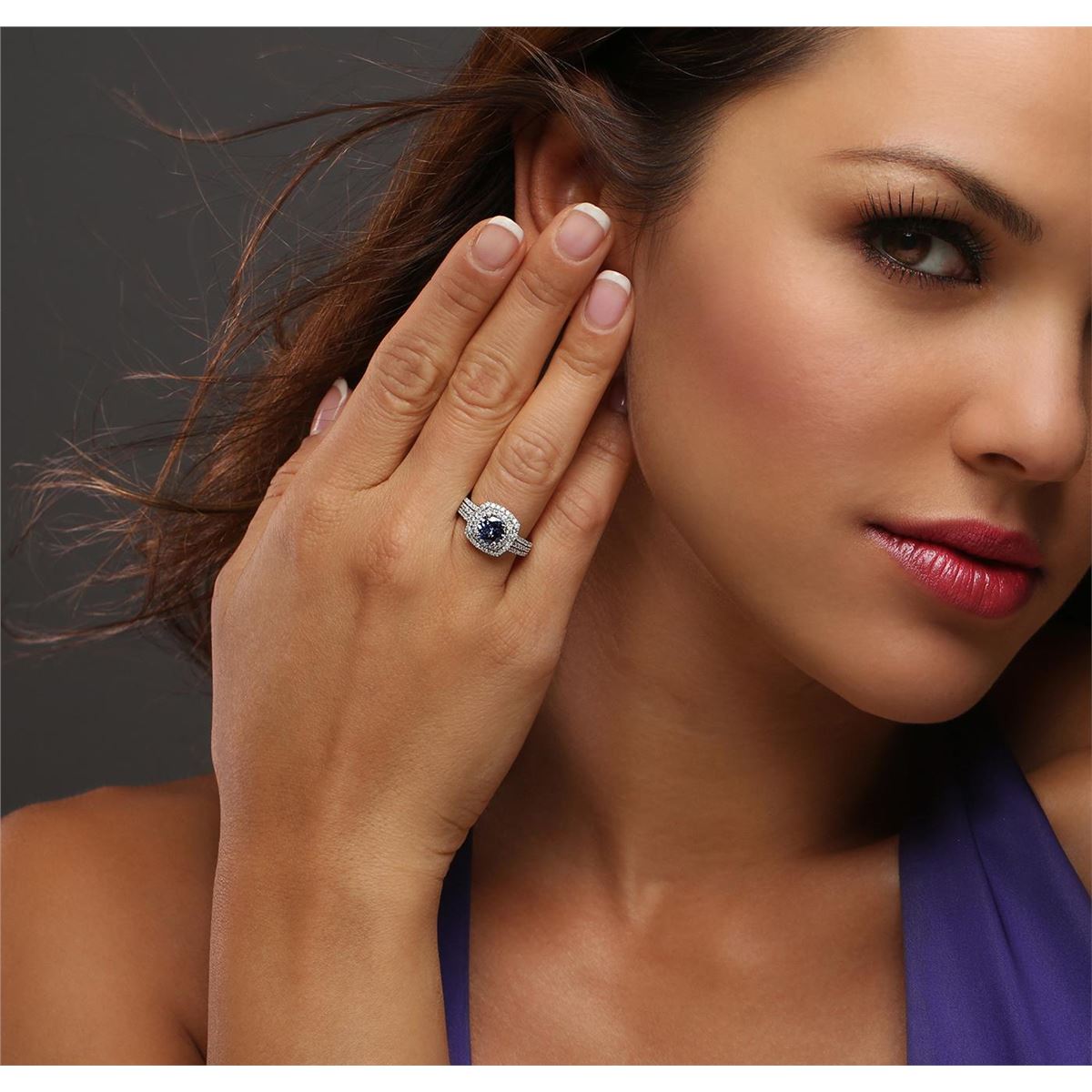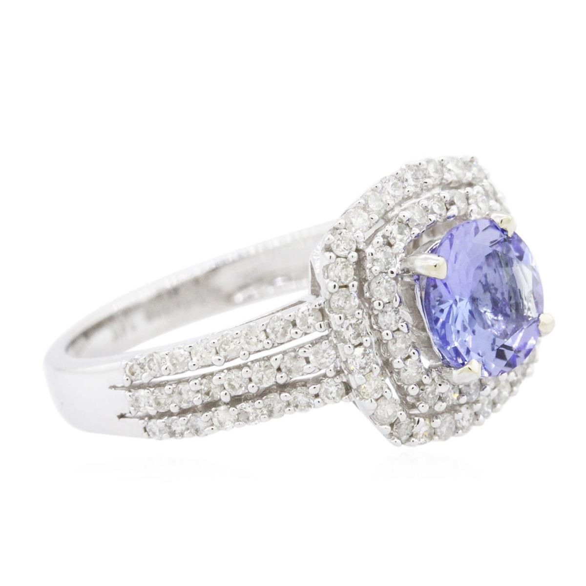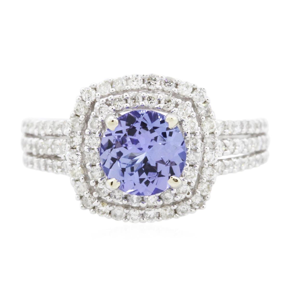 One electronically tested 14KT white gold ladies combination cast & assembled tanzanite and diamond ring with a flat shank with a bright polish finish. Identified with markings of "14K". Condition is new. Containing: One prong set round modified brilliant cut natural tanzanite, measuring 6.98 - 6.90 x 4.51 mm, approximate weight of 1.47ct., clarity is eye clean, type I, medium light, very slightly grayish, violet color, (GIA V 4/3), cut is very good. Ninety-Six prong set round brilliant cut diamonds, measuring 1.10 - 1.10 x 0.66mm (depth est.) approximate total weight of 96 Stones = 0.46ct. Clarity: I-1 to I-2. Color: I - J, Cut is Good. Colored gemstones are presumed to have been subjected to commonly used enhancement processes. All diamonds and colored gemstones are graded in the mounting, unless otherwise stated. Total Weight of Colored Stones 1.47ct. Total Weight of Diamonds 0.46ct. Total Weight of Ring 3.70 grams. GGL Appraised at $4,695.00.