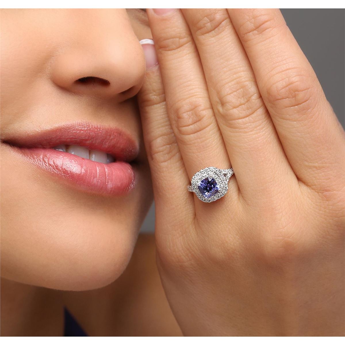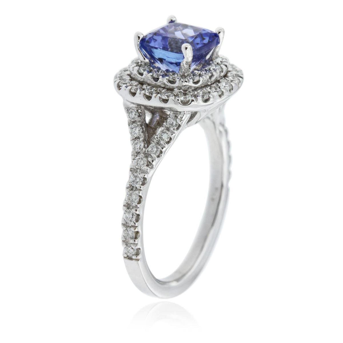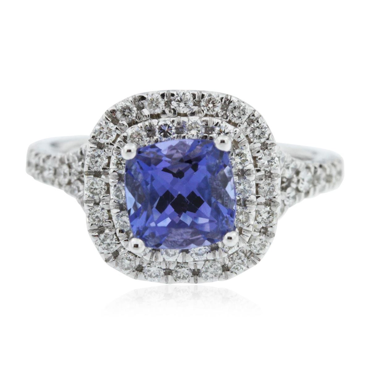One electronically tested 14KT white gold ladies cast tanzanite and diamond ring with a bright polish finish. Identified with markings of "14KT". Condition is new. Containing: One prong set square cushion modified brilliant cut natural tanzanite, measuring 6.60 x 6.60 x 4.29mm, approximate weight of 1.47ct., clarity is eye clean, type I, medium light, very slightly grayish, violet color, (GIA V 4/3), cut is very good. Sixty prong set round brilliant cut diamonds, measuring 1.50 - 1.50 x 0.90mm (depth est.) approximate total weight of 60 Stones = 0.74ct. Clarity: SI-1 to I-1. Color: I - J, Cut is Good. Colored gemstones are presumed to have been subjected to commonly used enhancement processes. All diamonds and colored gemstones are graded in the mounting, unless otherwise stated. Total Weight of Colored Stones 1.47ct. Total Weight of Diamonds 0.74ct. Total Weight of Ring 5.30 grams. GGL Appraised at $4,010.00.