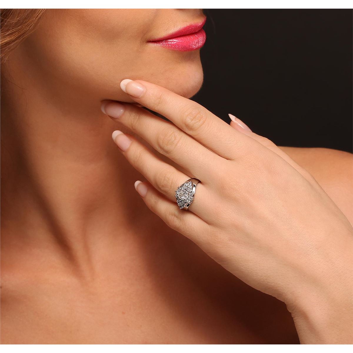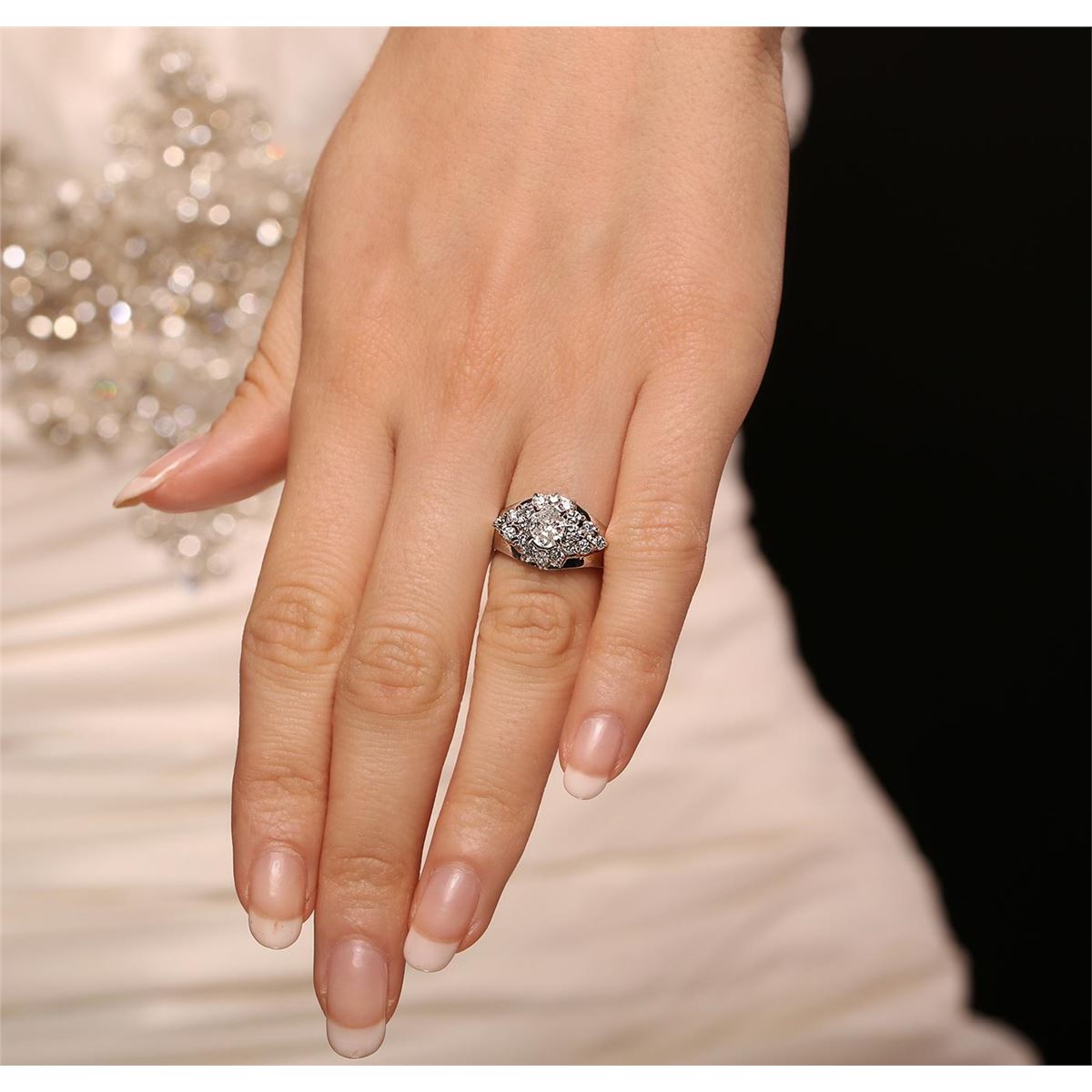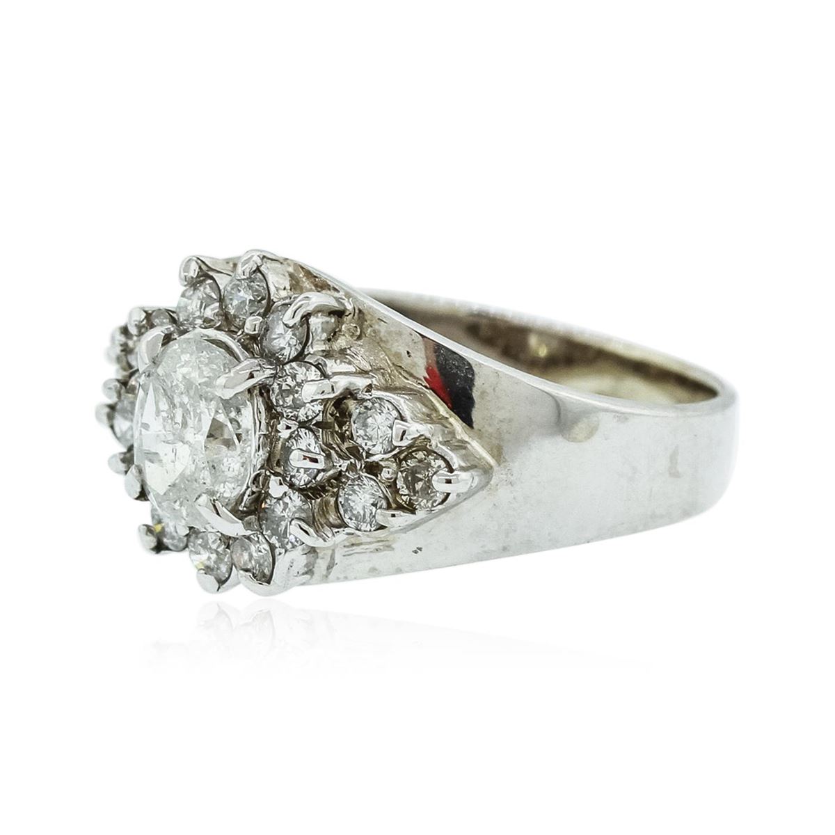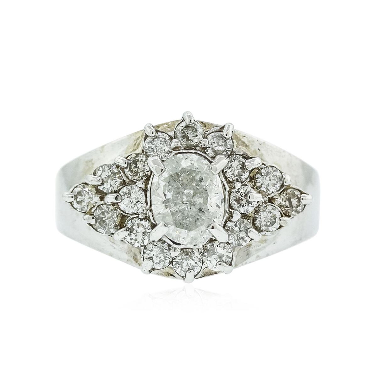 One electronically tested 14KT white gold ladies cast diamond ring with a bright polish finish. Condition is good. The featured diamond is set within a stylized diamond cluster, completed by a three millimeter wide band. Identified with markings of "14K". Containing: One prong set oval shaped cut diamond, measuring 6.30 x 5.00 x 3.15mm (depth est.) approximate weight of 0.79ct. Graded in the setting. Clarity: I-2. Color: IDepth 63.0%. Table 64.0%. Eighteen prong set round brilliant cut diamonds, measuring 2.10 - 2.00 x 1.23mm (depth est.) approximate. Total Weight of 18 Stones = 0.68ct. Graded in the setting. Clarity: SI-2 to I-1. Color: I - K. Total Weight of Diamonds 1.47ct. Total Weight of Ring 5.33 grams. AIG Appraised at $5,950.00.