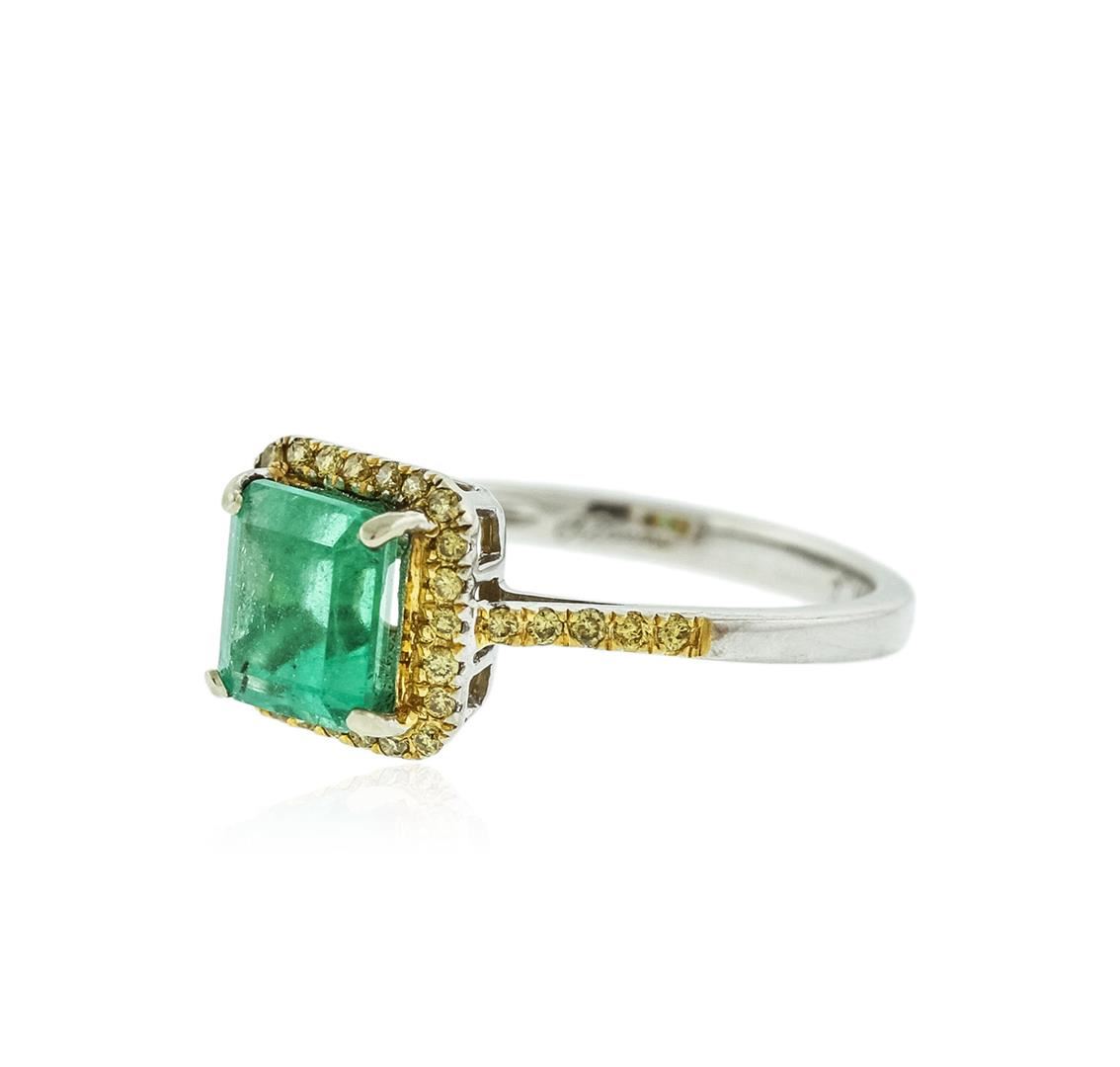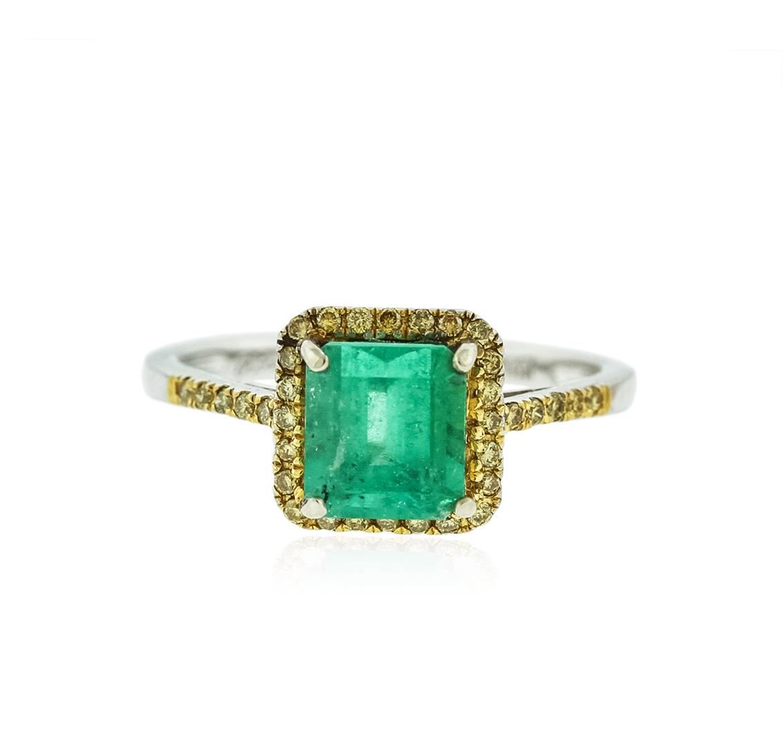 One electronically tested 14KT white gold ladies cast emerald and diamond ring. The featured emerald is set within a diamond bezel supported by diamond set shoulders, completed by a two millimeter wide band. Bright polish finish with yellow gold accents. Trademark is Orianne. Identified with markings of "14K". Condition is new, good workmanship. Containing: One prong set emerald step cut natural emerald, measuring 6.95 x 6.20 x 4.65mm, approximate weight of 1.48ct., clarity is moderately included, type III, medium dark, very slightly grayish, very slightly bluish green color, (GIA vslbG 6/3), cut is good. Transmitting light with a minimum of distortion, transparent. Naturally occurring internal & external characteristics are present. Indications of oil residue. Graded in the setting. Thirty-Four prong set round brilliant cut diamonds, measuring 1.10 - 1.00 x 0.63mm (depth est.) approximate total weight of 34 Stones = 0.18ct. Color grade is an average for the group. Indications of laboratory irradiated enhanced color. Graded in the setting. Clarity: SI-1 to I-1. Total Weight of Colored Stones 1.48ct. Total Weight of Diamonds 0.18ct. Total Weight of Ring 3.14gm. AIG Appraised at $2,960.00.