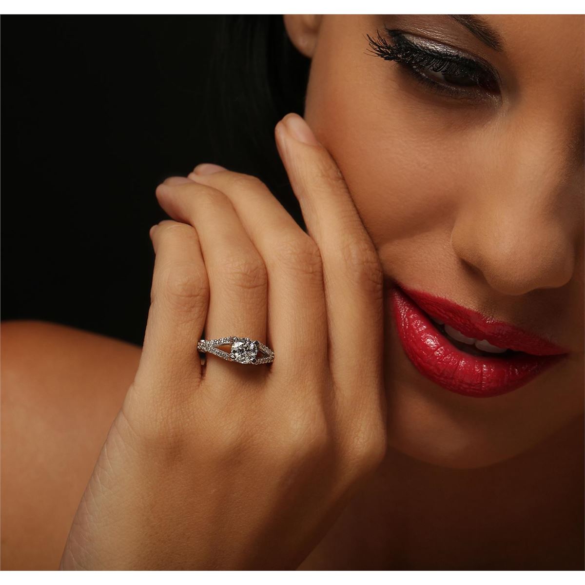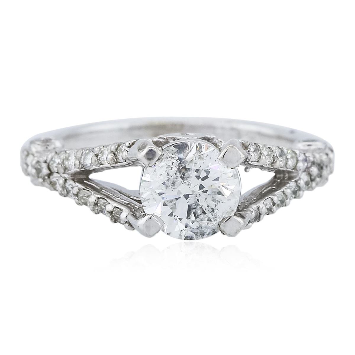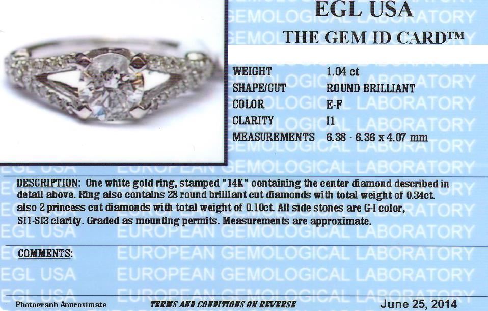 One electronically tested 14KT white gold Ladies combination cast & assembled engagement ring with a bright polish finish. Condition is new. Identified with markings of "14K". Containing: One prong set round brilliant cut diamond, measuring 6.38 - 6.36 x 4.07mm (depth est.) approximate weight of 1.04ct. Clarity: I-1. Color: E, Cut is Good. Twenty-Eight prong set round brilliant cut diamonds, measuring 1.50 - 1.50 x 0.90mm (depth est.) approximate. Total Weight of 28 Stones = 0.34ct. Clarity: SI-1 to SI-3. Color: G - I, Cut is Good. Two prong set princess cut diamonds, measuring 2.00 x 2.00 x 1.50mm (depth est.) approximate. Total Weight of 2 Stones = 0.10ct. Clarity: SI-1 to SI-3. Color: G - I, Cut is Good. EGL USA GEM ID# US 911348420D. All diamonds are graded in the mounting, unless otherwise stated. Total Weight of Diamonds 1.48ct. Total Weight of Engagement Ring 3.80 grams. GGL Appraised at $22,550.00.