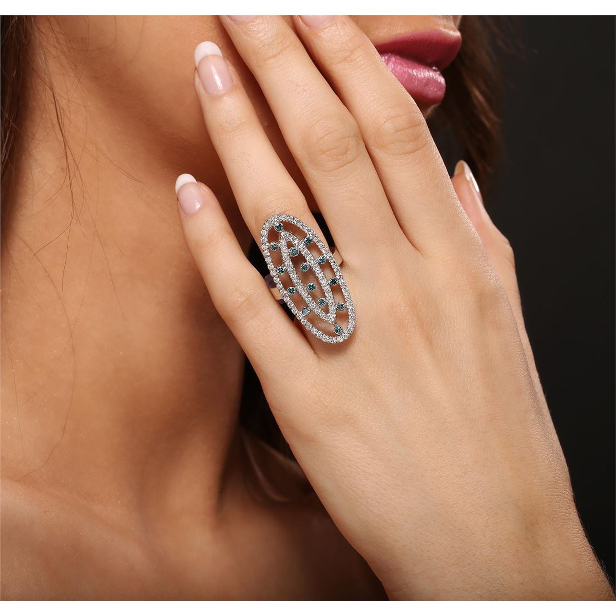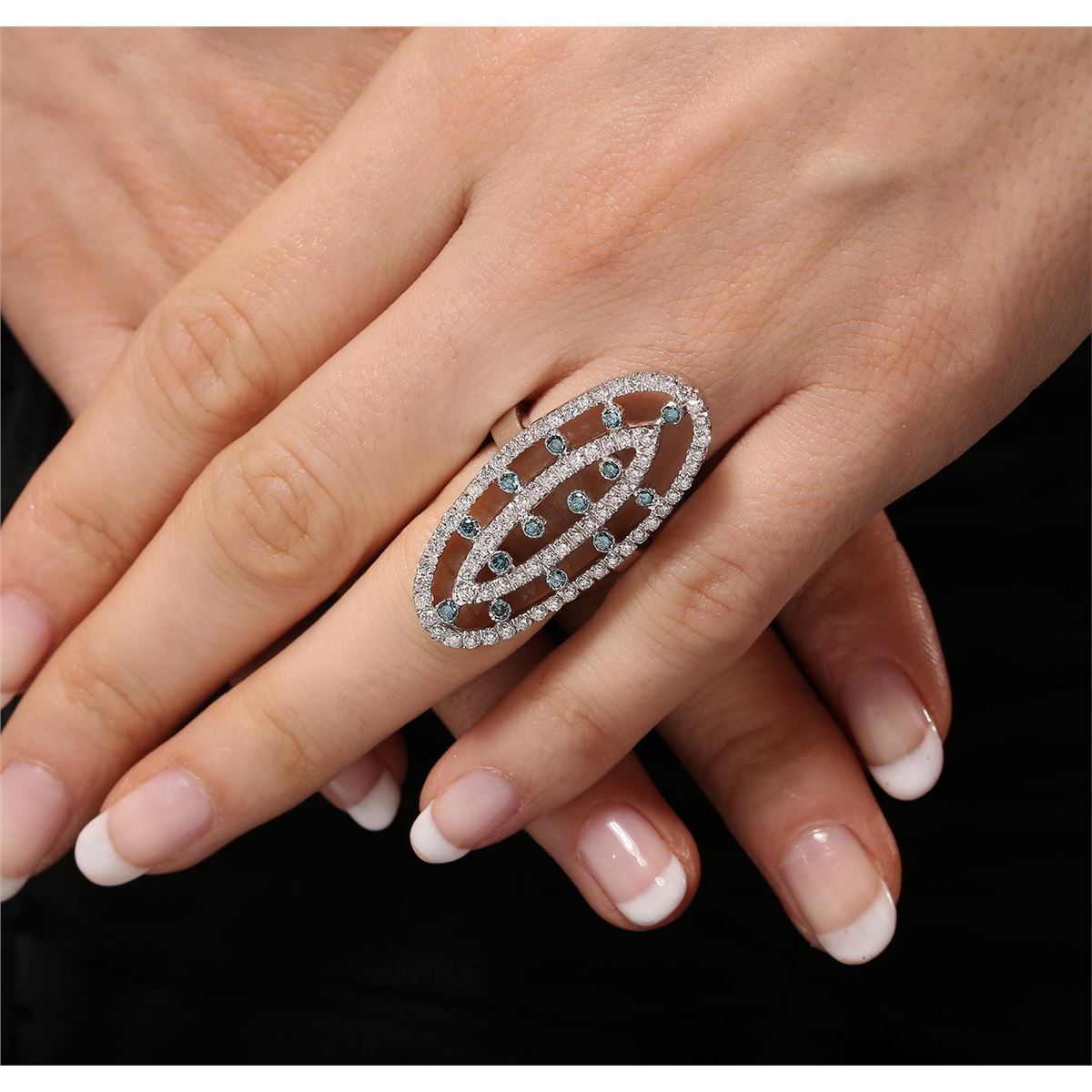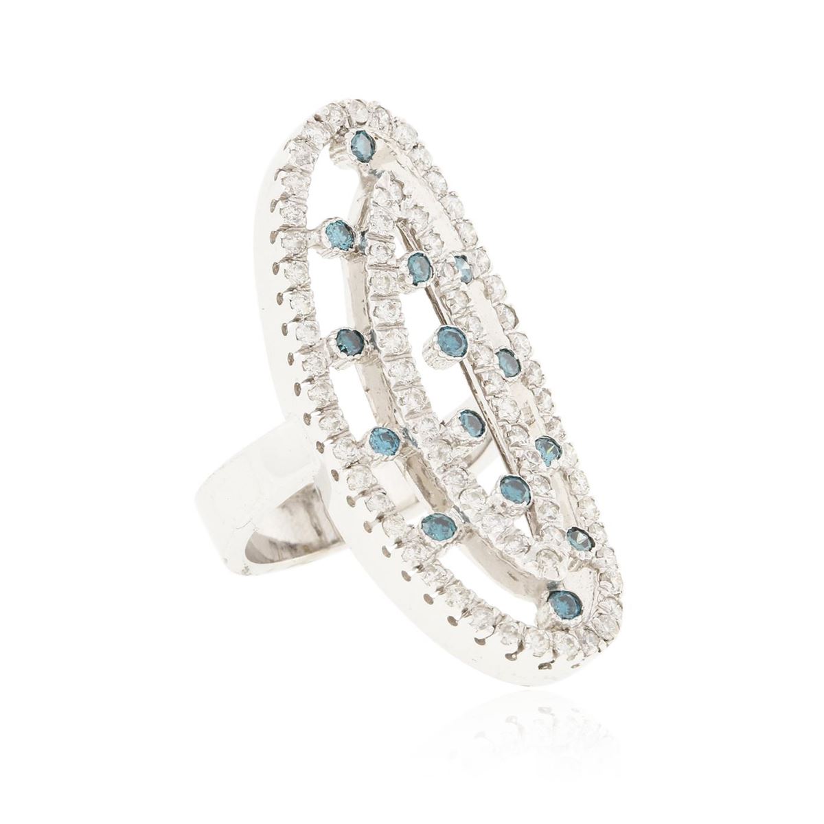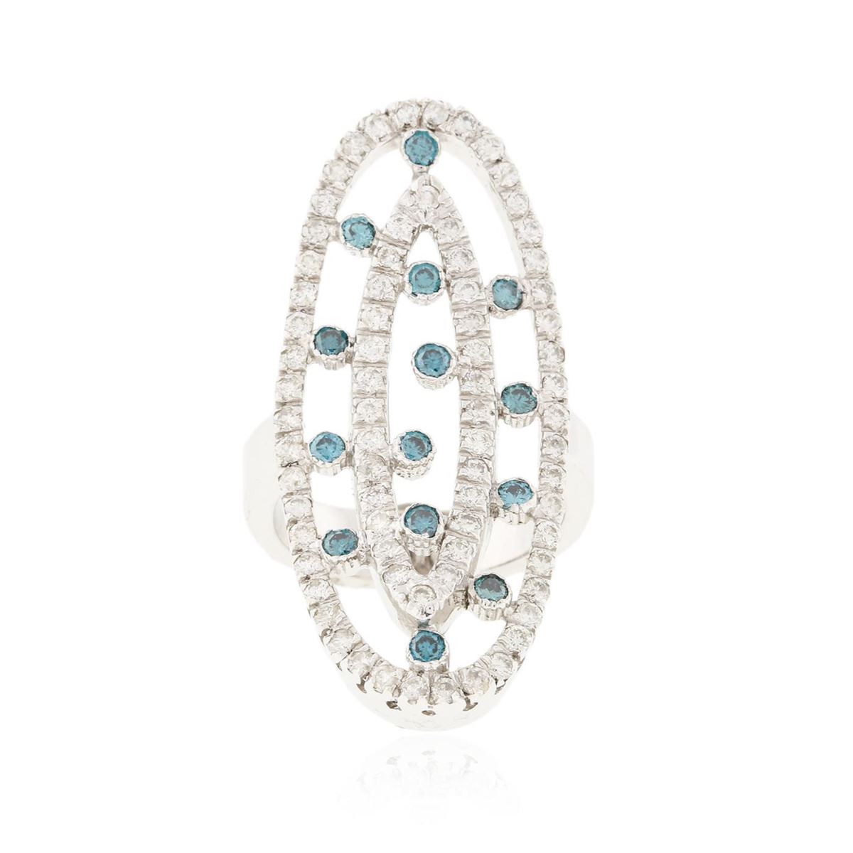 One electronically tested 14KT white gold ladies cast diamond ring with a bright polish finish. Condition is good. The ring features two diamond orbits interspersed with randomly placed diamonds, completed by a four and one-half millimeter wide band. Identified with markings of "K14". Containing: Fourteen bezel set round brilliant cut diamonds, measuring 1.90 - 1.80 x 1.11min (depth est.) approximate total weight of 14 Stones = 0.39ct. Indications of laboratory irradiated enhanced color. Graded in the setting. Clarity SI-1 to I-1. Color Fancy Very Slightly Greenish Blue Seventy-four prong set round brilliant cut diamonds, measuring 1.60 - 1.50 x 0.93mm (depth est.) approximate total weight of 74 Stones = 1.10ct. Graded in the setting. Clarity I-1 to I-2. Color G - I. Total Weight of Diamonds 1.49ct. Total Weight of Ring 10.90gm. AIG Appraised at $5,700.00.