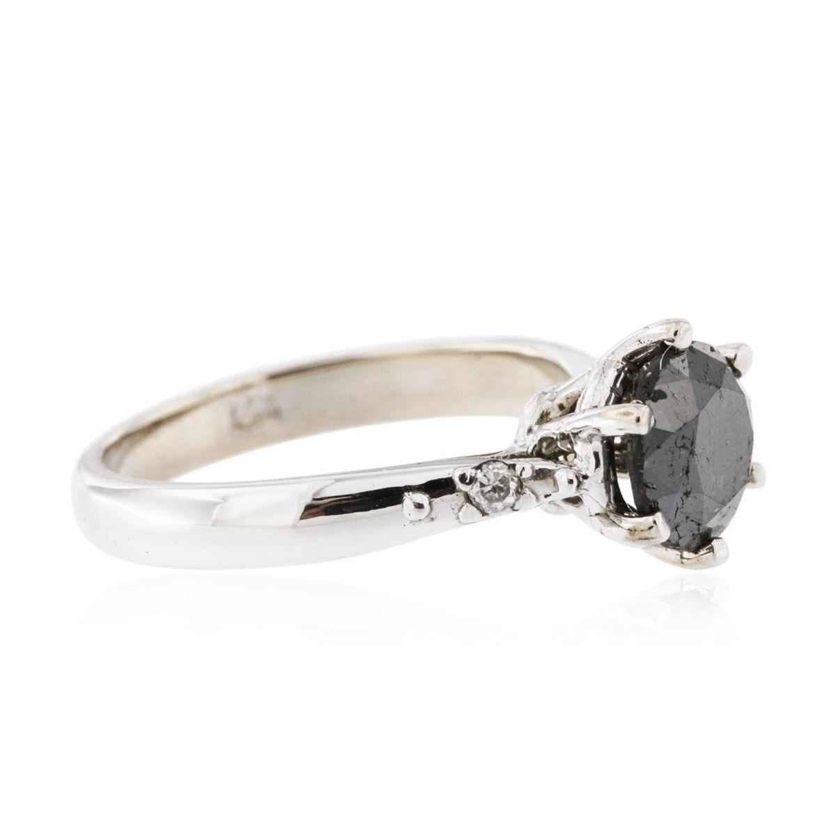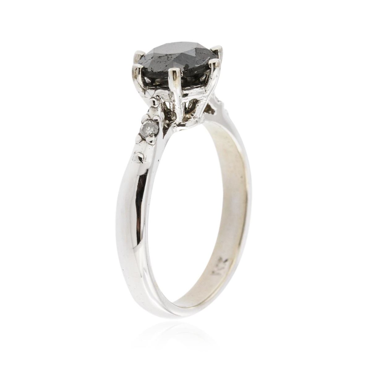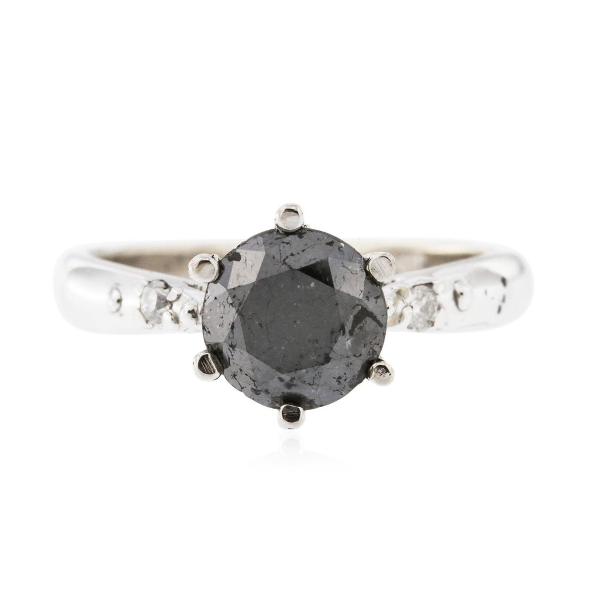 One electronically tested 14KT white gold ladies cast black and white diamond ring with a bright finish. Condition is new, good workmanship. The cathedral set black diamond is accented by a single white diamond on either side completed by a two and one-half millimeter wide band. Identified with the markings of "14K". Containing: prong set round brilliant cut diamond, measuring 7.20 - 7.15 x 4.50mm (depth est.), 6.00% GTCF approximate weight of 1.50ct. Indications of multiple laboratory enhancements. Graded in the setting. Clarity Declasse. Color fancy black; irradiated. Depth 62.6%. Table 59.8%. Two bead set round brilliant cut diamonds, measuring 1.90 - 1.90 x 1.14mm (depth est.) approximate total weight of 2 stones = 0.05ct. Graded in the setting. Clarity I-3. Color J. Total weight of diamonds 1.55ct. Total weight of ring 3.90gm. AIG Appraised at $1,960.00.