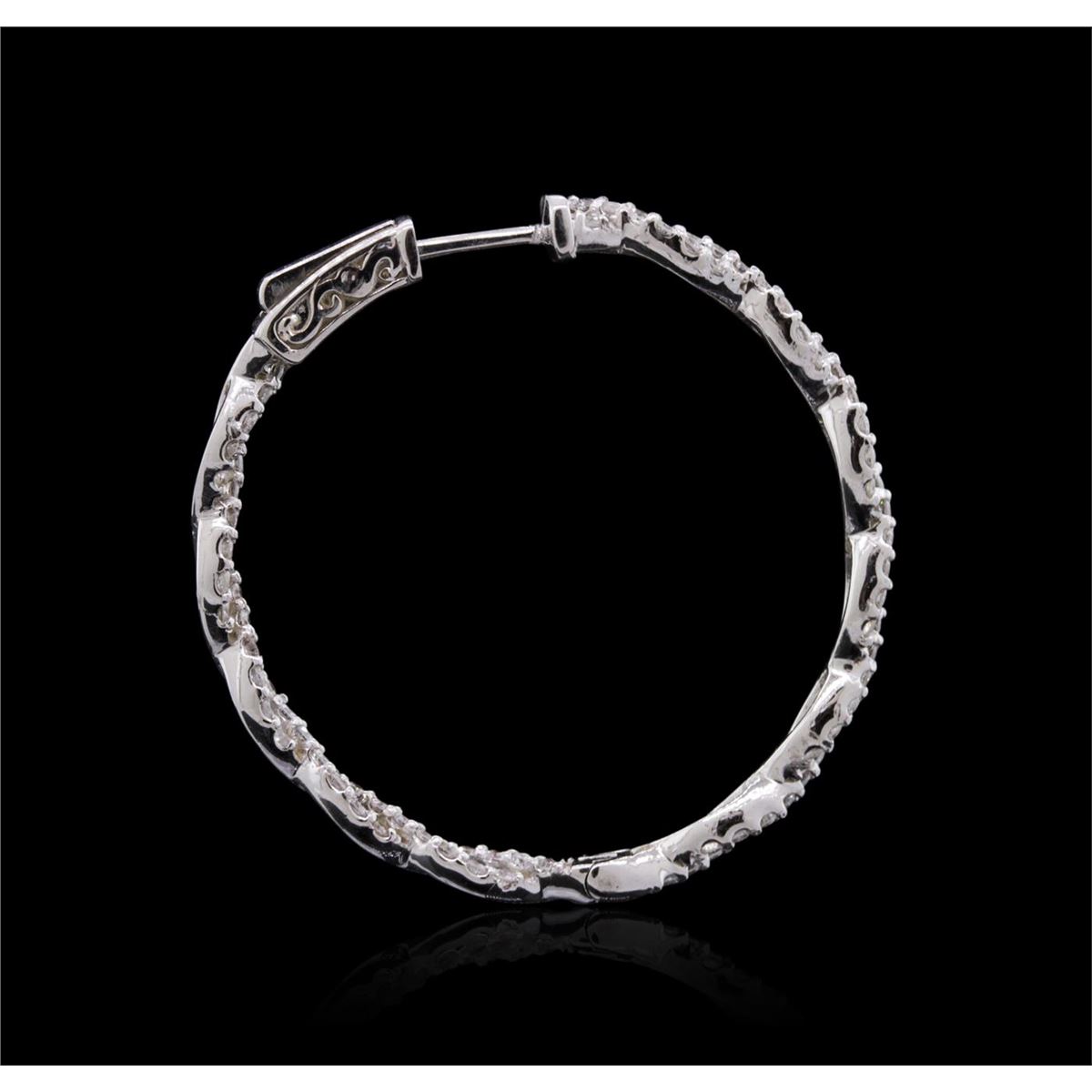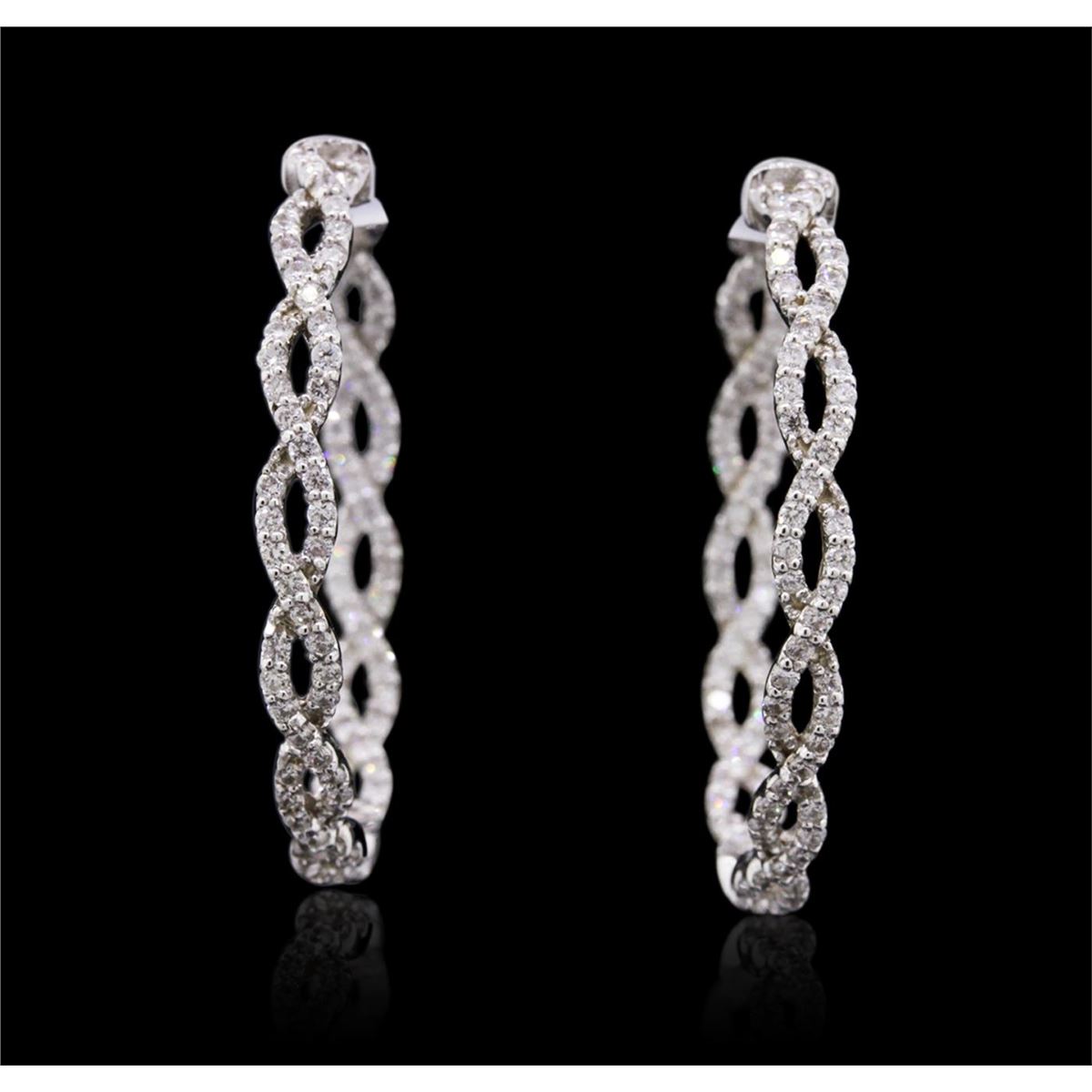 One pair electronically tested 14KT white gold ladies combination cast & assembled diamond hoop earrings with hinged clip backs with a bright polish finish. Identified with markings of "K14". Condition is new. Containing: One Hundred Eighty-Eight prong set round brilliant cut diamonds, measuring 1.30 - 1.30 x 0.78mm (depth est.) approximate total weight of 188 Stones = 1.50ct. Clarity: I-1. Color: H - I, Cut is Good. All diamonds are graded in the mounting, unless otherwise stated. Total Weight of Diamonds 1.50ct. Total Weight of Earrings 8.60 grams. GGL Appraised at $5,765.00.