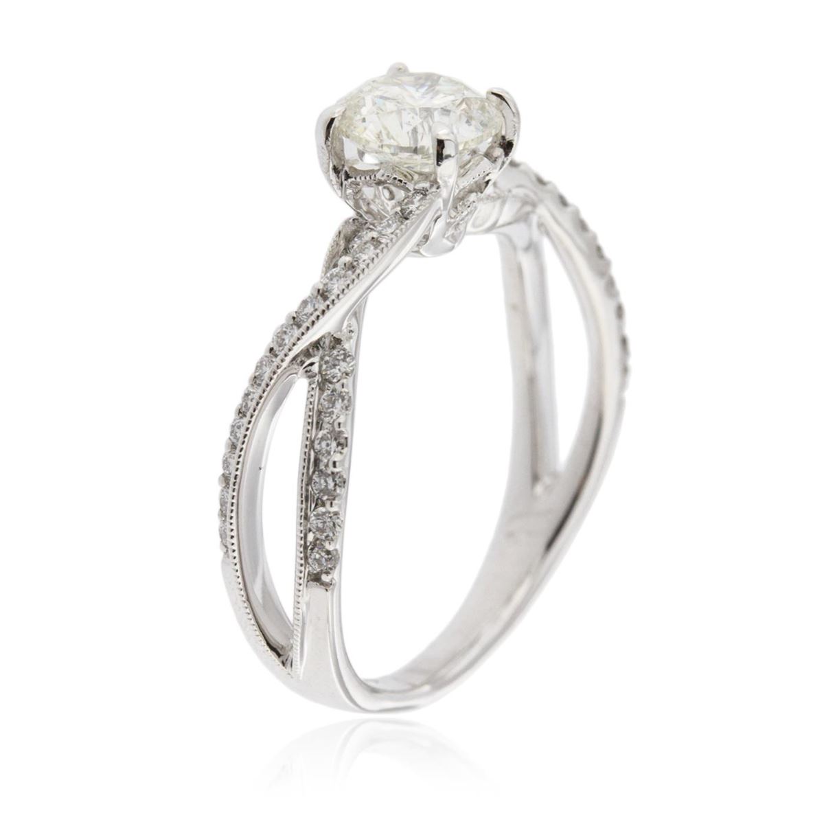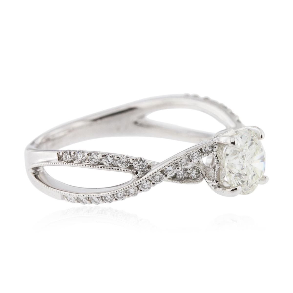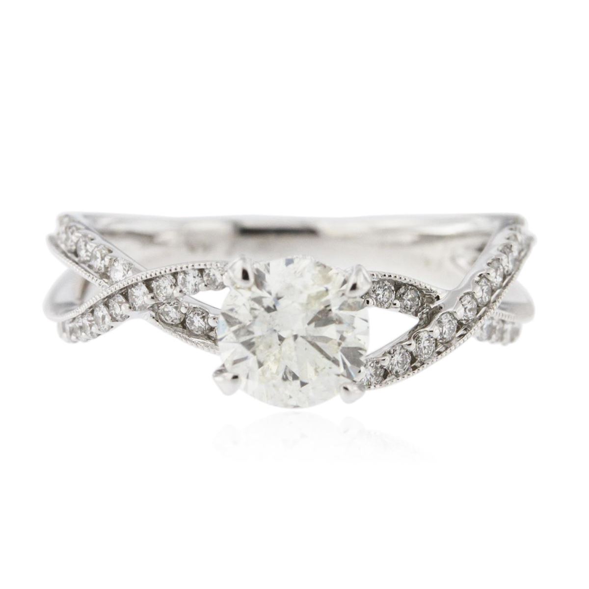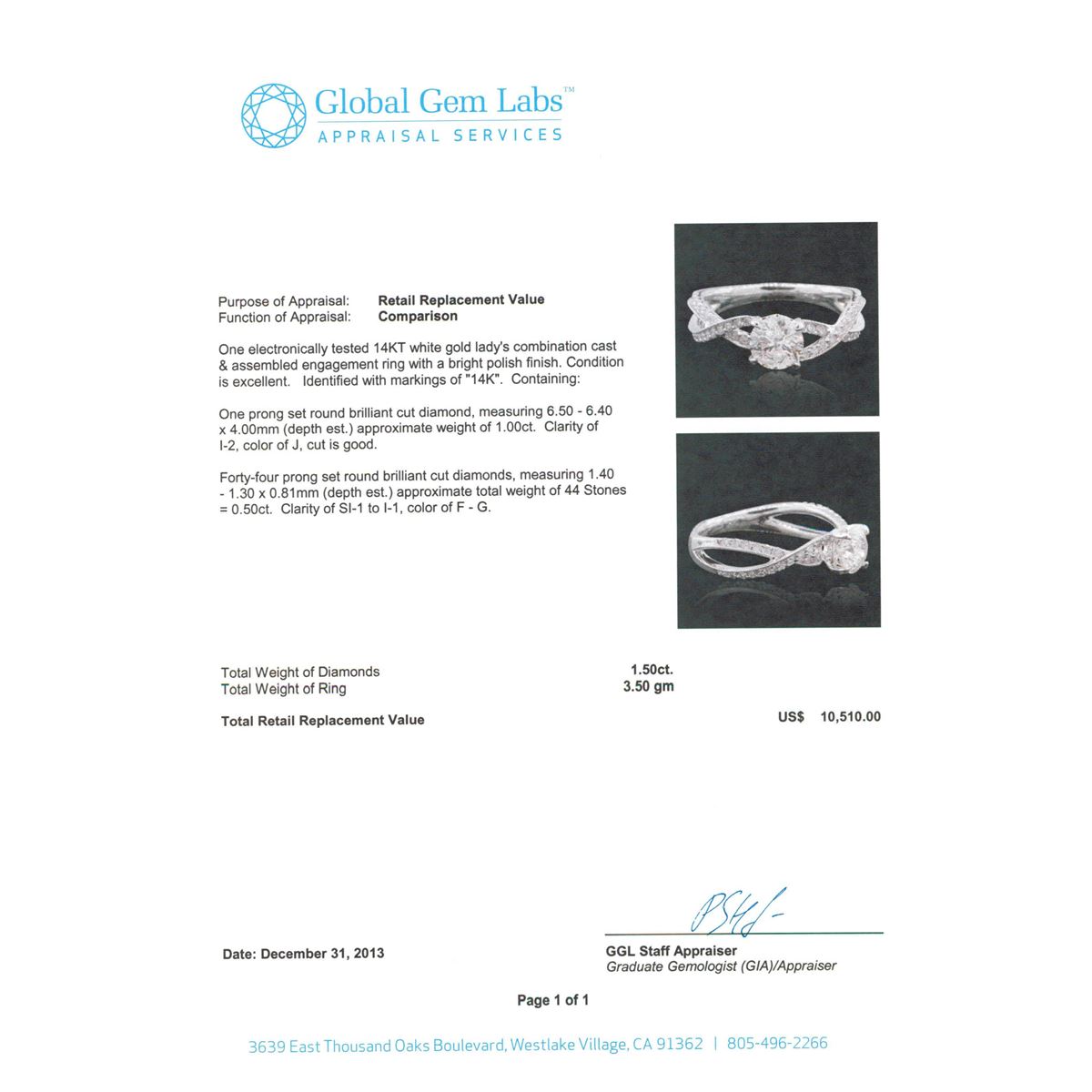 One electronically tested 14KT white gold Ladies combination cast & assembled engagement ring with a bright polish finish. Identified with markings of "14K". Condition is excellent. Containing: One prong set round brilliant cut diamond, measuring 6.50 - 6.40 x 4.00mm (depth est.) approximate weight of 1.00ct. Clarity of I-2, Color of J, Cut is Good. Forty-Four prong set round brilliant cut diamonds, measuring 1.40 - 1.30 x 0.81mm (depth est.) approximate total weight of 44 Stones = 0.50ct. Clarity of SI-1 to I-1, Color of F - G. Total Weight of Diamonds 1.50ct. Total Weight of Ring 3.50gm. GGL Appraised at $10,510.00.