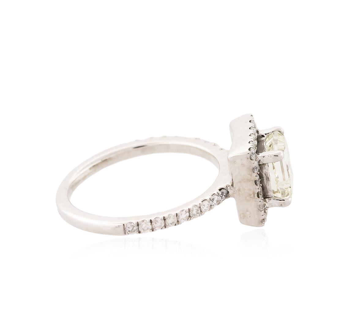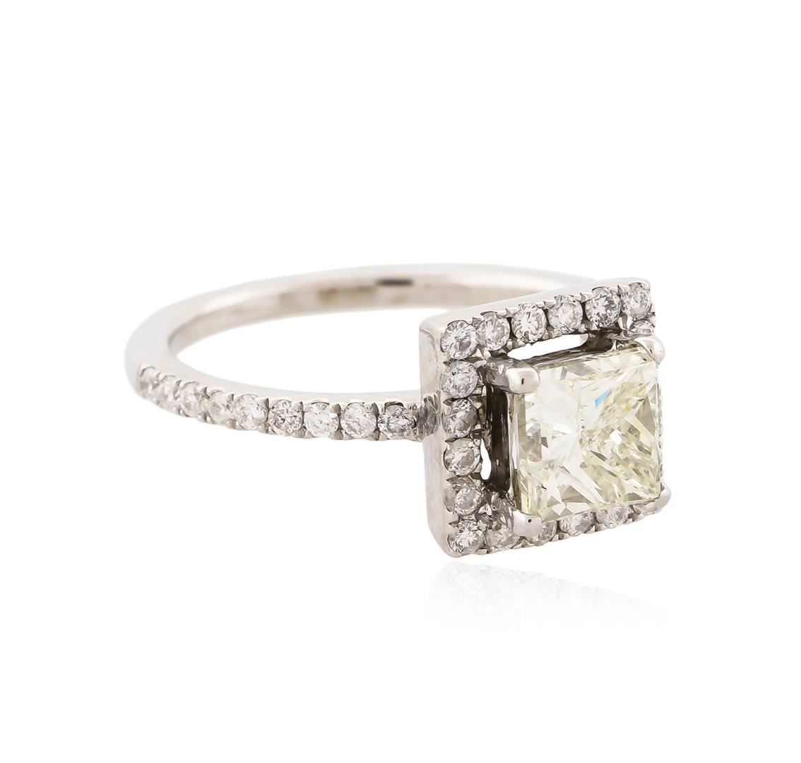 One electronically tested 14KT white gold ladies cast diamond engagement ring with a bright polish finish. Identified with markings of "585". Condition is new. Containing: One prong set princess cut diamond, measuring 5.80 x 5.80 x 4.35mm (depth est.) approximate weight of 1.20ct. Clarity: I-1. Color: M, Cut is Good. Thirty-Eight prong set round brilliant cut diamonds, measuring 1.30 - 1.30 x 0.78mm (depth est.) approximate total weight of 38 Stones = 0.30ct. Clarity: SI-2 to I-1. Color: I - J, Cut is Good. All diamonds are graded in the mounting, unless otherwise stated. Total Weight of Diamonds 1.50ct. Total Weight of Engagement Ring 3.50 grams. GGL Appraised at $6,185.00.