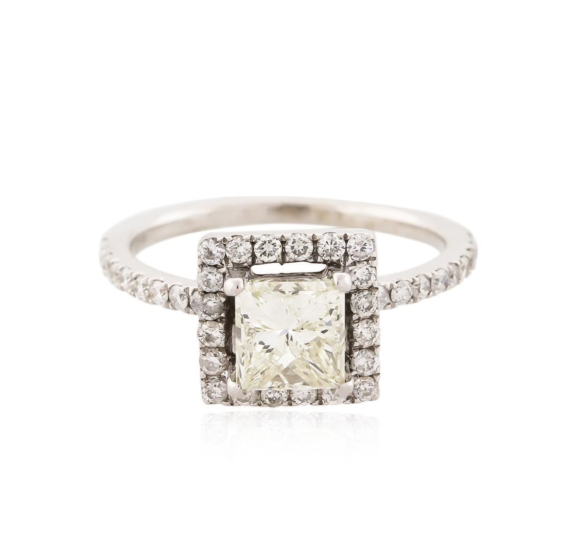 One electronically tested 14KT white gold ladies cast diamond engagement ring with a bright polish finish. Identified with markings of "585". Condition is new. Containing: One prong set princess cut diamond, measuring 5.80 x 5.80 x 4.35mm (depth est.) approximate weight of 1.20ct. Clarity: I-1. Color: M, Cut is Good. Thirty-Eight prong set round brilliant cut diamonds, measuring 1.30 - 1.30 x 0.78mm (depth est.) approximate total weight of 38 Stones = 0.30ct. Clarity: SI-2 to I-1. Color: I - J, Cut is Good. All diamonds are graded in the mounting, unless otherwise stated. Total Weight of Diamonds 1.50ct. Total Weight of Engagement Ring 3.50 grams. GGL Appraised at $6,185.00.
