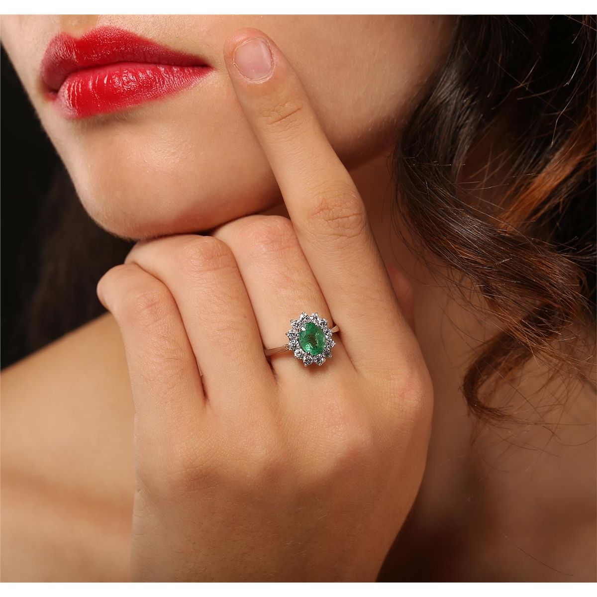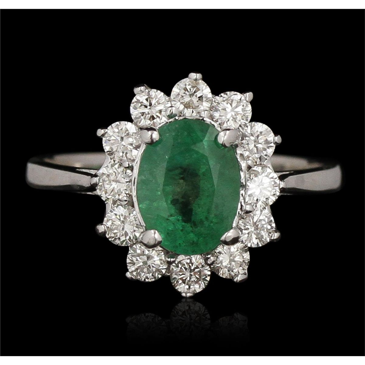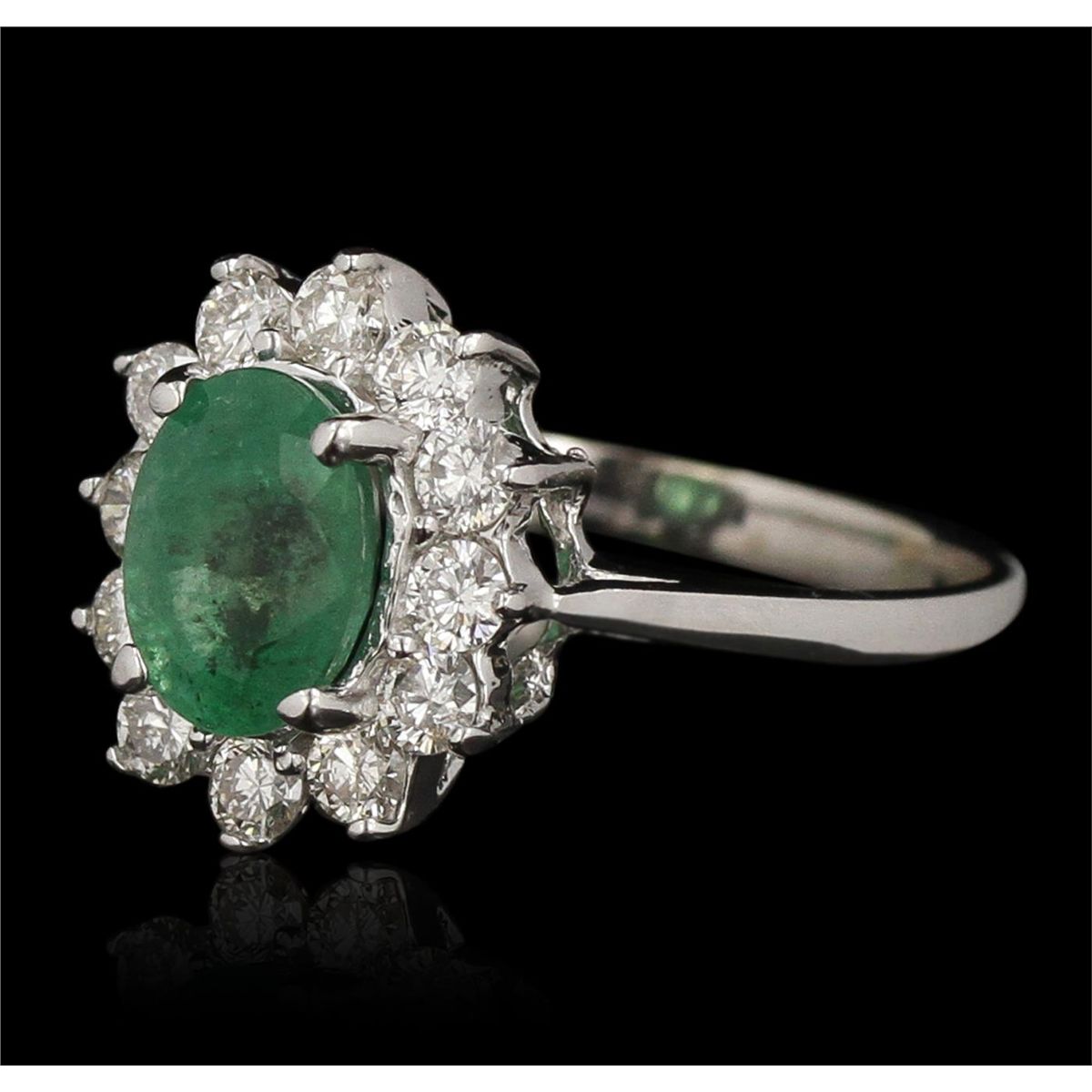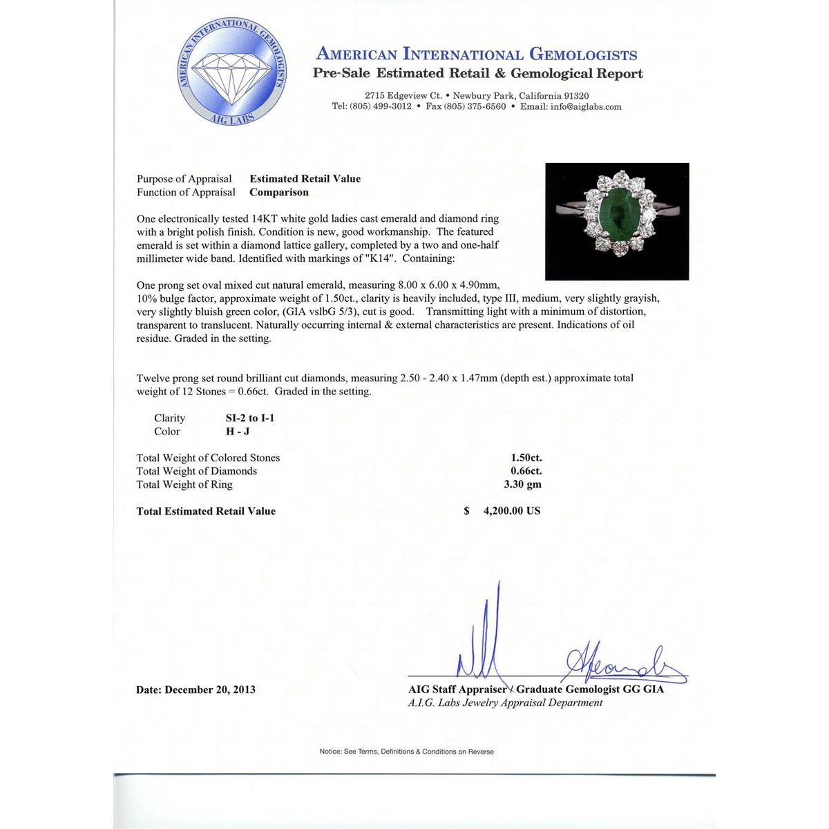 One electronically tested 14KT white gold ladies cast emerald and diamond ring with a bright polish finish. Condition is new, good workmanship. The featured emerald is set within a diamond lattice gallery, completed by a two and one-half millimeter wide band. Identified with markings of "K14". Containing: One prong set oval mixed cut natural emerald, measuring 8.00 x 6.00 x 4.90mm, 10% bulge factor, approximate weight of 1.50ct, clarity is heavily included, type III medium, very slightly grayish, very slightly bluish green color, (GIA vslbG 5/3), cut is good. Transmitting light with a minimum of distortion, transparent to translucent. Naturally occurring internal & external characteristics are present. Identifications of oil residue. Graded in the setting. Twelve prong set round brilliant cut diamonds, measuring 2.50 - 2.40 x 1.47mm (depth est.) approximate total weight of 12 Stones = 0.66ct. Graded in the setting. Clarity SI-2 to I-1. Color H - J. Total Weight of Colored Stones 1.50ct. Total Weight of Diamonds 0.66ct. Total Weight of Ring 3.30 grams. AIG Appraised at $4,200.00.
