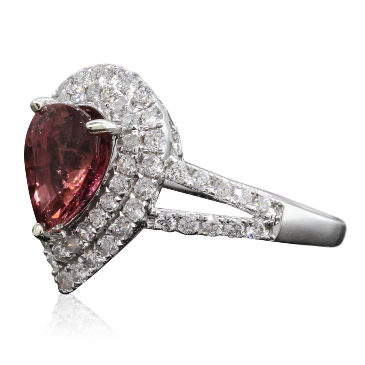 One electronically tested 14KT white gold ladies cast tourmaline and diamond ring with a bright polish finish. Condition is new, good workmanship. The featured tourmaline is set within tiered diamond bezels supported by diamond set split shoulders, completed by a one and one-half millimeter wide band. Identified with markings of "14K". Containing: One prong set pear mixed cut natural rubellite, measuring 9.00 x 6.50 x 4.00mm, 5%. bulge factor, approximate weight of 1.50ct., clarity is slightly included, type III, medium dark, very slightly brownish, strongly purplish red color, (GIA stpR 6/3), cut is good. Transmitting light with a minimum of distortion, transparent. Naturally occurring internal & external characteristics are present. Graded in the setting. Sixty-Five prong set round brilliant cut diamonds, measuring 1.50 - 1.20 x 0.81mm (depth est.) approximate. Total Weight of 65 Stones = 0.68ct. Graded in the setting. Clarity: SI-2 to I-2. Color: G - I. Total Weight of Colored Stones 1.50ct. Total Weight of Diamonds 0.68ct. Total Weight of Ring 3.72 grams. AIG Appraised at $3,575.00.