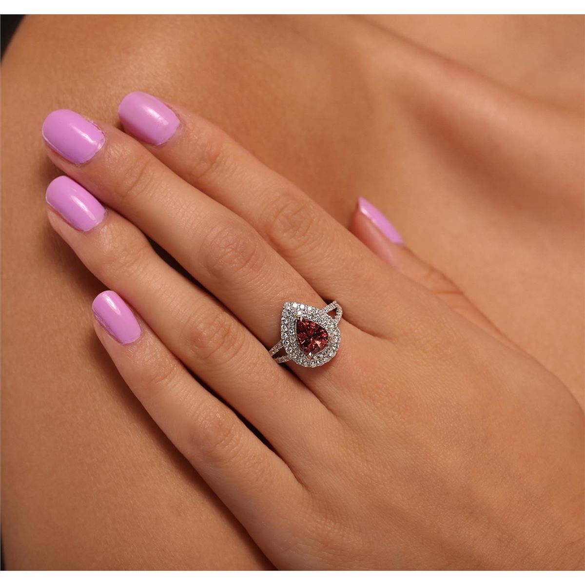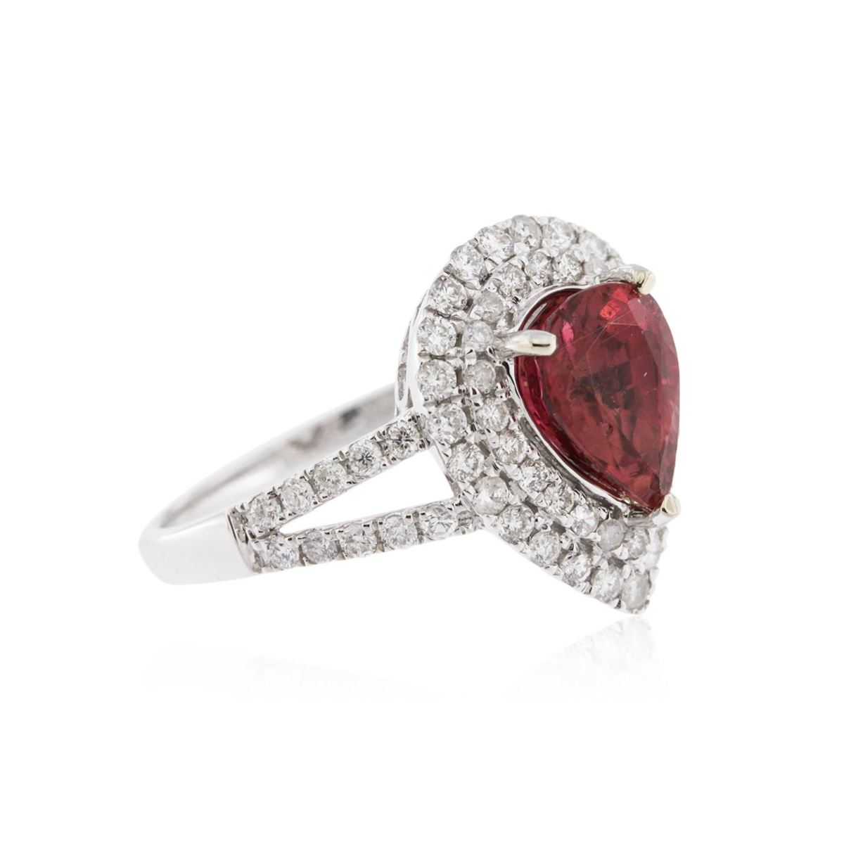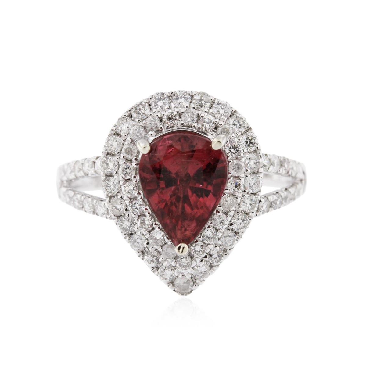 One electronically tested 14KT white gold ladies cast tourmaline and diamond ring with a bright polish finish. Condition is new, good workmanship. The featured tourmaline is set within tiered diamond bezels supported by diamond set split shoulders, completed by a one and one-half millimeter wide band. Identified with markings of "14K". Containing: One prong set pear mixed cut natural rubellite, measuring 9.00 x 6.50 x 4.00mm, 5%. bulge factor, approximate weight of 1.50ct., clarity is slightly included, type III, medium dark, very slightly brownish, strongly purplish red color, (GIA stpR 6/3), cut is good. Transmitting light with a minimum of distortion, transparent. Naturally occurring internal & external characteristics are present. Graded in the setting. Sixty-Five prong set round brilliant cut diamonds, measuring 1.50 - 1.20 x 0.81mm (depth est.) approximate. Total Weight of 65 Stones = 0.68ct. Graded in the setting. Clarity: SI-2 to I-2. Color: G - I. Total Weight of Colored Stones 1.50ct. Total Weight of Diamonds 0.68ct. Total Weight of Ring 3.72 grams. AIG Appraised at $3,575.00.