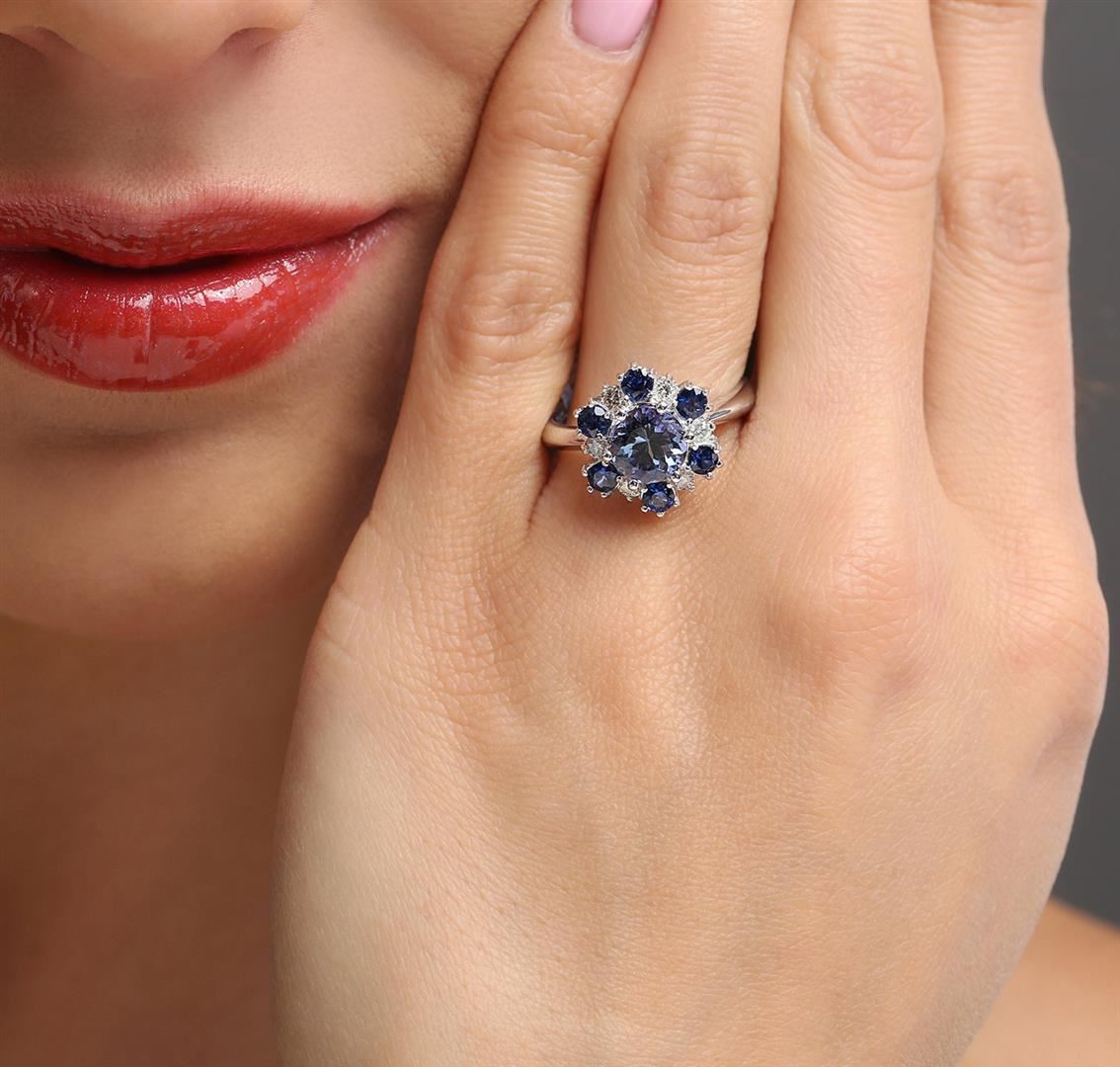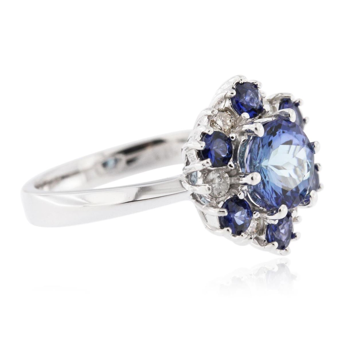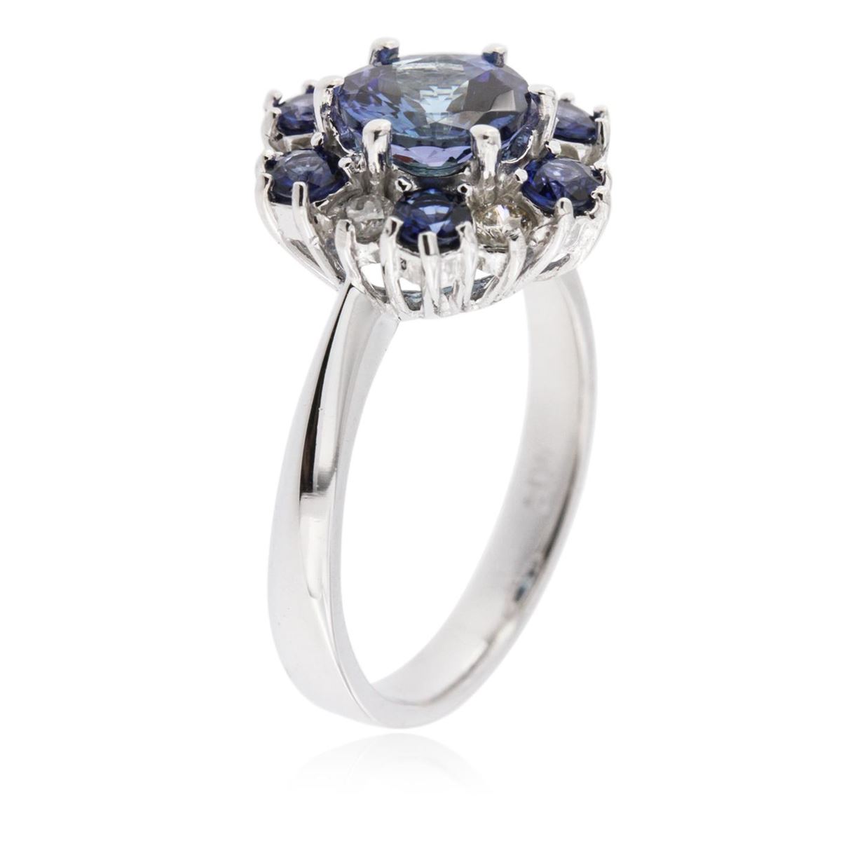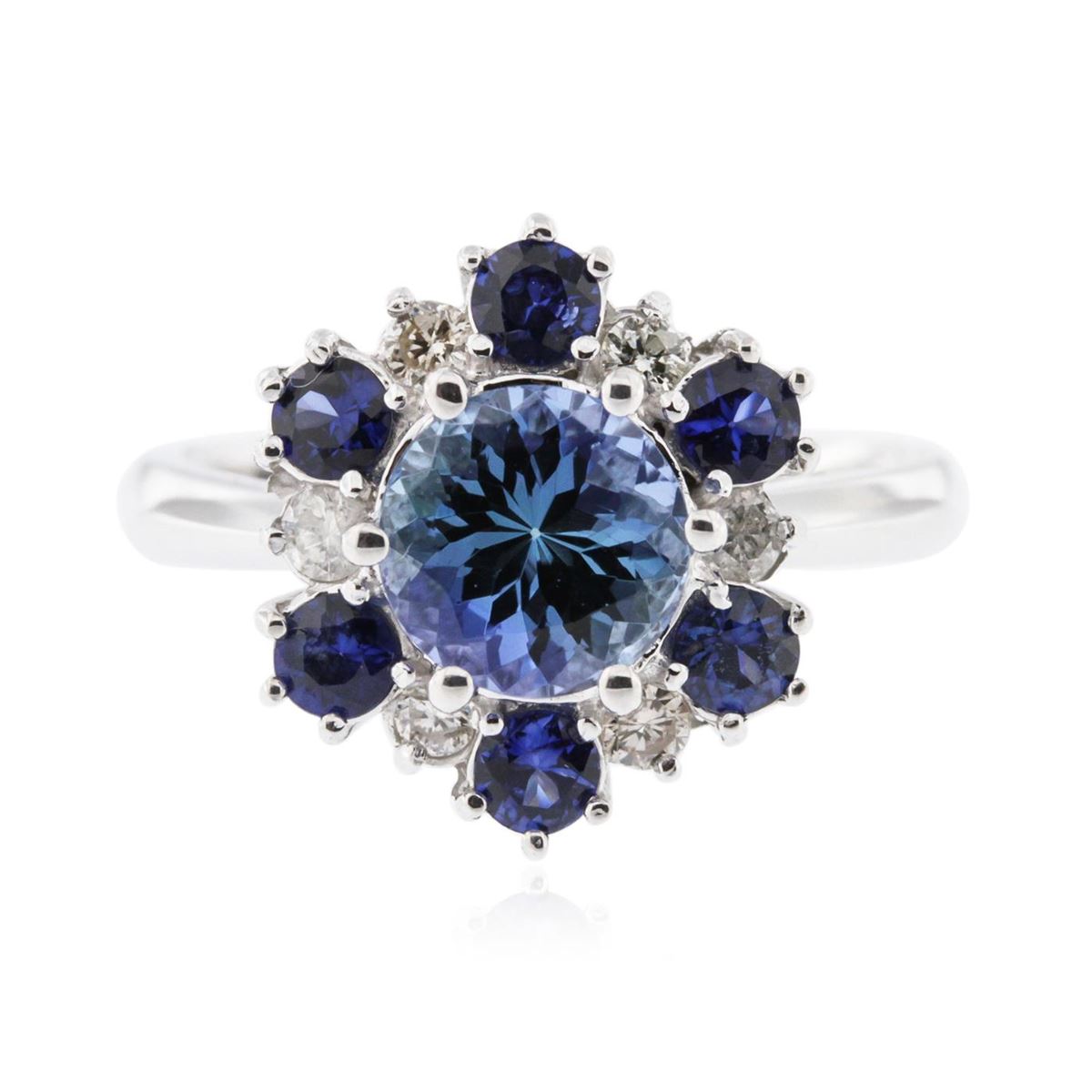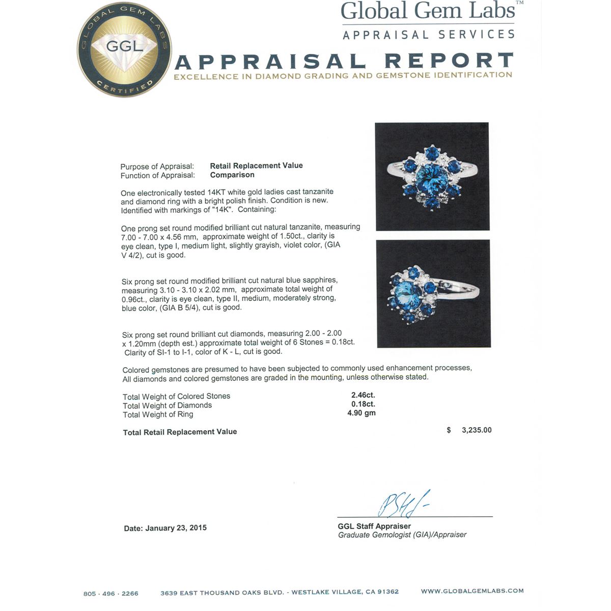 One electronically tested 14KT white gold ladies cast tanzanite and diamond ring with a bright polish finish. Identified with markings of "14K". Condition is new. Containing: One prong set round modified brilliant cut natural tanzanite, measuring 7.00 - 7.00 x 4.56 mm, approximate weight of 1.50ct., clarity is eye clean, type I, medium light, slightly grayish, violet color, (GIA V 4/2), cut is good. Six prong set round modified brilliant cut natural blue sapphires, measuring 3.10 - 3.10 x 2.02 mm, approximate total weight of 0.96ct., clarity is eye clean, type II, medium, moderately strong, blue color, (GIA B 5/4), cut is good. Six prong set round brilliant cut diamonds, measuring 2.00 - 2.00 x 1.20mm (depth est.) approximate total weight of 6 Stones = 0.18ct. Clarity: SI-1 to I-1. Color: K - L, Cut is Good. Colored gemstones are presumed to have been subjected to commonly used enhancement processes, All diamonds and colored gemstones are graded in the mounting, unless otherwise stated. Total Weight of Colored Stones 2.46ct. Total Weight of Diamonds 0.18ct. Total Weight of Ring 4.90 grams. GGL Appraised at $3,235.00.