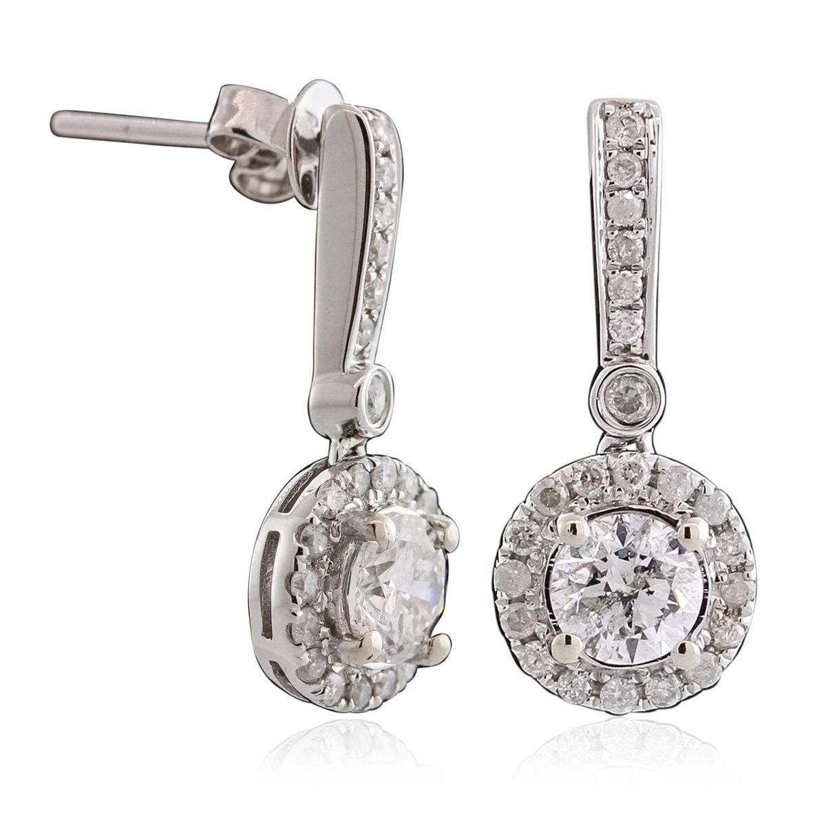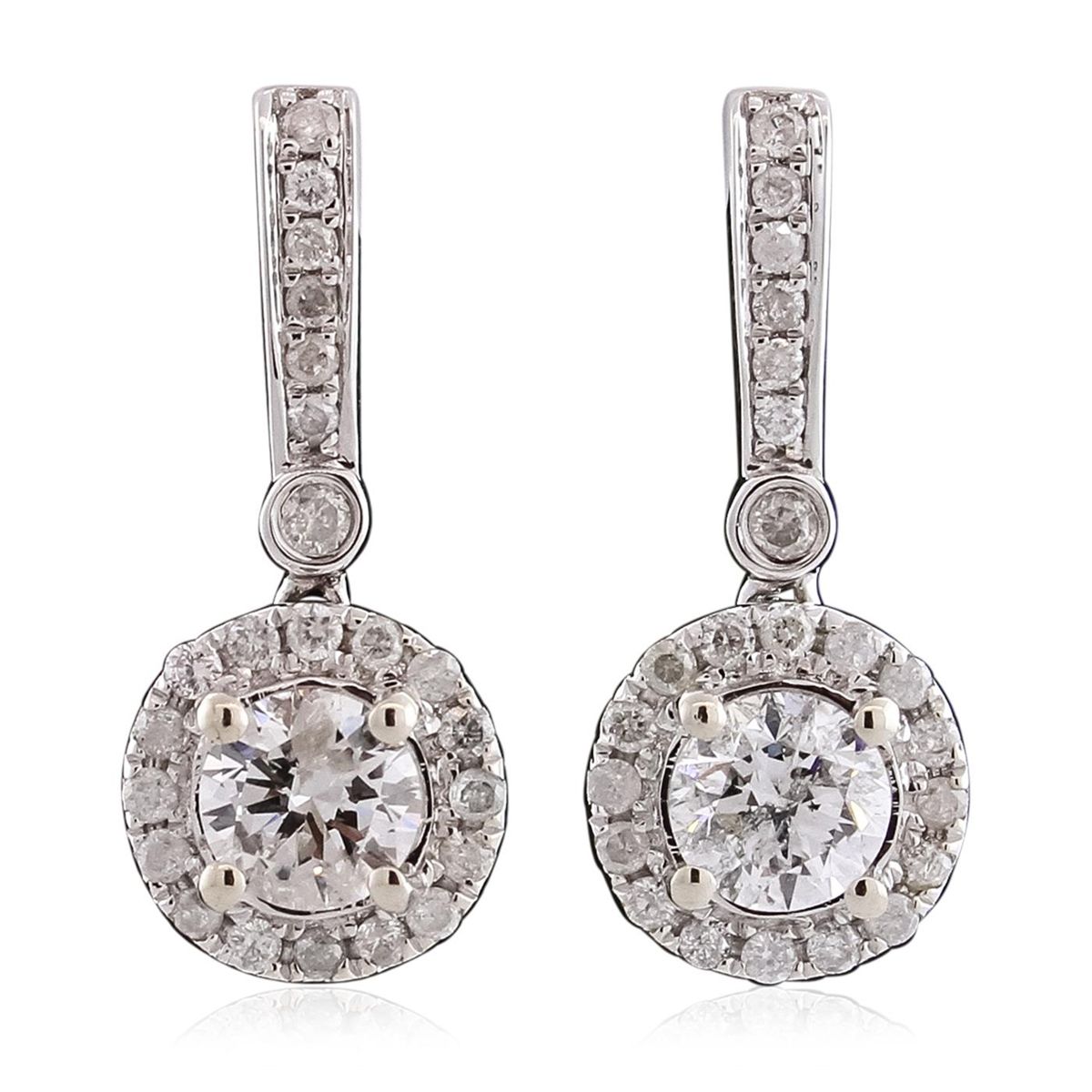 One pair electronically tested 14KT white gold ladies cast & assembled diamond dangle earring with standard backs. Bright polish finish. Trademark is Orianne. Identified with markings of "14K". Condition is new, good workmanship. Containing: Two prong set round brilliant cut diamonds, measuring 5.20 - 5.10 x 3.10mm (depth est.) approximate total weight of 2 Stones = 1.00ct. Graded in the setting. Clarity: I-1. Color: I Forty-Six prong set round brilliant cut diamonds, measuring 1.40 - 1.30 x 0.81mm (depth est.) approximate total weight of 46 Stones = 0.50ct. Graded in the setting. Clarity: I-2 to I-3. Color: H - J. Total Weight of Diamonds 1.50ct. Total Weight of Earring 3.79gm. AIG Appraised at $8,020.00.