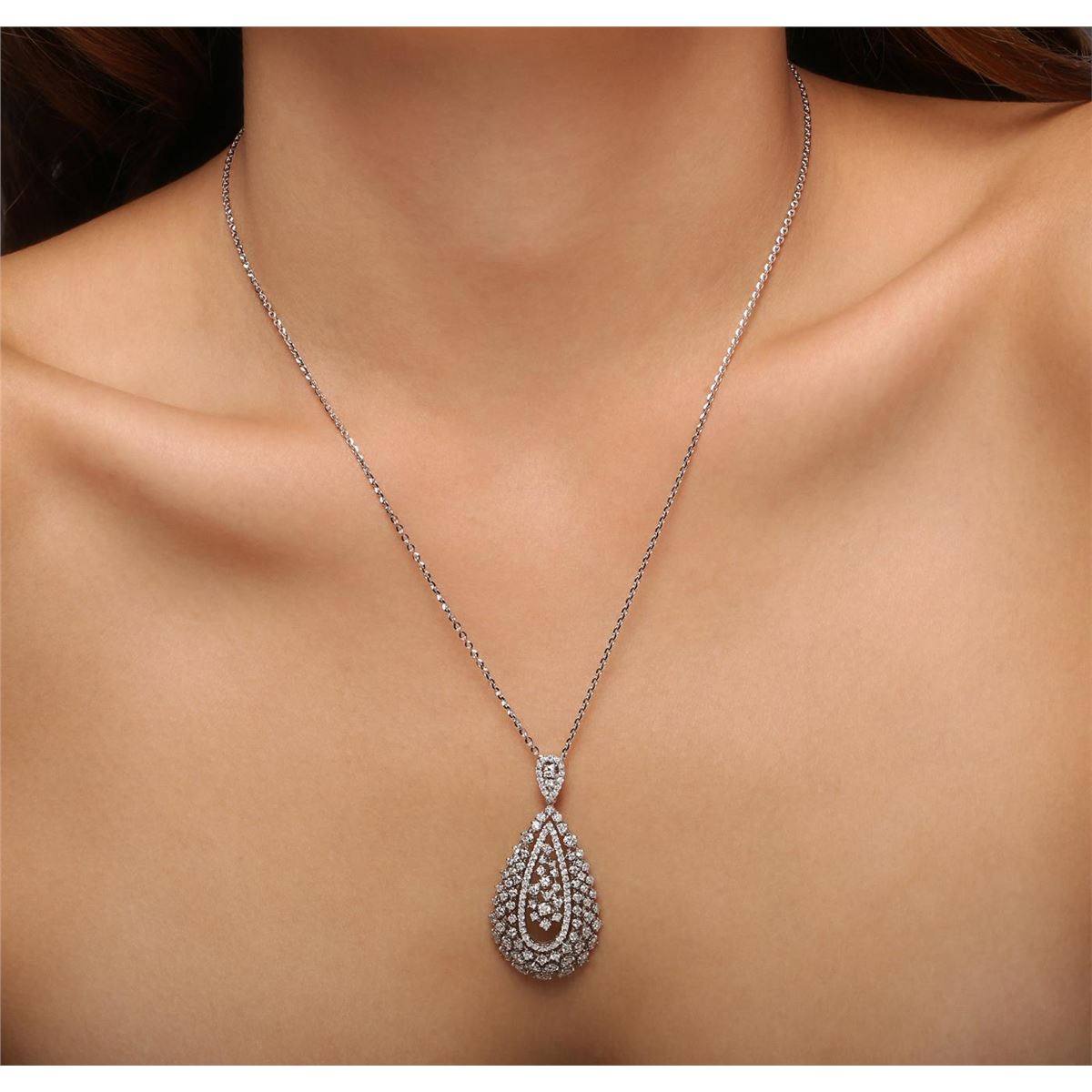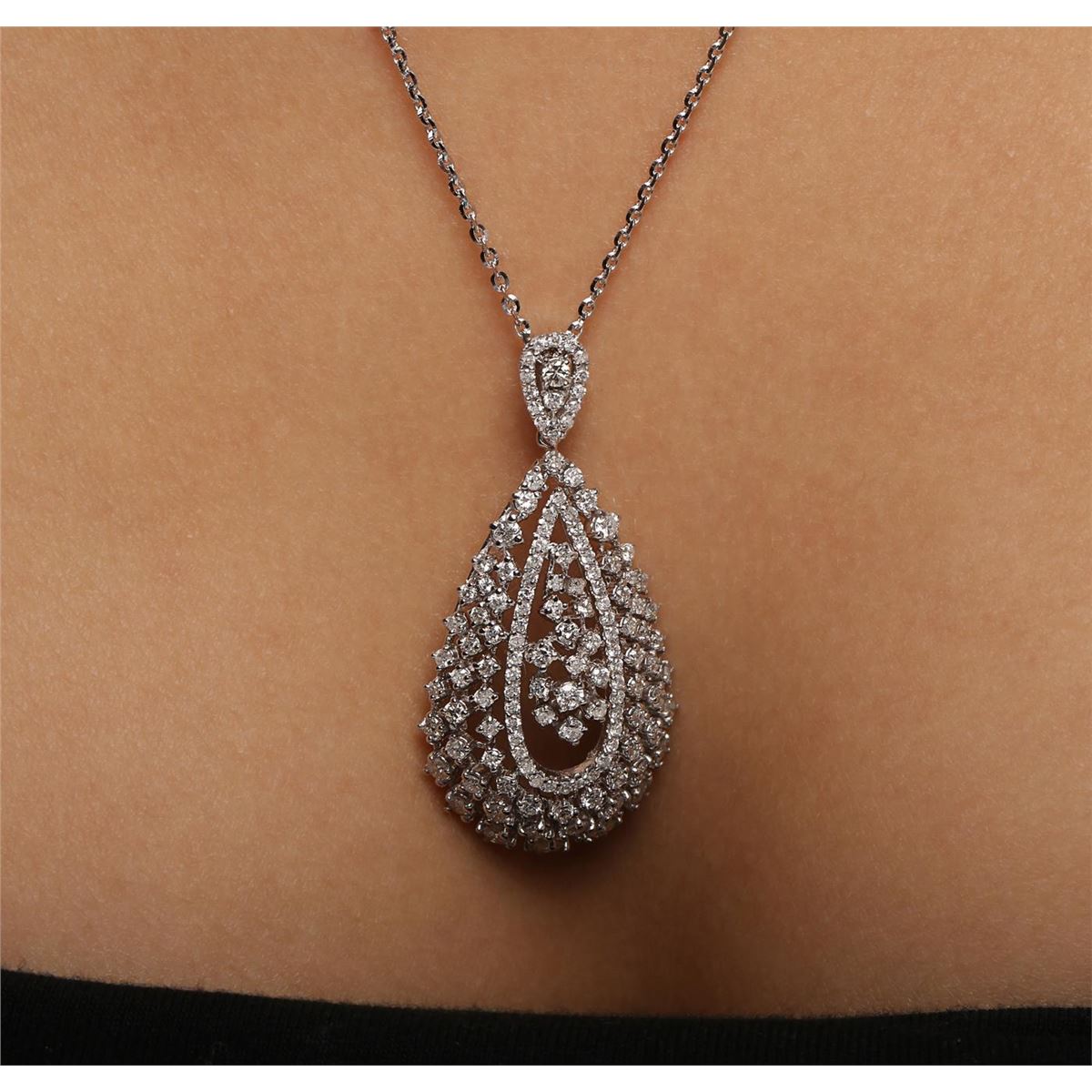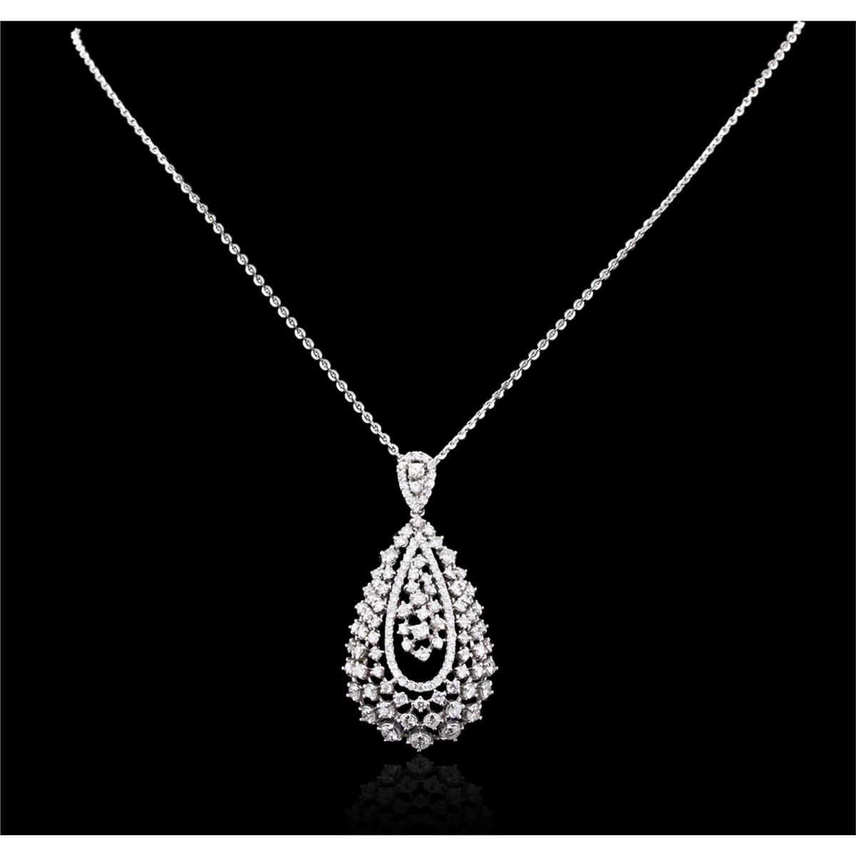 One electronically tested 14KT white gold ladies combination cast & assembled diamond pendant & chain 18.0" long, large cable link with a lobster claw clasp with a bright polish finish. Identified with markings of "K14". Condition is new. Containing: One Hundred Thirty-Three prong set round brilliant cut diamonds, measuring 2.10 - 1.10 x 0.96mm (depth est.) approximate total weight of 133 Stones = 1.50ct. Clarity: I-1 to I-2. Color: I - J, Cut is Good. All diamonds are graded in the mounting, unless otherwise stated. Total Weight of Diamonds 1.50ct. Total Weight of Pendant & Chain 9.20 grams. GGL Appraised at $5,350.00.