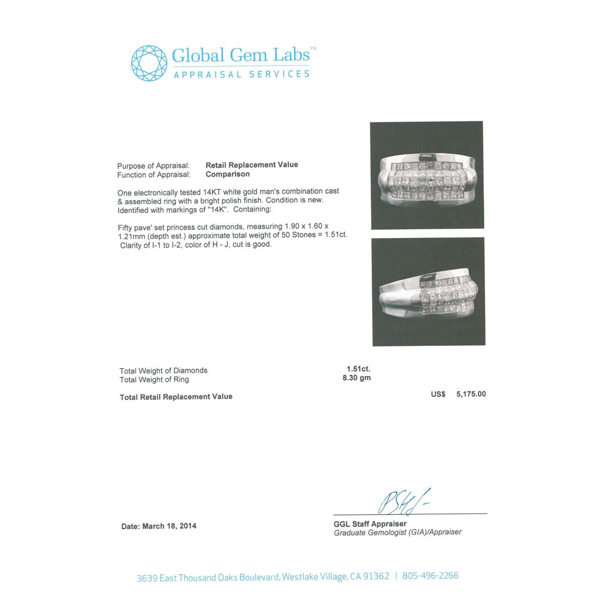 One electronically tested 14KT white gold man's combination cast & assembled ring with a bright polish finish. Condition is new. Identified with markings of "14K". Containing: Fifty pave' set princess cut diamonds, measuring 1.90 x 1.60 x 1.21mm (depth est.) approximate. Total Weight of 50 Stones = 1.51ct. Clarity: I-1 to I-2. Color: H - J, Cut is Good. Total Weight of Diamonds 1.51ct. Total Weight of Ring 8.30gm. GGL Appraised at $5,175.00.