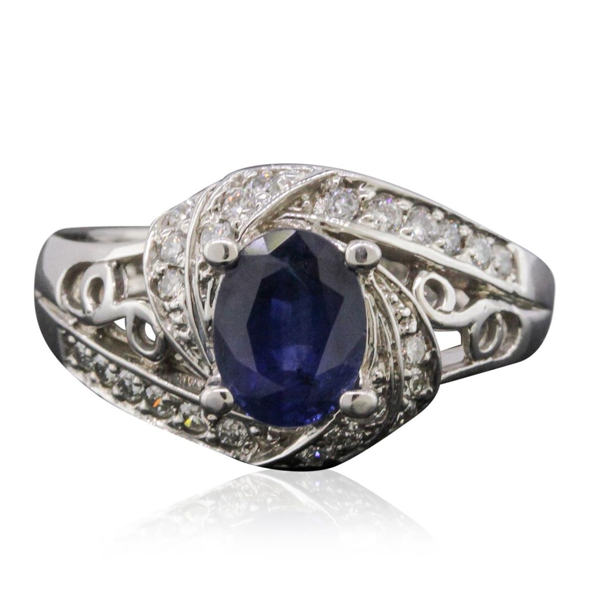 One electronically tested 14KT white gold ladies cast ring with a tapered shank with a bright polish finish. Identified with markings of "14K". Condition is new. Containing: One prong set oval modified brilliant cut natural blue sapphire, measuring 7.93 x 6.07 x 3.86mm, approximate weight of 1.51ct., clarity is heavily included, type II, medium dark, moderately strong, blue color, (GIA B 6/4), cut is good. Twenty-Four prong set round brilliant cut diamonds, measuring 1.50 - 1.50 x 0.90mm (depth est.) approximate total weight of 24 Stones = 0.30ct. Clarity: I-1 to I-2. Color: H - I, Cut is Good. Colored gemstones are presumed to have been subjected to commonly used enhancement processes, All diamonds and colored gemstones are graded in the mounting, unless otherwise stated. Total Weight of Colored Stones 1.51ct. Total Weight of Diamonds 0.30ct. Total Weight of Ring 6.00 grams. GGL Appraised at $3,290.00.