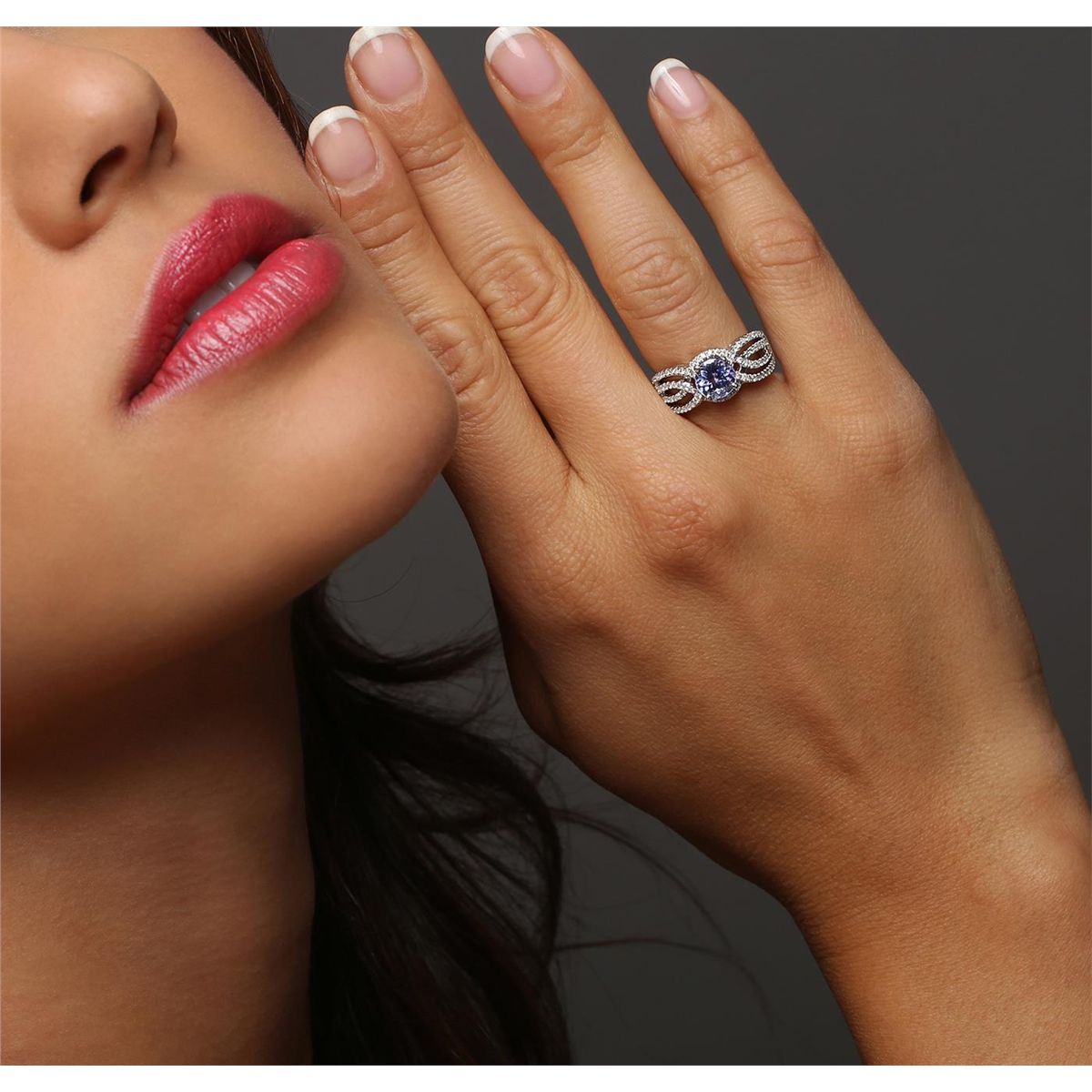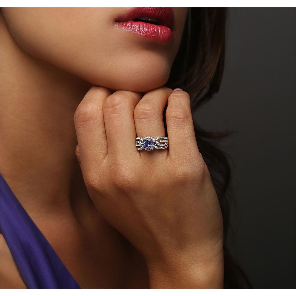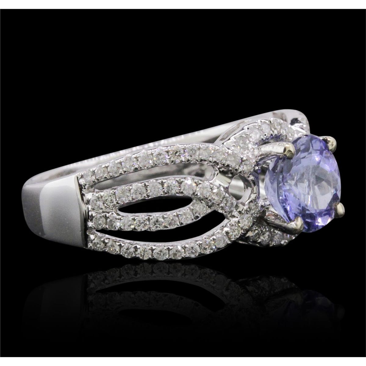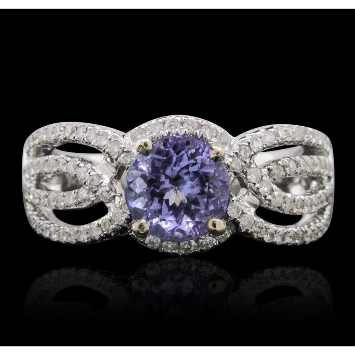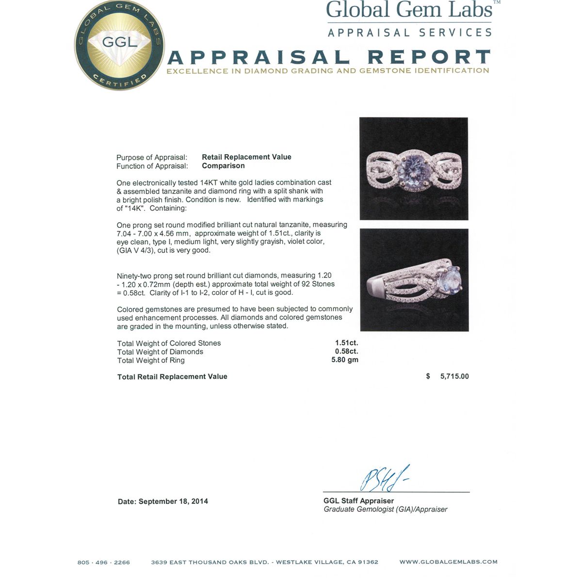 One electronically tested 14KT white gold ladies combination cast & assembled tanzanite and diamond ring with a split shank with a bright polish finish. Identified with markings of "14K". Condition is new. Containing: One prong set round modified brilliant cut natural tanzanite, measuring 7.04 - 7.00 x 4.56 mm, approximate weight of 1.51ct., clarity is eye clean, type I, medium light, very slightly grayish, violet color, (GIA V 4/3), cut is very good. Ninety-Two prong set round brilliant cut diamonds, measuring 1.20 - 1.20 x 0.72mm (depth est.) approximate total weight of 92 Stones = 0.58ct. Clarity: I-1 to I-2. Color: H - I, Cut is Good. Colored gemstones are presumed to have been subjected to commonly used enhancement processes. All diamonds and colored gemstones are graded in the mounting, unless otherwise stated. Total Weight of Colored Stones 1.51ct. Total Weight of Diamonds 0.58ct. Total Weight of Ring 5.80 grams. GGL Appraised at $5,715.00.