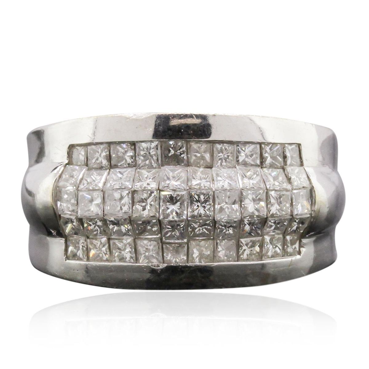 One electronically tested 14KT white gold man's combination cast & assembled ring with a bright polish finish. Condition is new. Identified with markings of "14K". Containing: Fifty pave' set princess cut diamonds, measuring 1.90 x 1.60 x 1.21mm (depth est.) approximate. Total Weight of 50 Stones = 1.51ct. Clarity: I-1 to I-2. Color: H - J, Cut is Good. Total Weight of Diamonds 1.51ct. Total Weight of Ring 8.30gm. GGL Appraised at $5,175.00.