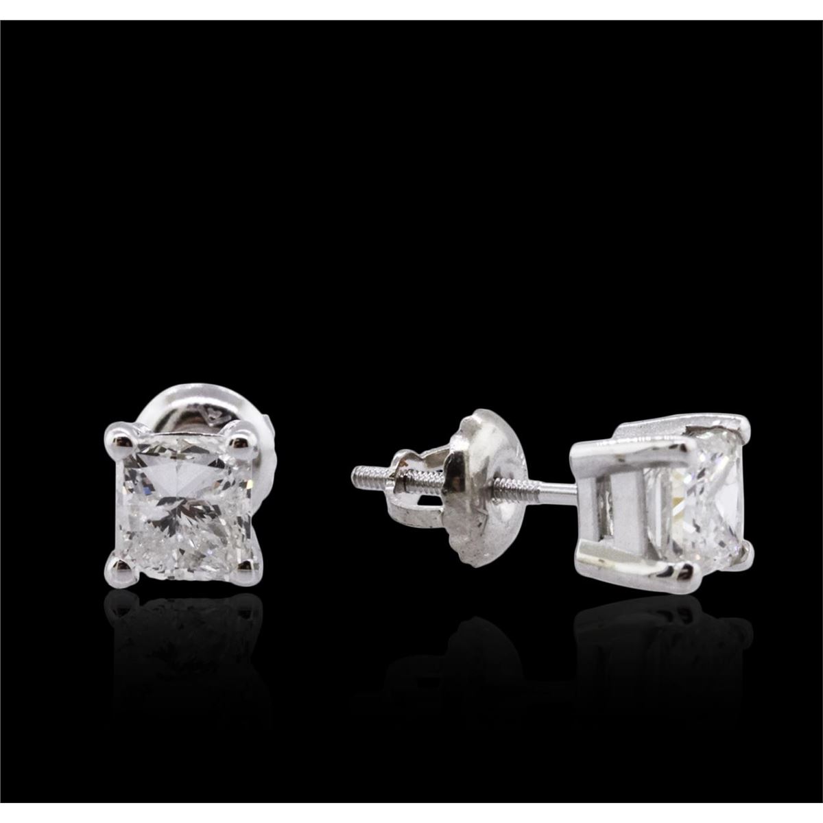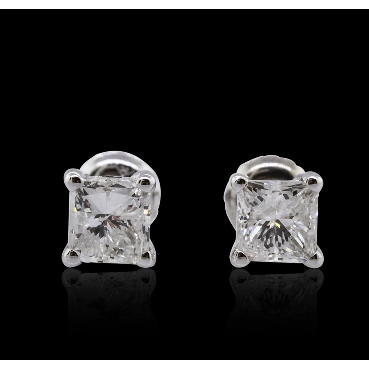One pair electronically tested 14KT white gold cast & assembled diamond solitaire earrings with screw backs. Bright polish finish. Condition is new, good workmanship. Containing: One prong set princess cut diamond, measuring 4.55 x 4.45 x 3.60mm (depth est.), 4.00.%. GTCF approximate weight of 0.72ct. Graded in the setting. Clarity: I-2. Color: 80.9%. Table 78.7%. One prong set princess cut diamond, measuring 4.70 x 4.50 x 3.90mm (depth est.), 4.00.%. GTCF approximate weight of 0.80ct with a faint blue fluorescence. Graded in the setting. Clarity: I-2. Color: 86.7%. Table 75.6%. Total Weight of Diamonds 1.52ct. Total Weight of Earrings 1.21 grams. AIG Appraised at $4,680.00.