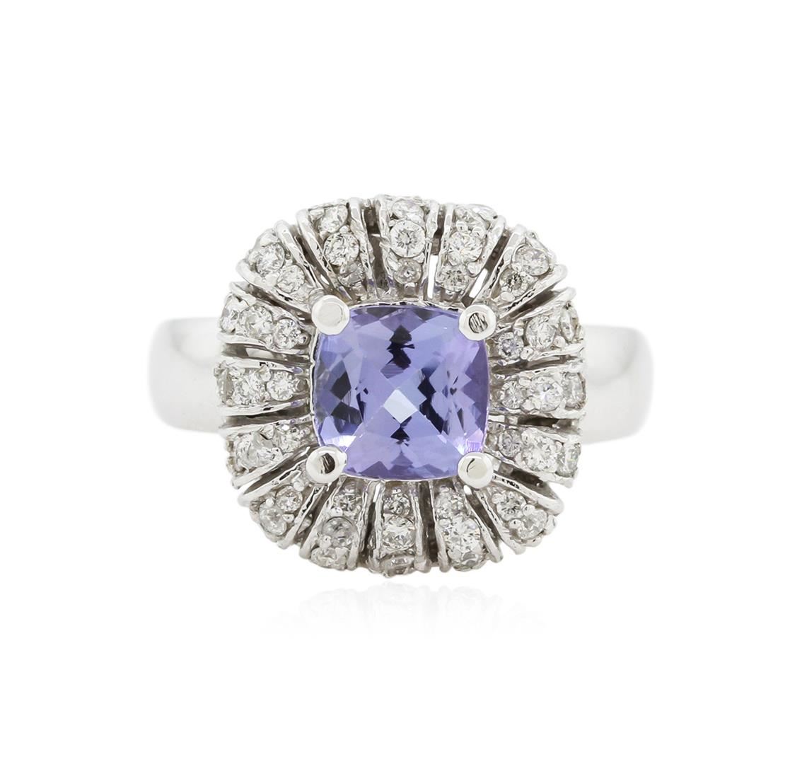 One electronically tested 14KT white gold ladies cast tanzanite and diamond ring with a bright polish finish. Condition is new. Containing: One prong set square cushion modified brilliant cut natural tanzanite, measuring 6.80 x 6.80 x 4.42mm, approximate weight of 1.52ct., clarity is eye clean, type I, light, very slightly grayish, violet color, (GIA V 3/3), cut is good. Sixty-Four prong set round brilliant cut diamonds, measuring 1.30 - 1.30 x 0.78mm (depth est.) approximate total weight of 64 Stones = 0.58ct. Clarity: SI-2 to I-1. Color: I - J, Cut is Good. Colored gemstones are presumed to have been subjected to commonly used enhancement processes. All diamonds and colored gemstones are graded in the mounting, unless otherwise stated. Total Weight of Colored Stones 1.52ct. Total Weight of Diamonds 0.58ct. Total Weight of Ring 6.20 grams. GGL Appraised at $2,870.00.