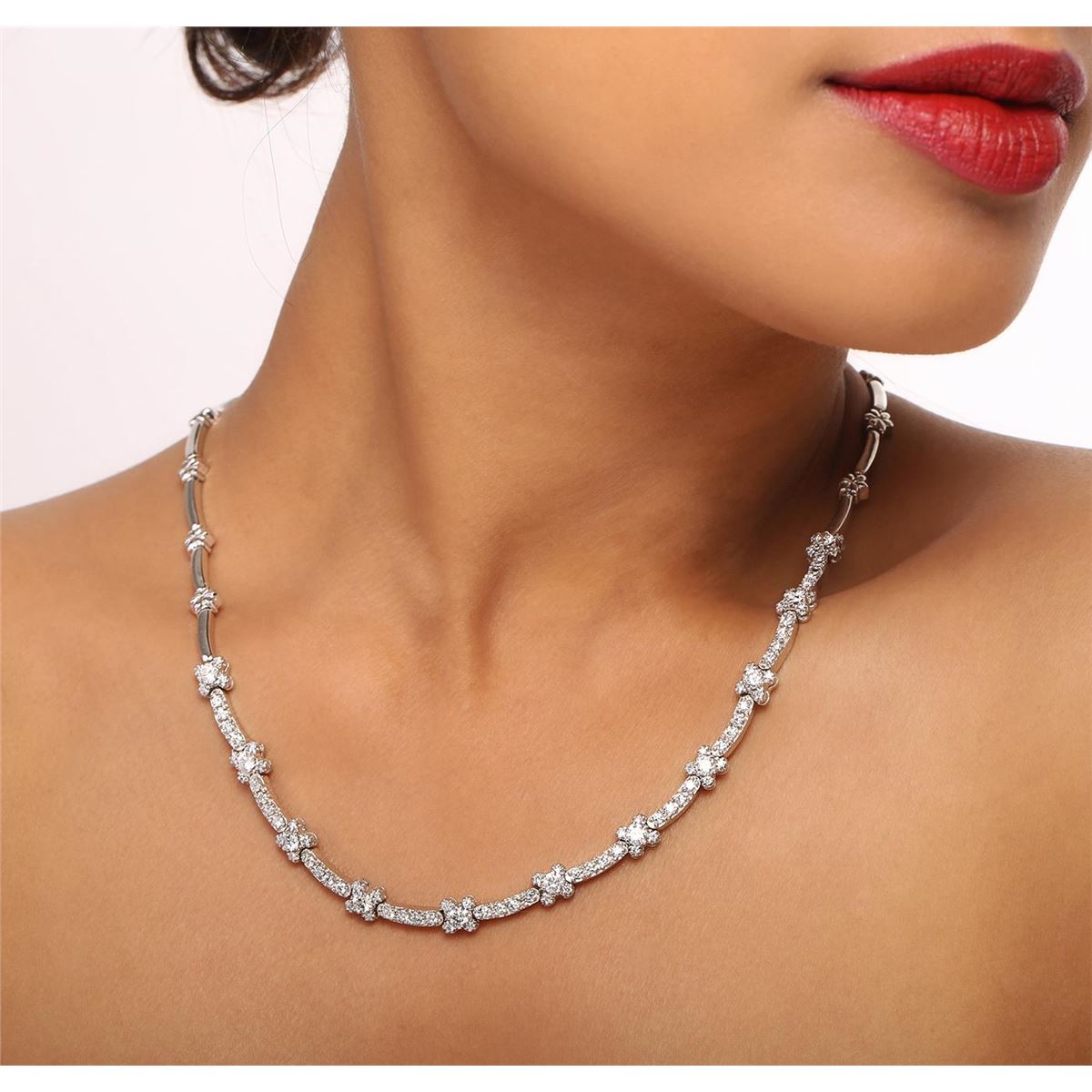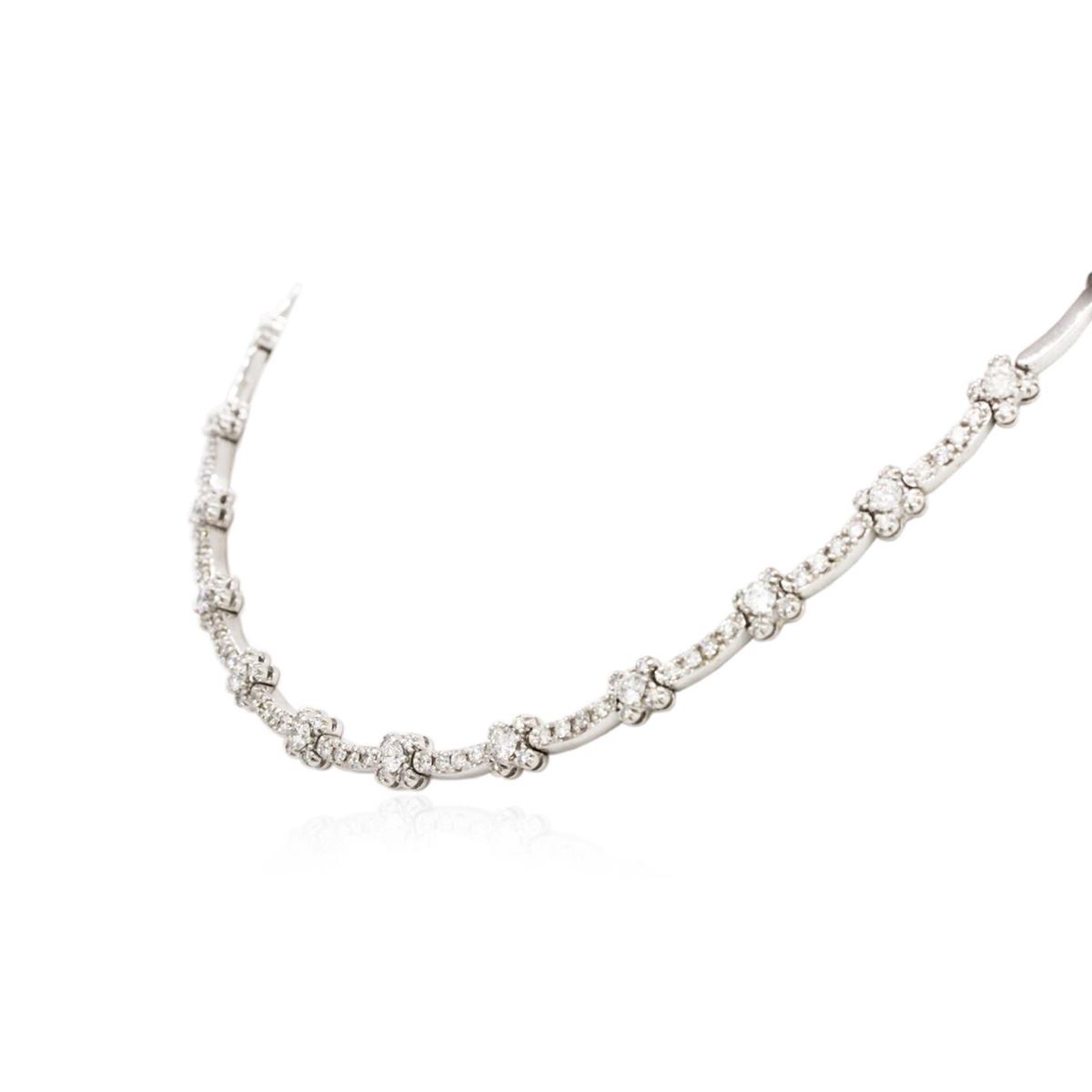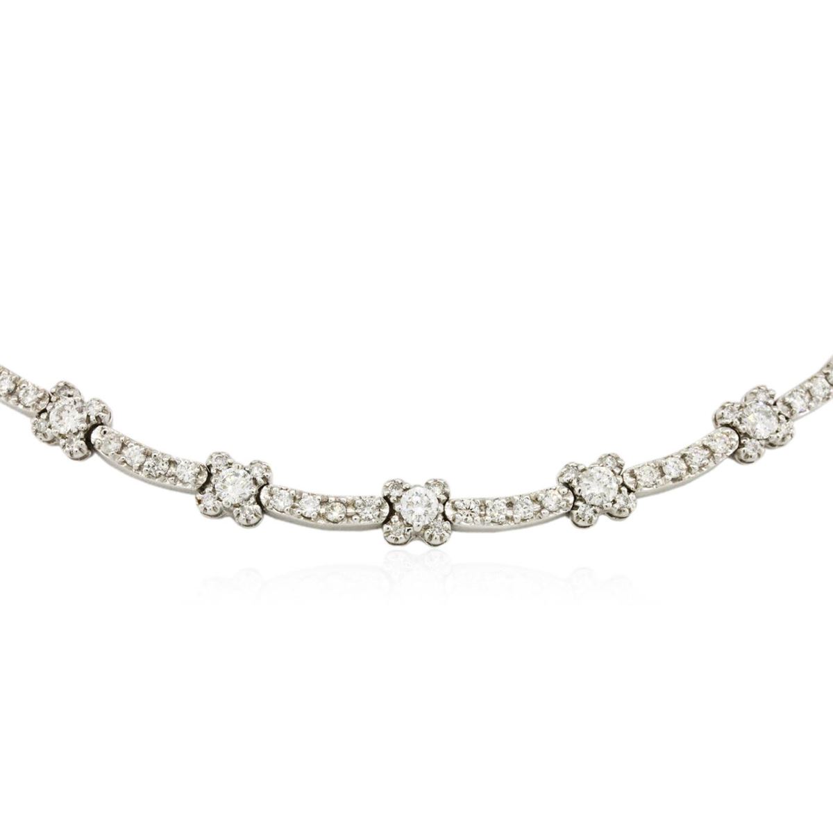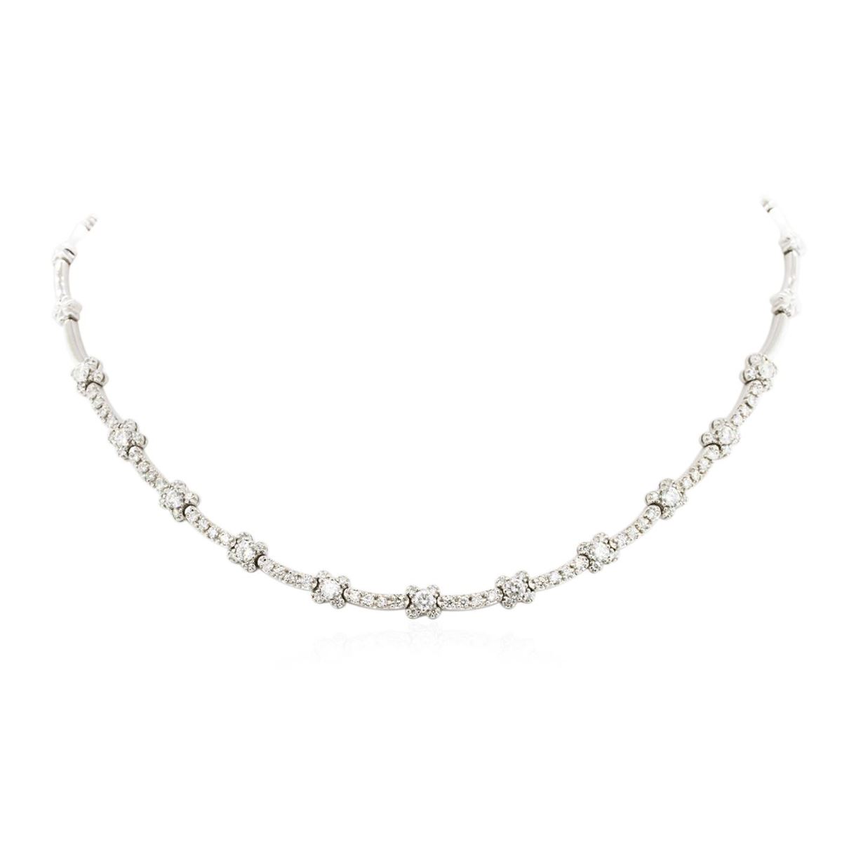 One electronically tested 14KT white gold ladies combination cast & assembled necklace with a hidden box clasp with a bright polish finish. Condition is new. Measurements: 16" in length. Identified with markings of "14K". Containing: Eleven prong set round brilliant cut diamonds, measuring 2.30 - 2.30 x 1.38mm (depth est.) approximate. Total Weight of 11 Stones = 0.49ct. Clarity: SI-1 to I-1. Color: G - H, Cut is Good. Eighty-Four prong set round brilliant cut diamonds, measuring 1.50 - 1.50 x 0.90mm (depth est.) approximate. Total Weight of 84 Stones = 1.03ct. Clarity: SI-1 to I-1. Color: G - H, Cut is Good. All diamonds are graded in the mounting, unless otherwise stated. Total Weight of Diamonds 1.52ct. Total Weight of Necklace 28.60 grams. GGL Appraised at $14,675.00.