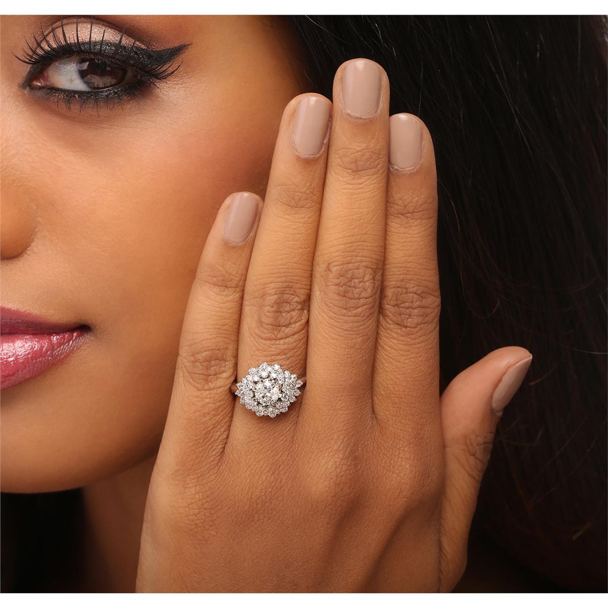 One electronically tested 14KT white gold ladies combination cast & assembled engagement ring with a bright polish finish. Condition is new. Identified with markings of "K14". Containing: One prong set round brilliant cut diamond, measuring 5.55 - 5.53 x 3.32mm (depth est.) approximate weight of 0.62ct. Clarity: I-2. Color: J, Cut is Good. Forty-Two prong set round brilliant cut diamonds, measuring 1.80 - 1.80 x 1.08mm (depth est.) approximate. Total Weight of 42 Stones = 0.90ct. Clarity: I-1 to I-2. Color: I - J, Cut is Good. All diamonds are graded in the mounting, unless otherwise stated. Total Weight of Diamonds 1.52ct. Total Weight of Ring 4.90 grams. GGL Appraised at $5,830.00.