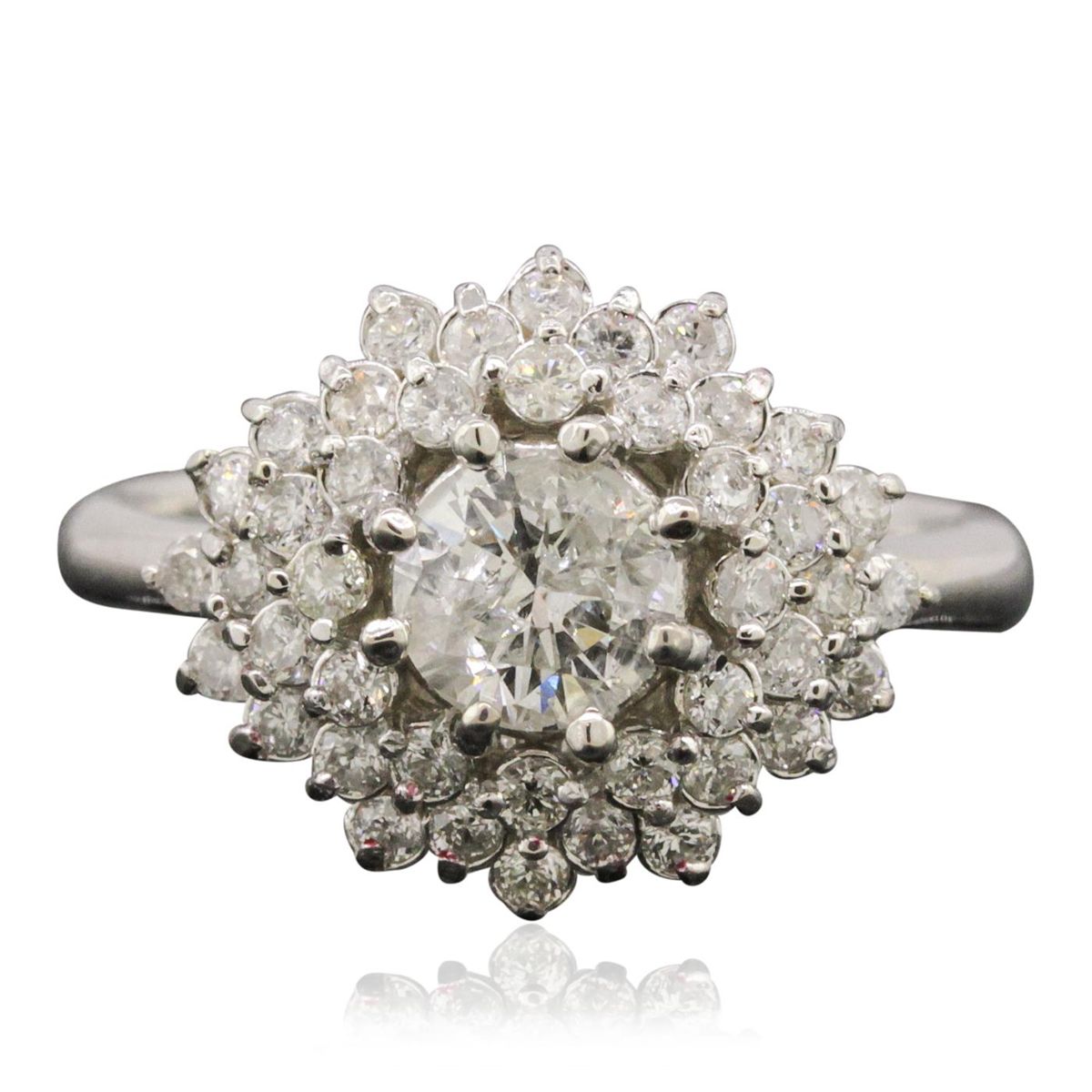 One electronically tested 14KT white gold ladies combination cast & assembled engagement ring with a bright polish finish. Condition is new. Identified with markings of "K14". Containing: One prong set round brilliant cut diamond, measuring 5.55 - 5.53 x 3.32mm (depth est.) approximate weight of 0.62ct. Clarity: I-2. Color: J, Cut is Good. Forty-Two prong set round brilliant cut diamonds, measuring 1.80 - 1.80 x 1.08mm (depth est.) approximate. Total Weight of 42 Stones = 0.90ct. Clarity: I-1 to I-2. Color: I - J, Cut is Good. All diamonds are graded in the mounting, unless otherwise stated. Total Weight of Diamonds 1.52ct. Total Weight of Ring 4.90 grams. GGL Appraised at $5,830.00.