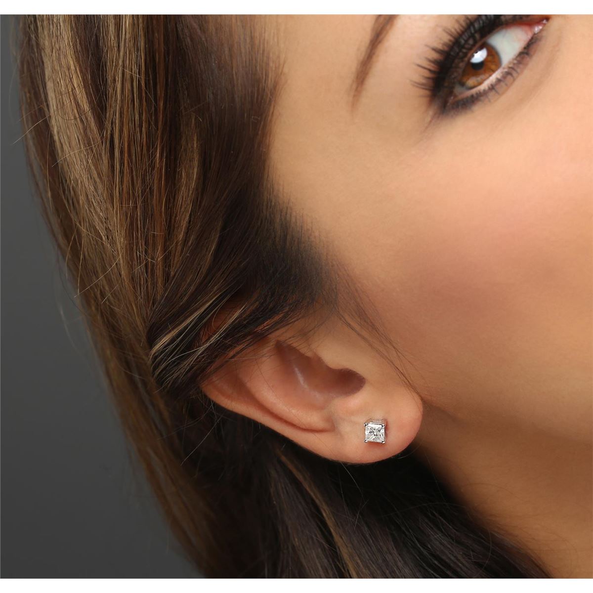 One pair electronically tested 14KT white gold cast & assembled diamond solitaire earrings with screw backs. Bright polish finish. Condition is new, good workmanship. Containing: One prong set princess cut diamond, measuring 4.55 x 4.45 x 3.60mm (depth est.), 4.00.%. GTCF approximate weight of 0.72ct. Graded in the setting. Clarity: I-2. Color: 80.9%. Table 78.7%. One prong set princess cut diamond, measuring 4.70 x 4.50 x 3.90mm (depth est.), 4.00.%. GTCF approximate weight of 0.80ct with a faint blue fluorescence. Graded in the setting. Clarity: I-2. Color: 86.7%. Table 75.6%. Total Weight of Diamonds 1.52ct. Total Weight of Earrings 1.21 grams. AIG Appraised at $4,680.00.