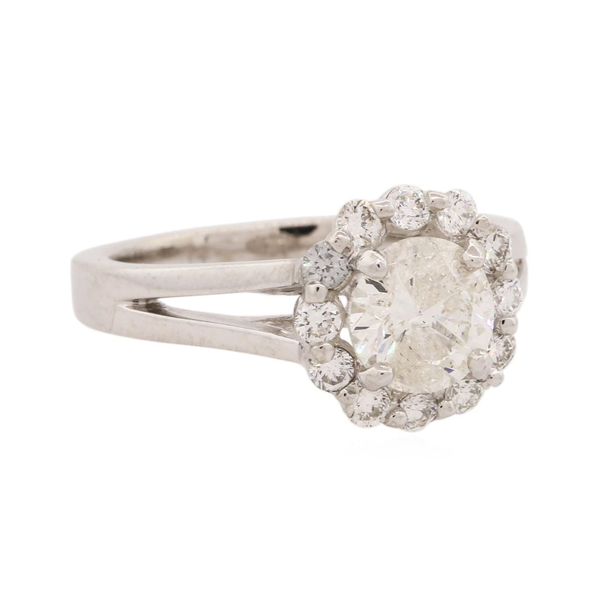 One electronically tested 14KT white gold Ladies combination cast & assembled engagement ring with a bright polish finish. Condition is very good. Identified with markings of "14K". Containing: One prong set round brilliant cut diamond, measuring 6.50 - 6.50 x 4.27mm (depth est.) approximate weight of 1.07ct. Clarity: I-3. Color: K, Cut is Good. Fourteen bead set round brilliant cut diamonds, measuring 1.80 - 1.80 x 1.08mm (depth est.) approximate. Total Weight of 14 Stones = 0.46ct. Clarity: SI-1 to SI-2. Color: H - I, Cut is Good. Diamonds graded in the mounting. Total Weight of Diamonds 1.53ct. Total Weight of Ring 3.90 grams. GGL Appraised at $6,870.00.
