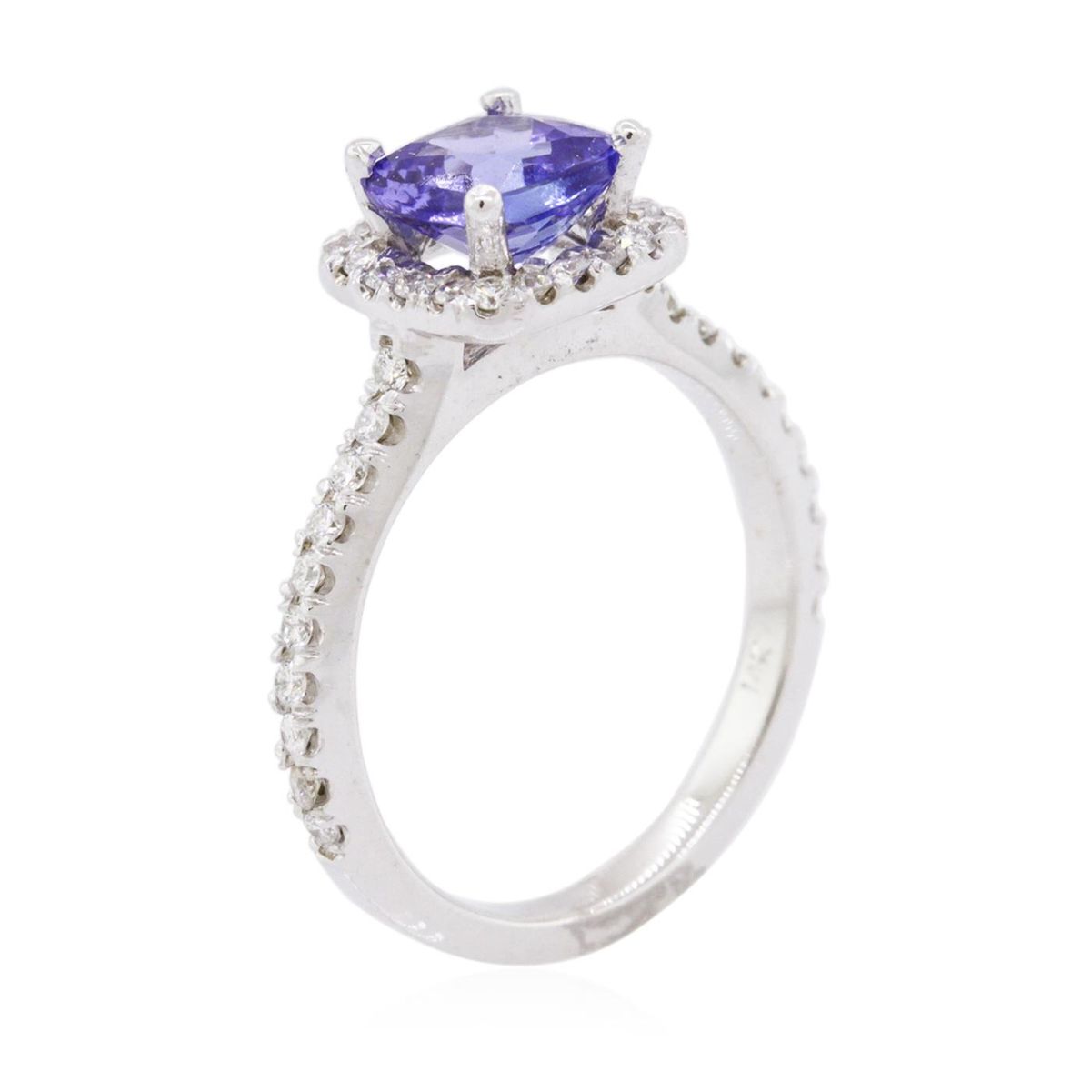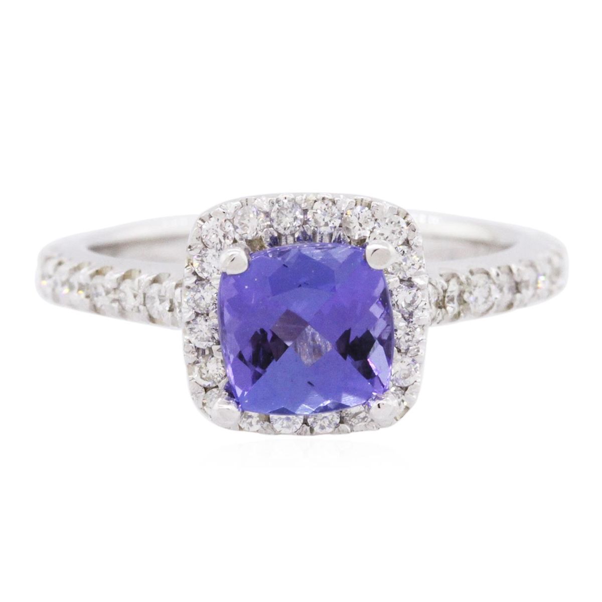 One electronically tested 14KT white gold ladies cast tanzanite & diamond ring with a bright finish. The featured tanzanite is set within a diamond bezel, supported by diamond set shoulders, completed by a two millimeter wide band. Identified with markings of "14K". Condition is new, good workmanship. Containing: One prong set square cushion brilliant cut natural tanzanite, measuring 6.50 x 6.50 x 4.25mm, 8% bulge factor, approximate weight of 1.53ct., clarity is eye clean, type I, medium dark, moderately strong, violetish blue color, (GIA vB 6/4), cut is good. Transmitting light with no distortion, transparent. Graded in the setting. Tanzanite is a very rare gemstone that is only found in the country of Tanzania. Originally discovered in 1967. Tiffany & Company, named the stone Tanzanite. It is found in the Usumburu Mountains that border the Umba Valley of northern Tanzania. Tanzanite occurs in gray, brown, violet, blue, reddish-purple, & green. The gem is interesting because of its exceptional pleochroism. Rotated in different directions a tanzanite will exhibit multiple changes of color. Tanzanite has a low tolerance to ultrasonic cleaning, and should not be cleaned using this method. Forty prong set round brilliant cut diamonds, measuring 1.40 - 1.35 x 0.83mm (depth est.) approximate total weight of 40 Stones = 0.38ct. Graded in the setting. Clarity: SI-2 to I-1. Color: G - I. Total Weight of Colored Stones 1.53ct. Total Weight of Diamonds 0.38ct. Total Weight of Ring 3.97 grams. AIG Appraised at $4,880.00.