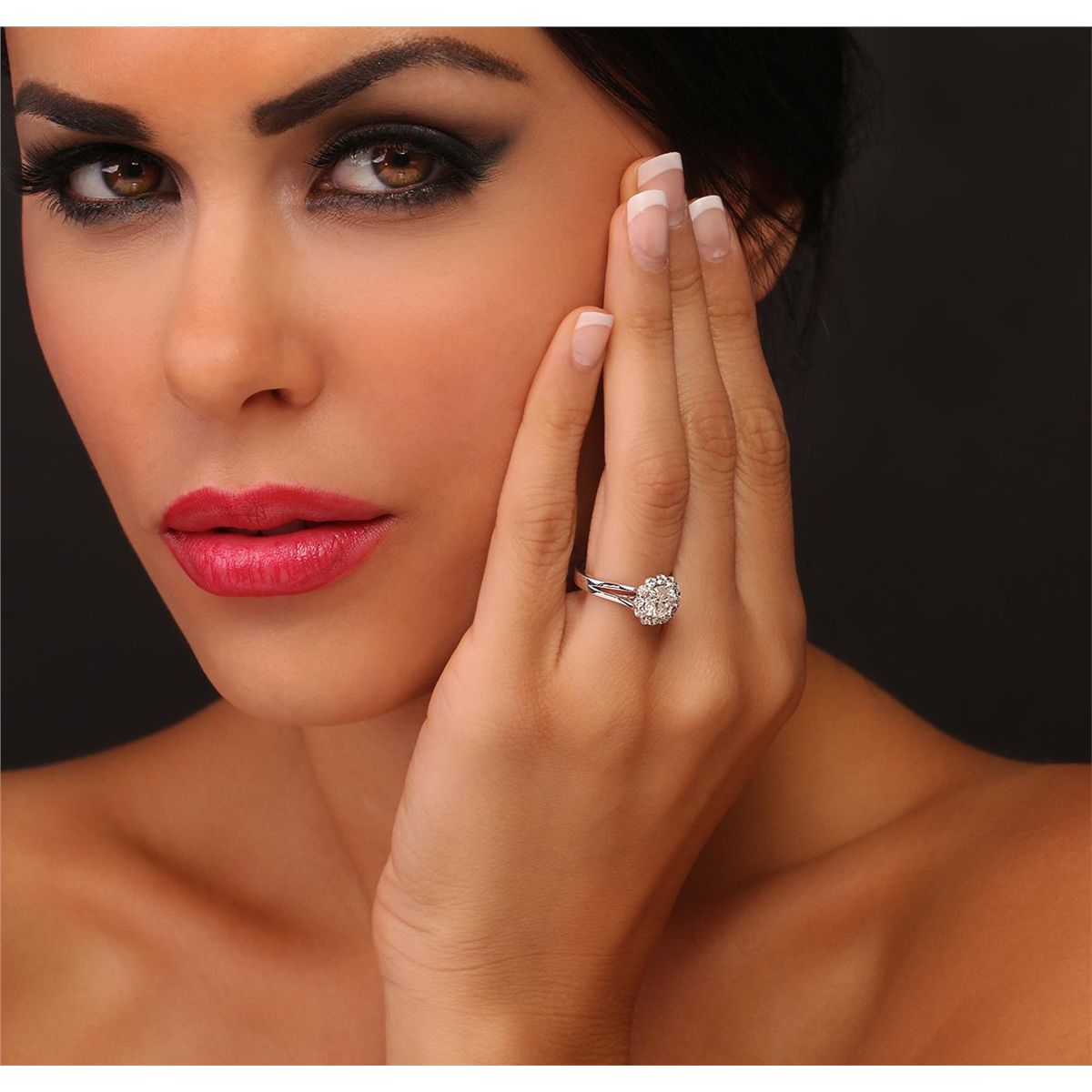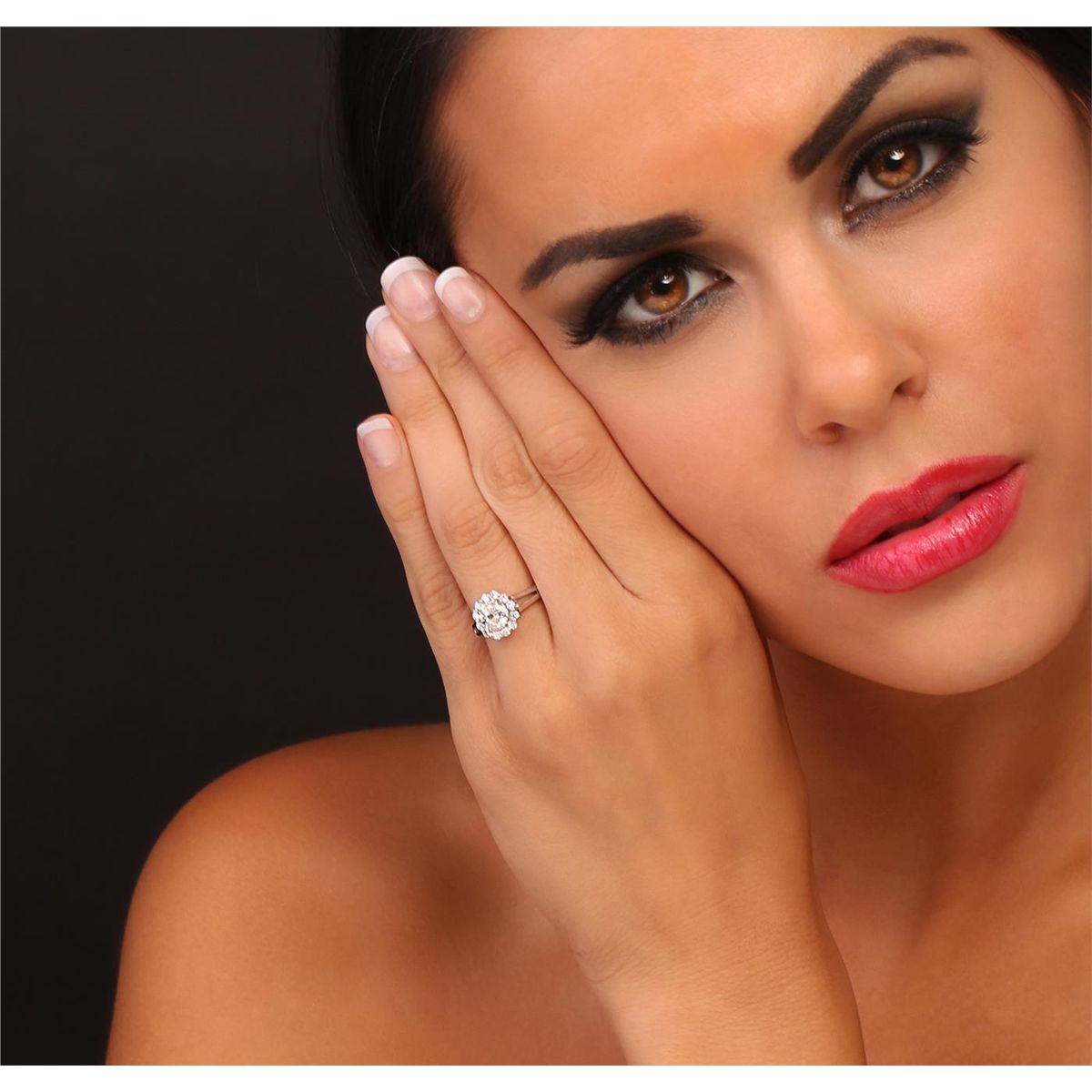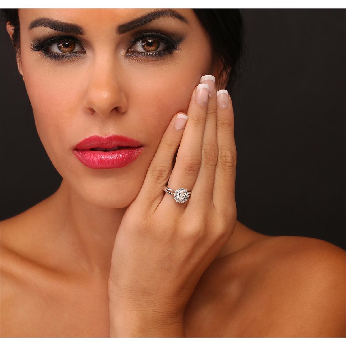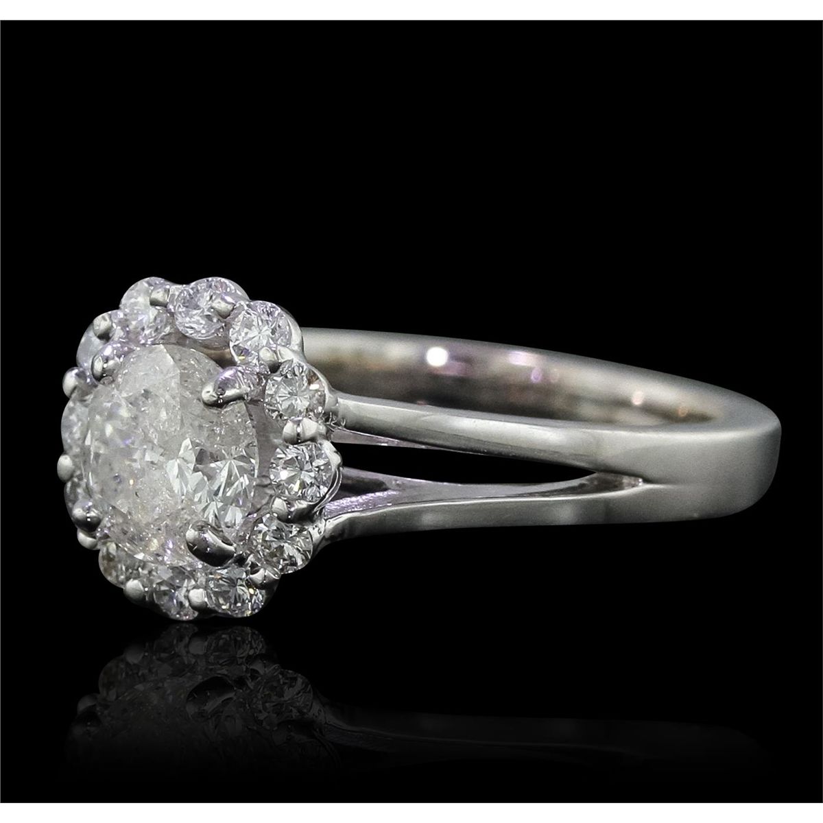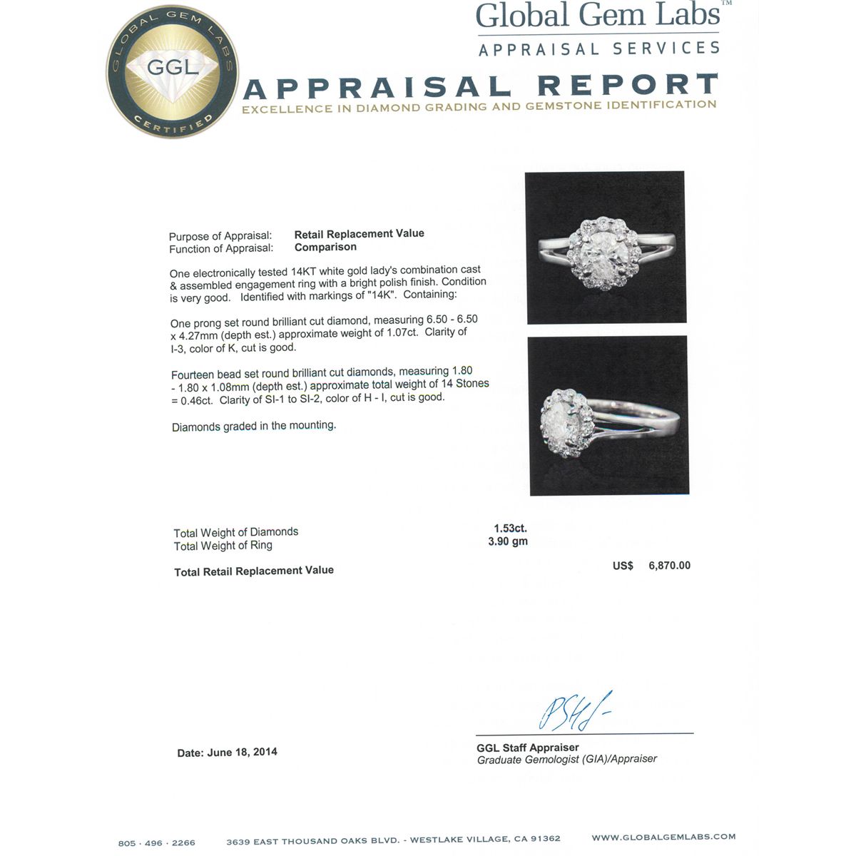 One electronically tested 14KT white gold Ladies combination cast & assembled engagement ring with a bright polish finish. Condition is very good. Identified with markings of "14K". Containing: One prong set round brilliant cut diamond, measuring 6.50 - 6.50 x 4.27mm (depth est.) approximate weight of 1.07ct. Clarity: I-3. Color: K, Cut is Good. Fourteen bead set round brilliant cut diamonds, measuring 1.80 - 1.80 x 1.08mm (depth est.) approximate. Total Weight of 14 Stones = 0.46ct. Clarity: SI-1 to SI-2. Color: H - I, Cut is Good. Diamonds graded in the mounting. Total Weight of Diamonds 1.53ct. Total Weight of Ring 3.90 grams. GGL Appraised at $6,870.00.