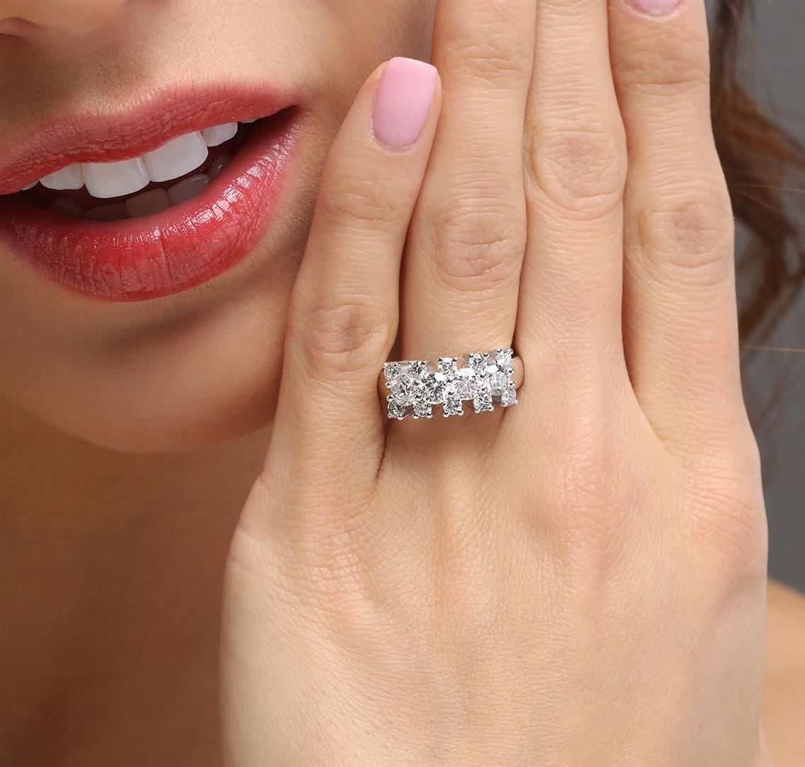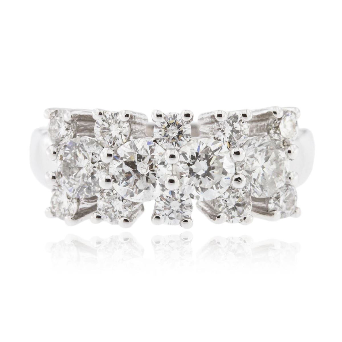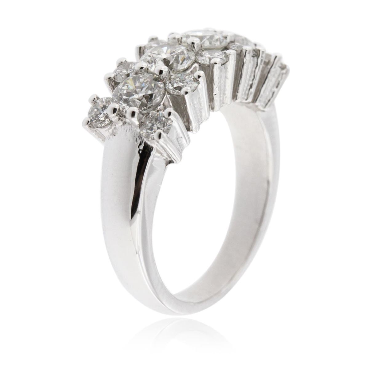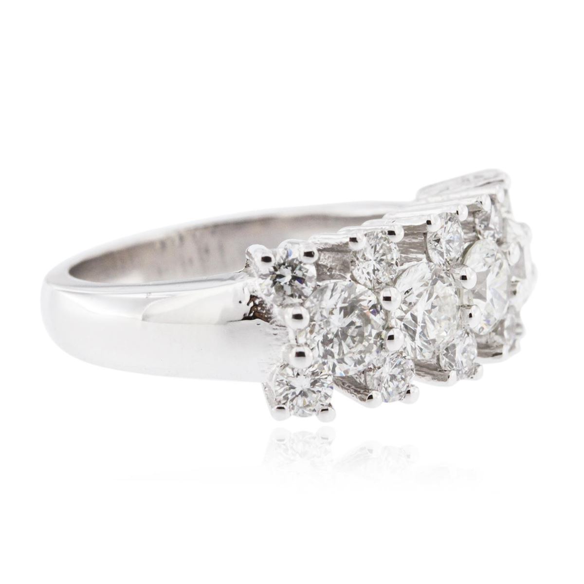One electronically tested 14KT white gold ladies cast diamond ring with a bright polish finish. Identified with markings of "14K". Condition is new. Containing: Four prong set round brilliant cut diamonds, measuring 4.20 - 4.20 x 2.54mm (depth est.) approximate total weight of 4 Stones = 1.09ct. Clarity: SI-2. Color: J. Ten prong set round brilliant cut diamonds, measuring 2.30 - 2.30 x 1.38mm (depth est.) approximate total weight of 10 Stones = 0.45ct. Clarity: SI-1 to I-1. Color: I - J. All diamonds are graded in the mounting, unless otherwise stated. Total Weight of Diamonds 1.54ct. Total Weight of Ring 7.30 grams. GGL Appraised at $7,020.00.
