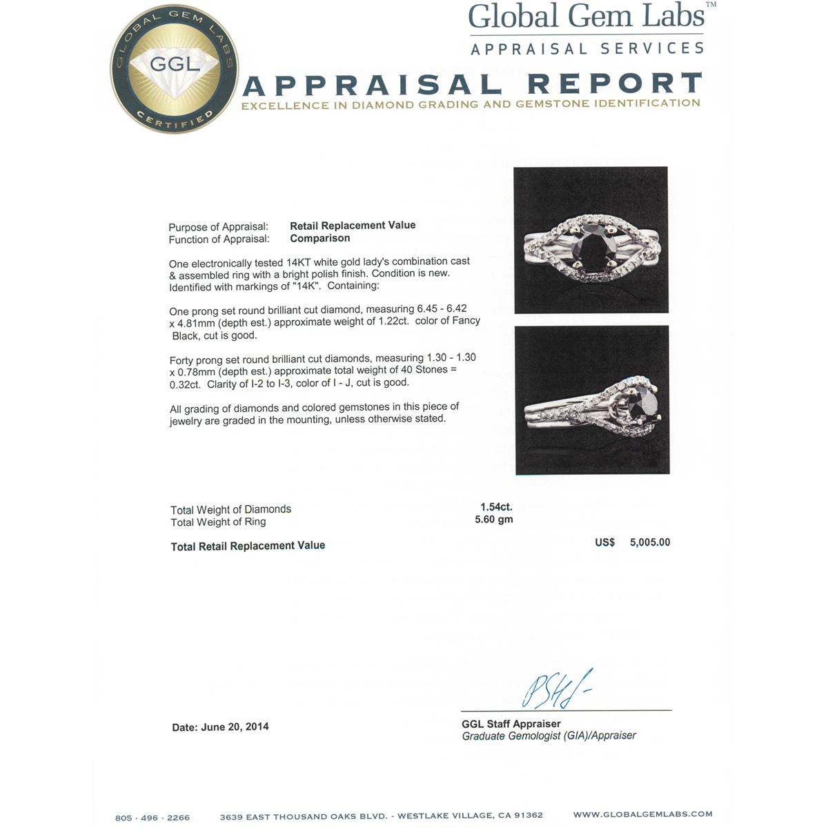 One electronically tested 14KT white gold Ladies combination cast & assembled ring with a bright polish finish. Condition is new. Identified with markings of "14K". Containing: One prong set round brilliant cut diamond, measuring 6.45 - 6.42 x 4.81mm (depth est.) approximate weight of 1.22ct. Cut is Good. Forty prong set round brilliant cut diamonds, measuring 1.30 - 1.30 x 0.78mm (depth est.) approximate. Total Weight of 40 Stones = 0.32ct. Clarity: I-2 to I-3. Color: I - J, Cut is Good. All grading of diamonds and colored gemstones in this piece of jewelry are graded in the mounting, unless otherwise stated. Total Weight of Diamonds 1.54ct. Total Weight of Ring 5.60 grams. GGL Appraised at $5,005.00.